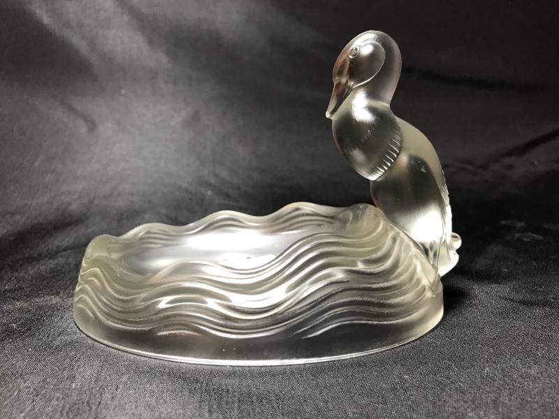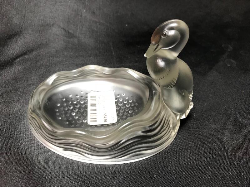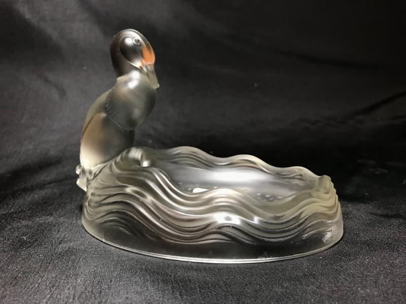 Cute vintage Verlys France "Le Canard" low dish with duck figuring on side. In frosted glass. Excellent condition. 6" x 4" x 4 1/2"H