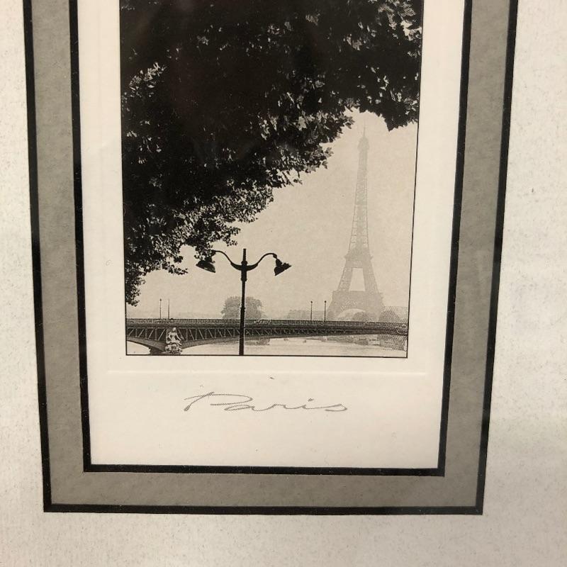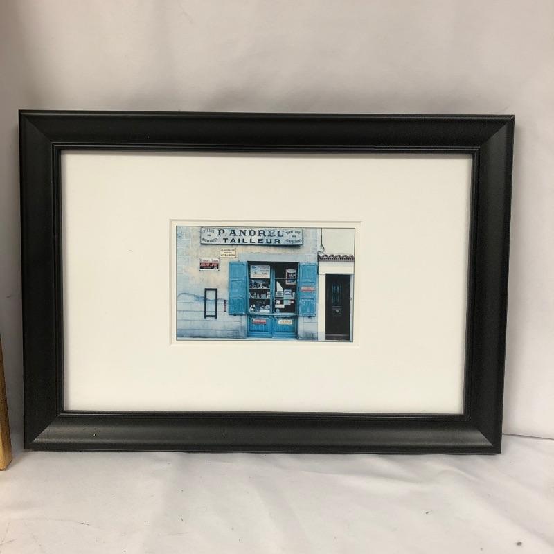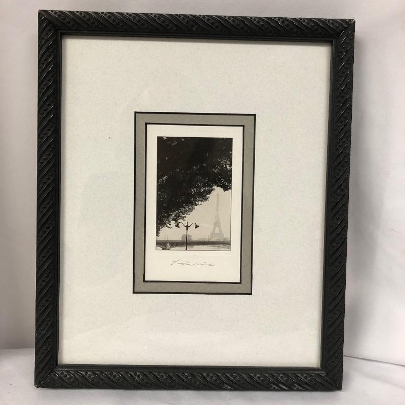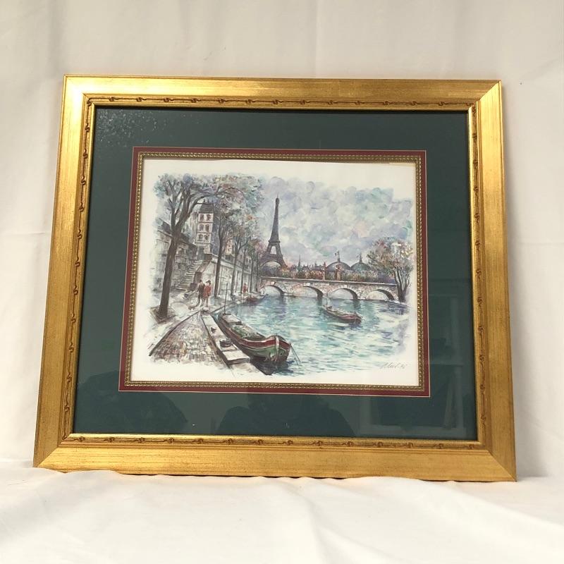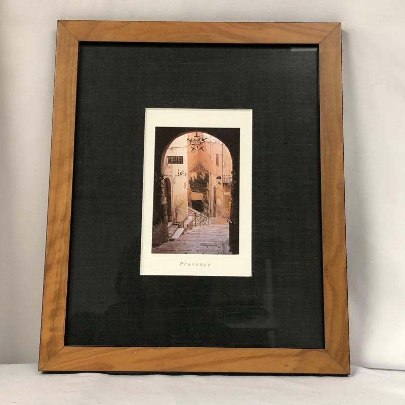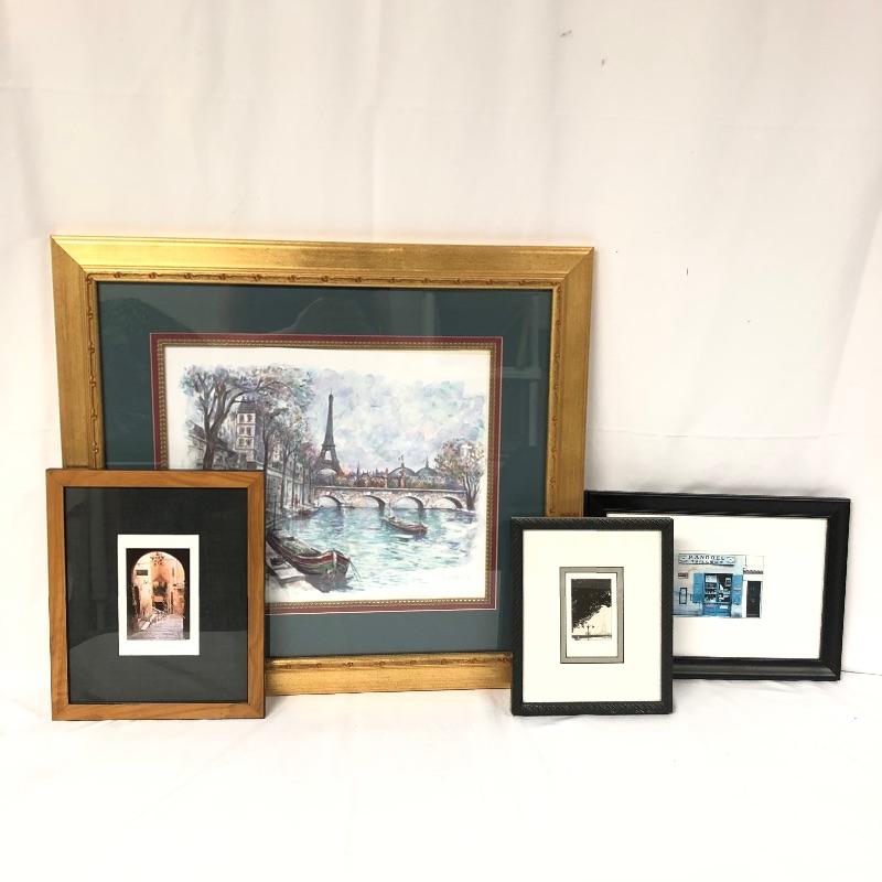 Four pieces in this lot celebrating France. The largest print is a signed watercolor that is matted and mounted in a gilded frame that measures 23” x 25”. The wooden frame holds a photo of Provence, the smallest black frame is a print of the Eiffel Tower.