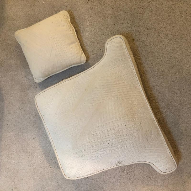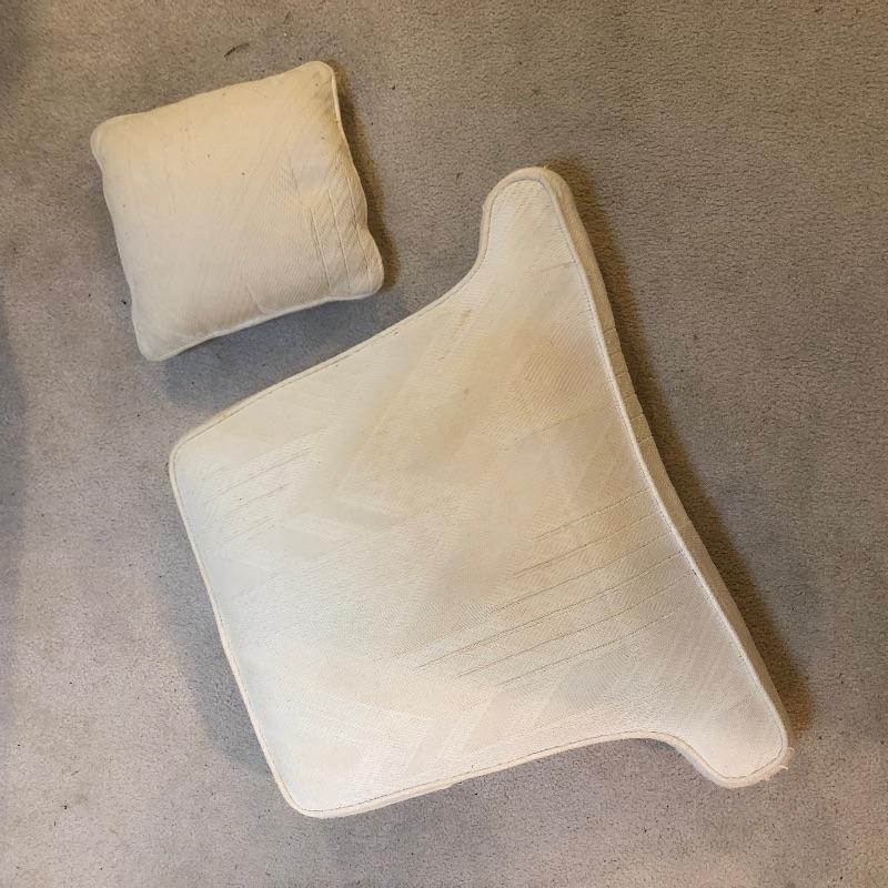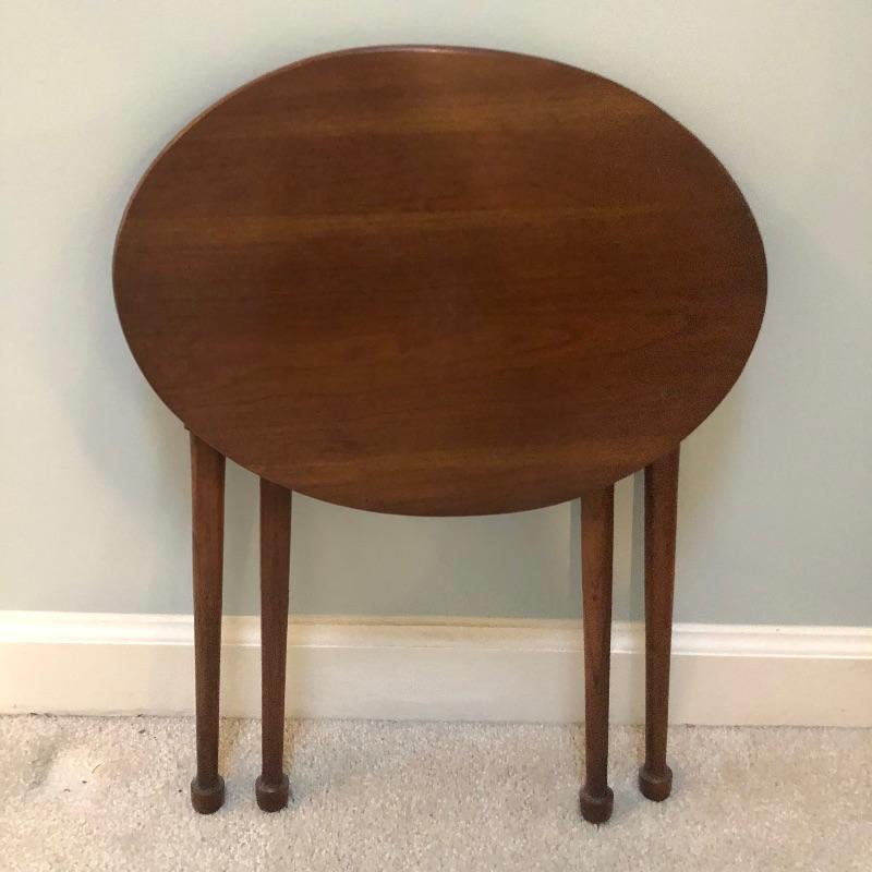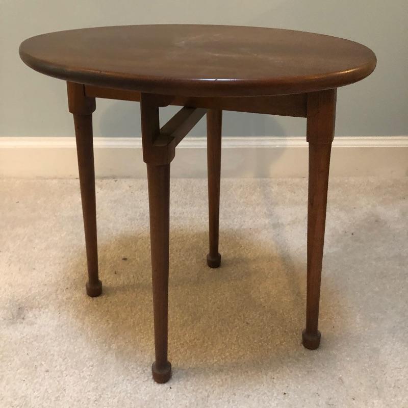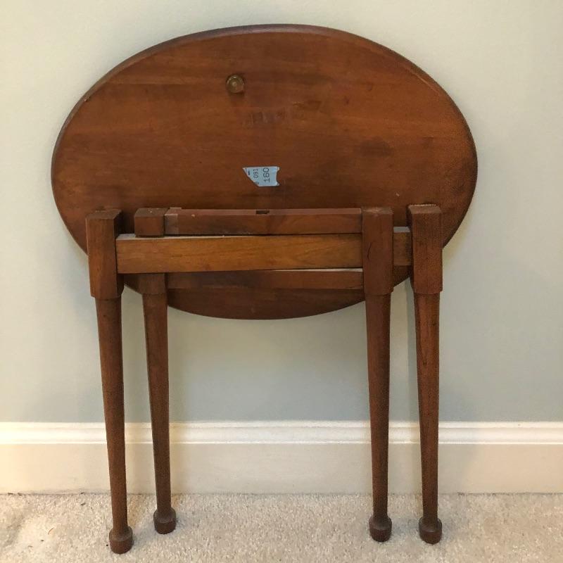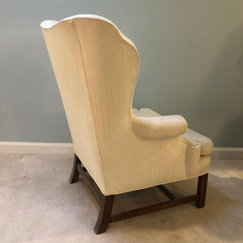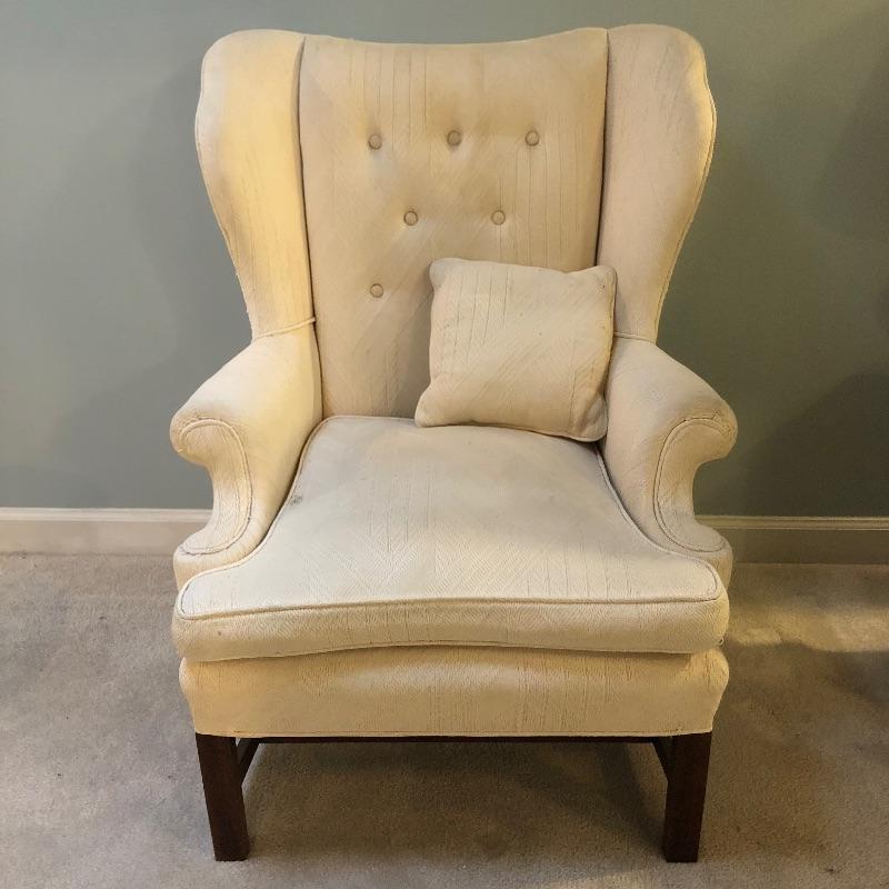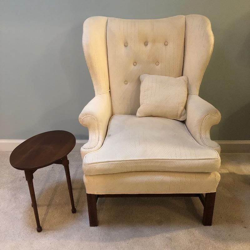 This lot includes a beautiful white wing back upholstered chair, as well as a round wooden side table. These pieces compliment each other wonderfully, but also look great on their own. The wood side table also folds up for easy storage or transportation. Chair is 16.5"W x 12"D x 16.5"H. Table is 31"W x 31"D x 41"H.