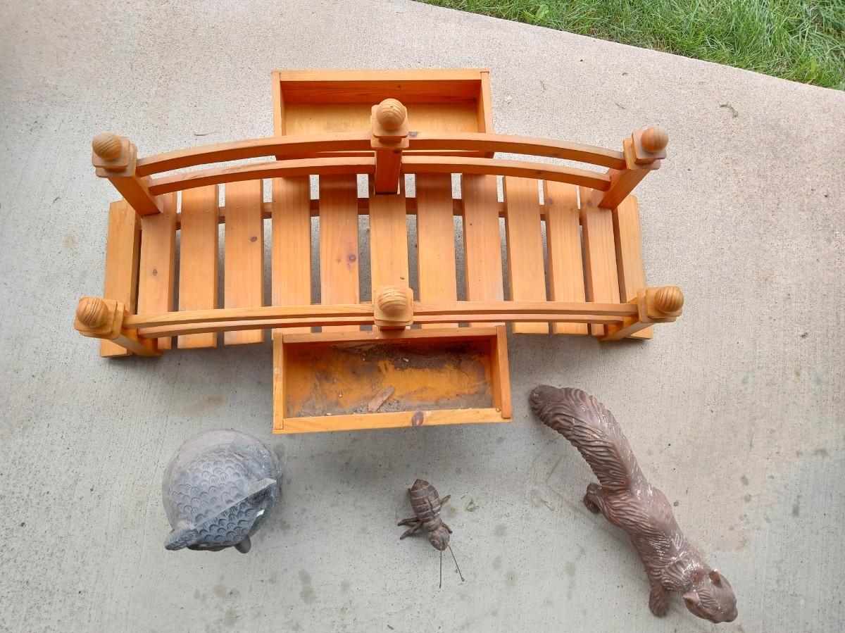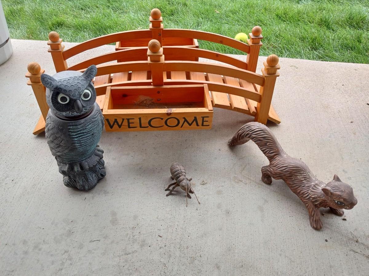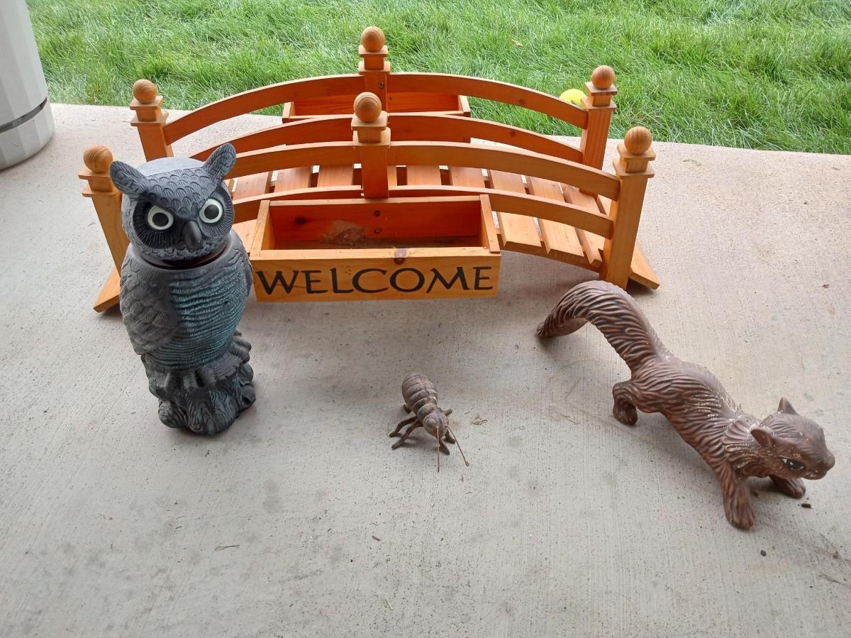 WOODEN BRIDGE 28" LONG, CERAMIC SQUIRREL, CAST IRON BUG AND A PLASTIC OWL