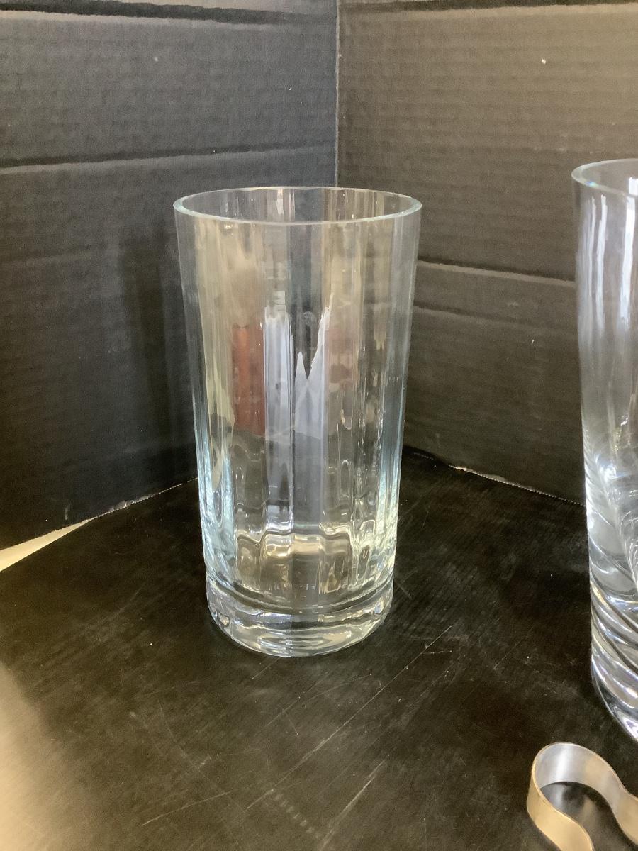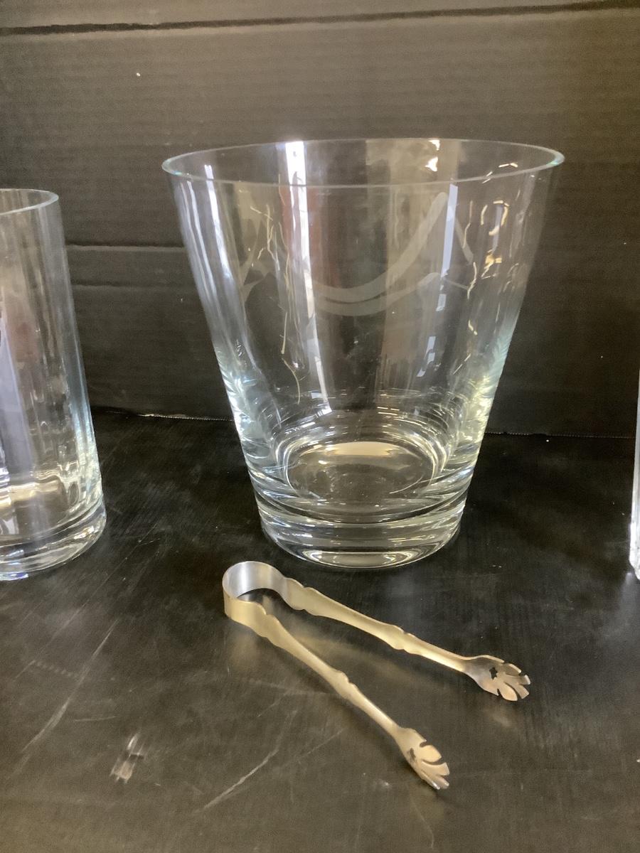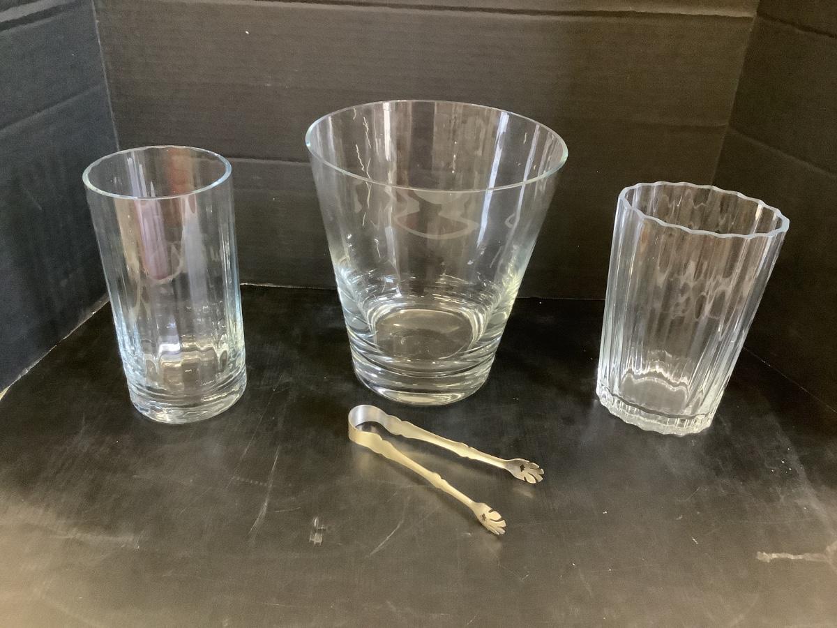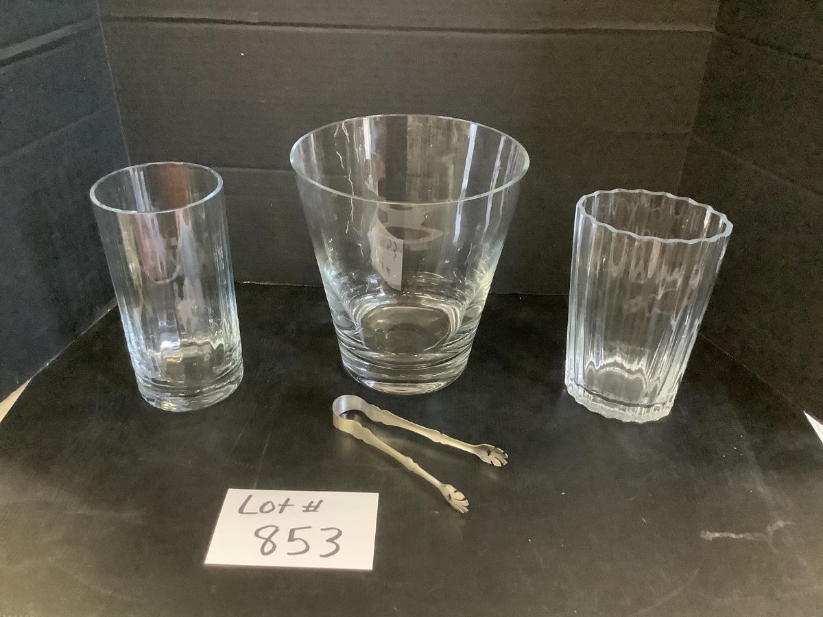 Lot 853. Clear Glass Wine Bucket /Pair of Clear Glass Ribbed Vases/ Silver Tongs