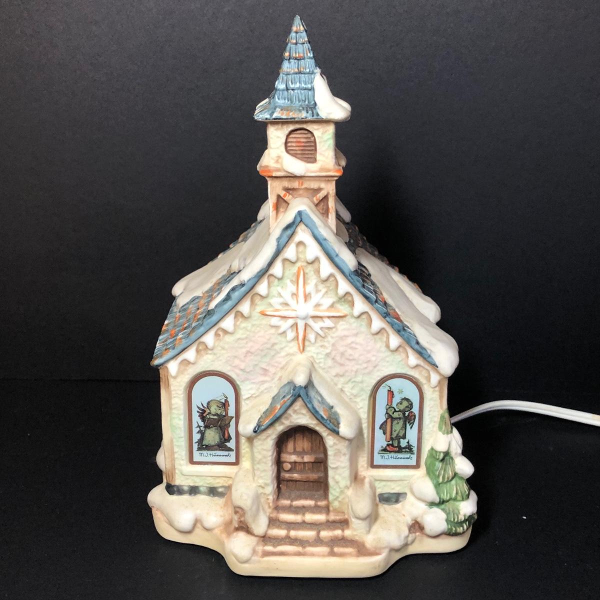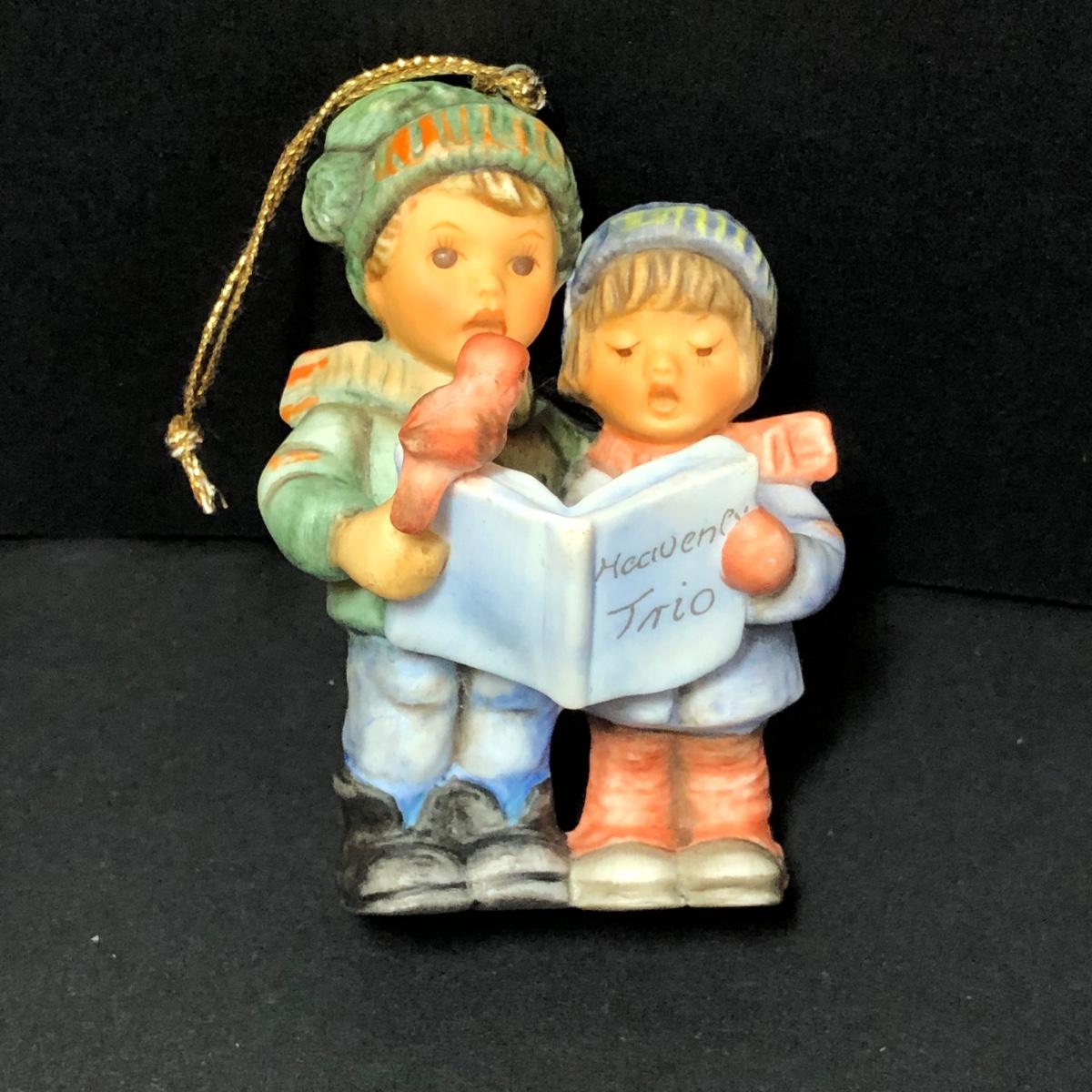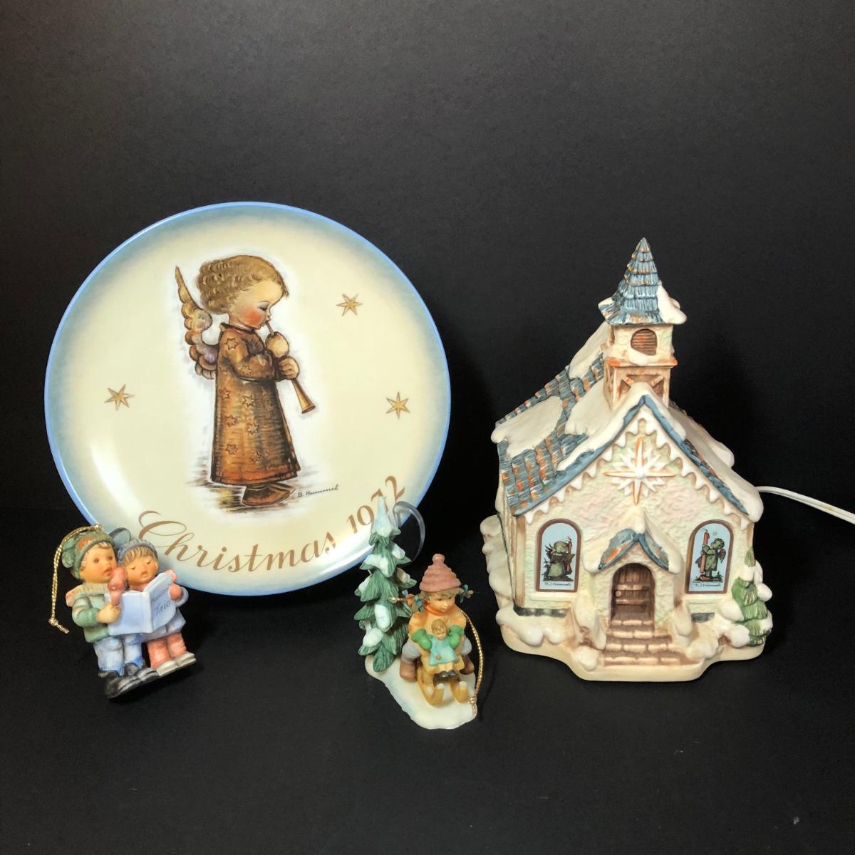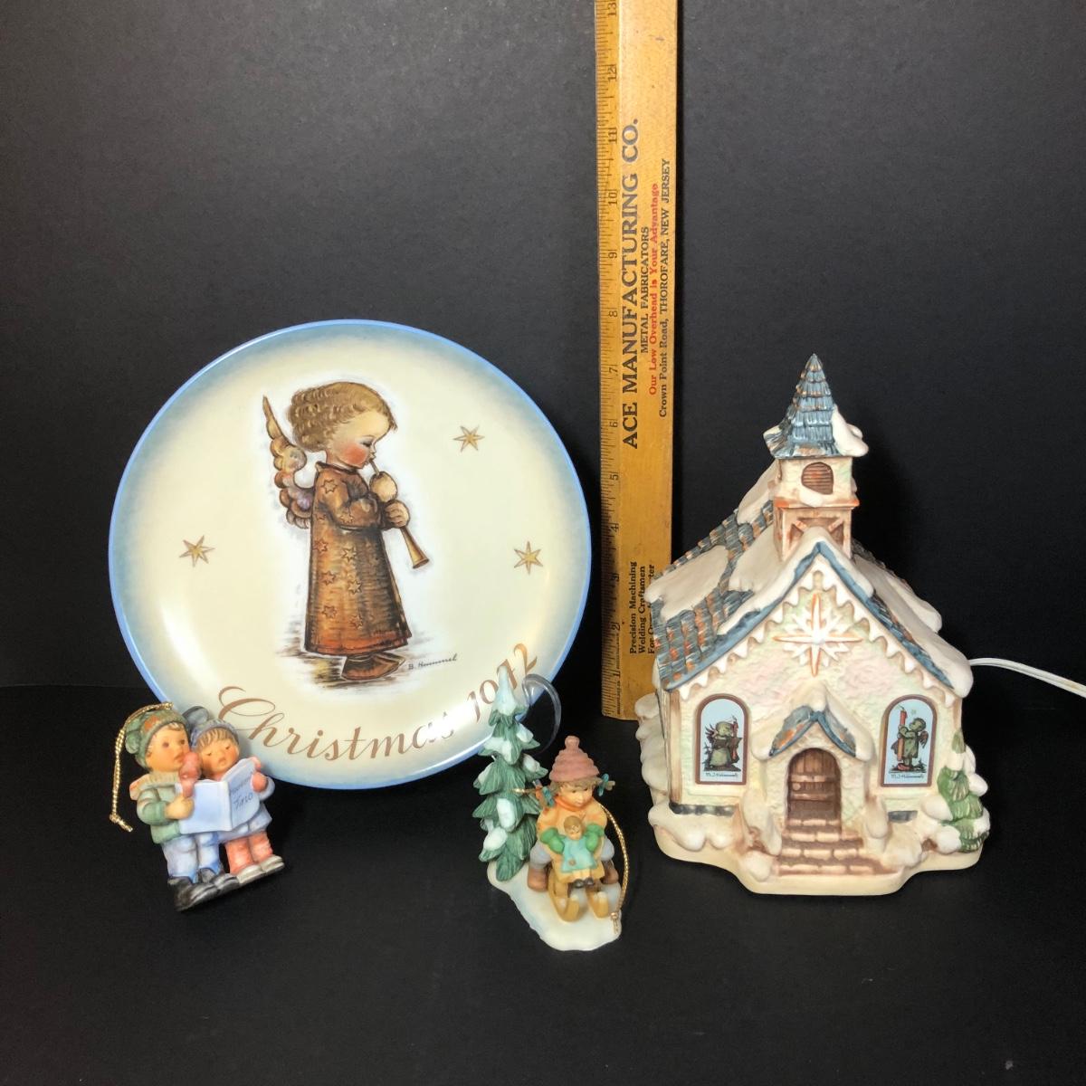 Includes a limited edition "Engel mit Flote" Berta Hummel Christmas 1972 decorative plate, a 1997 Berta Hummel/Goebel "Heavenly Trio" ornament, M.I. Hummel/Goebel ornament of children sledding, "Angels Duet" M.I. Hummel/Goebel church sculpture with a light cord (sculpture 3522A). The light cord may or may not be original as it is duct taped to the bottom.