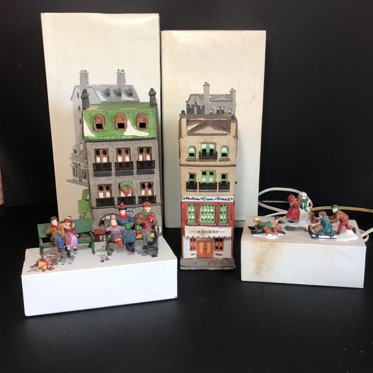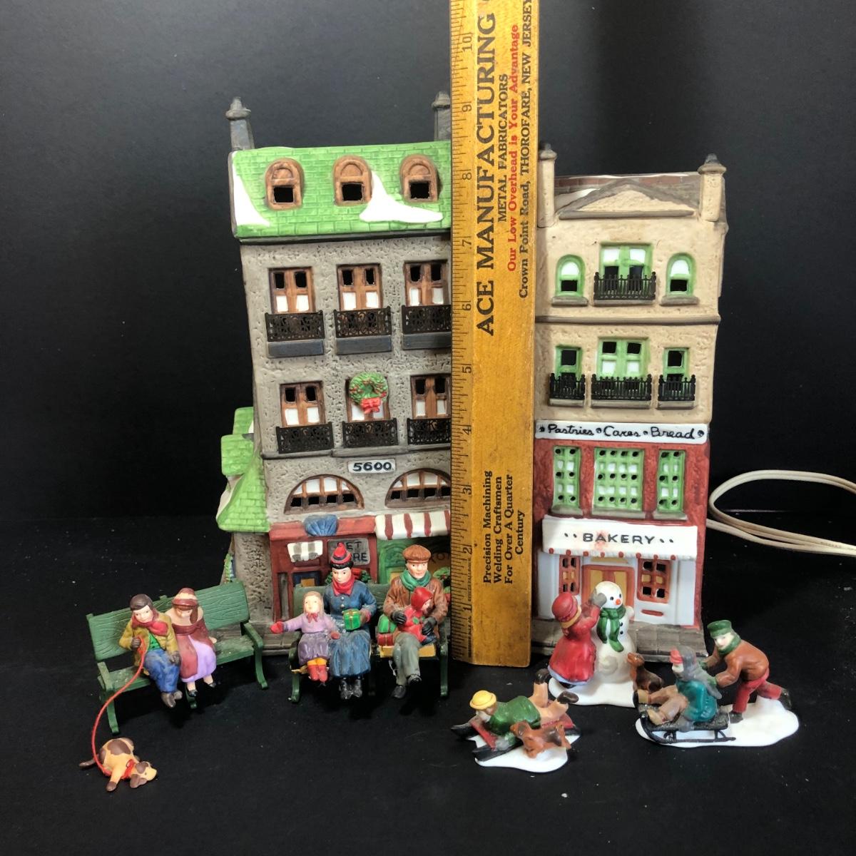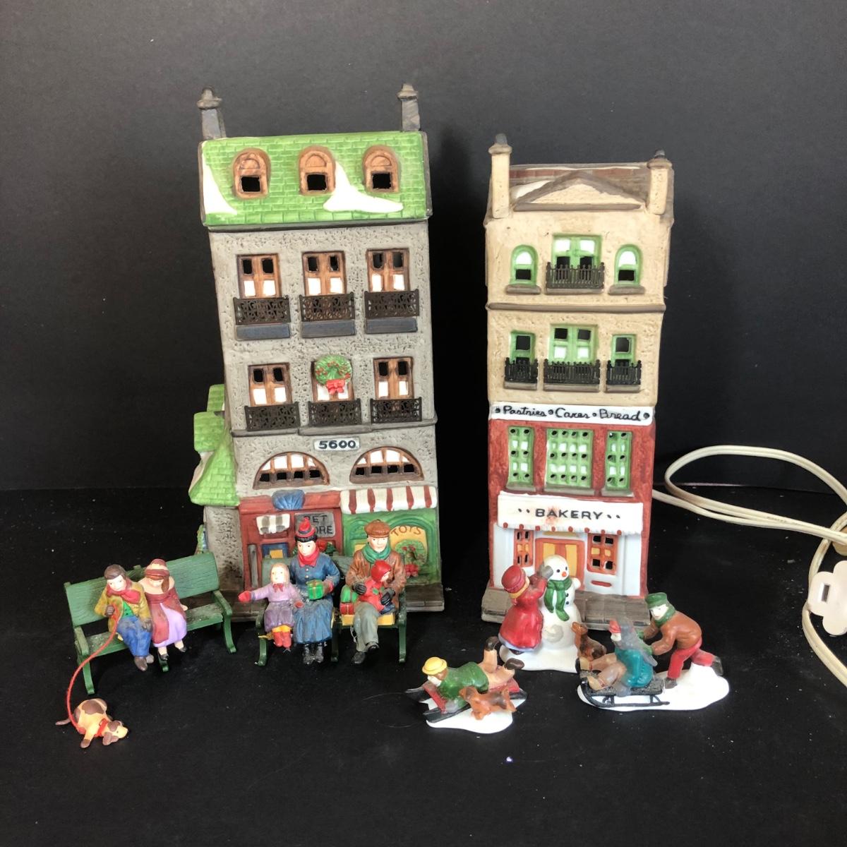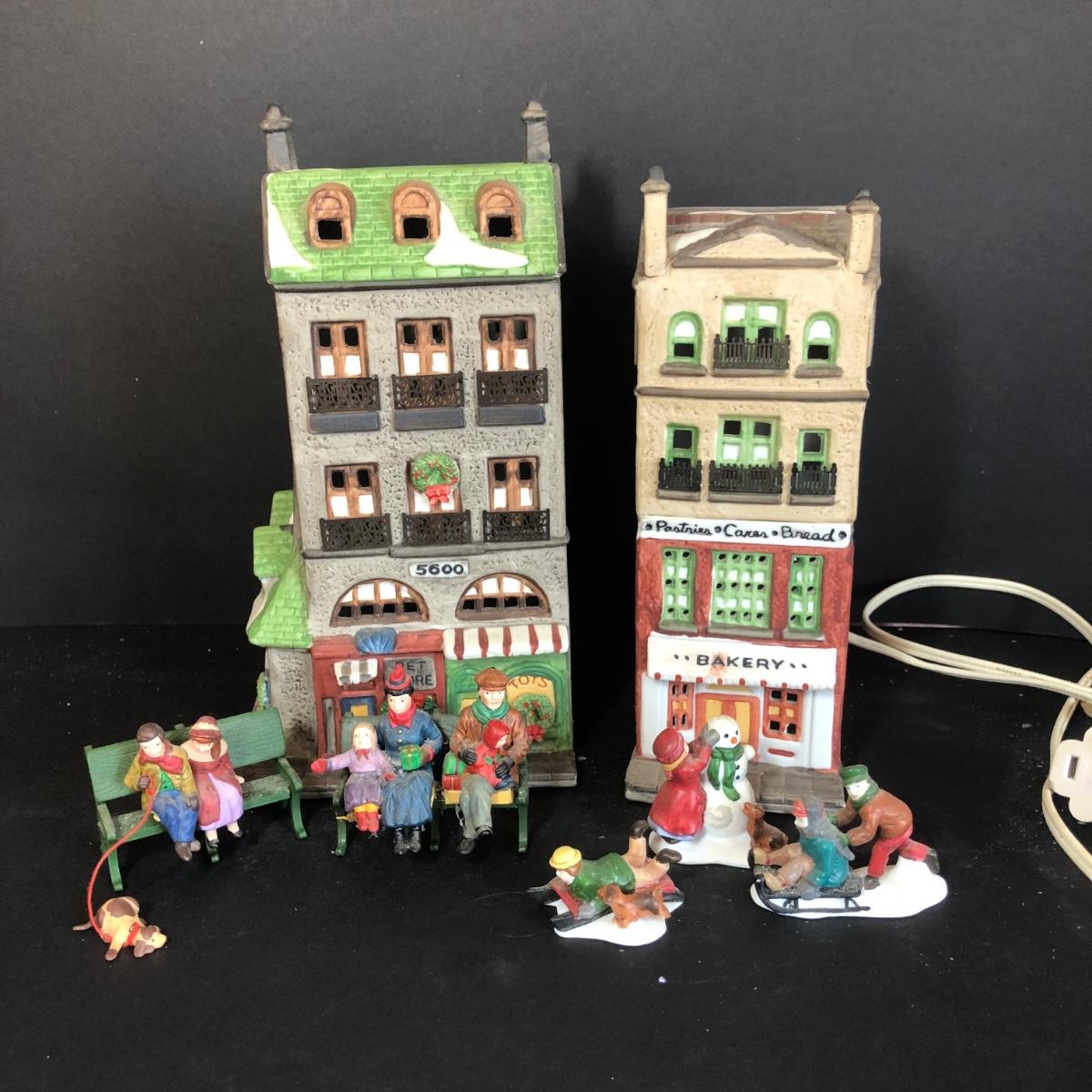 Both buildings include boxes, only the Bakery includes a light cord. The Toy shop/pet store does not include a light cord. The small figurines include boxes, however the Christmas at the Park figures are glued to benches and will not fit in their box. Toy shop/pet store and Bakery are part of the Christmas in the City series. All items have been on display and every effort has been made to photograph any wear/damage. Boxes may or may not have condition issues due to storage and age.