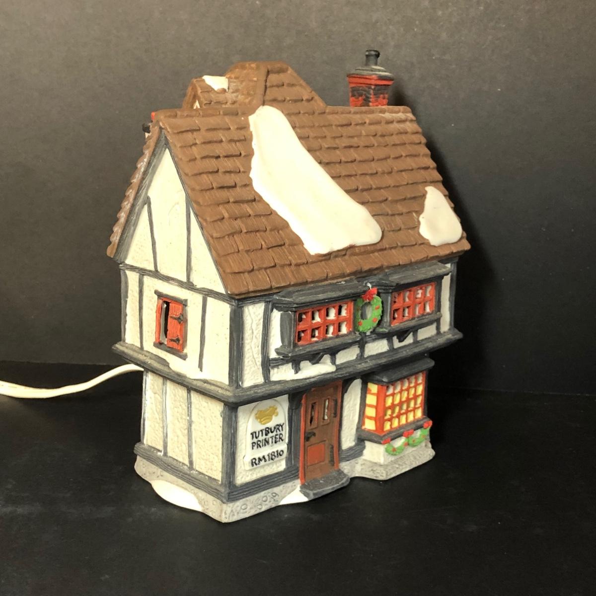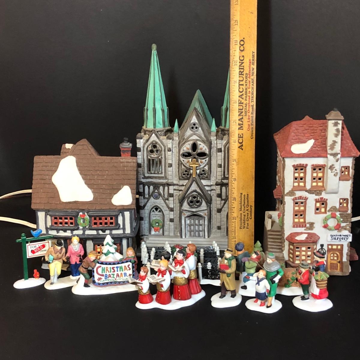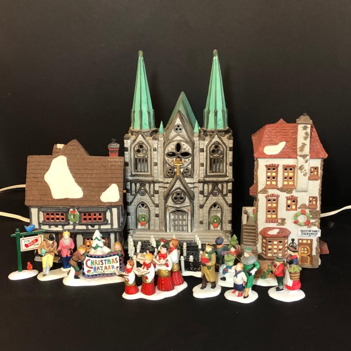 All buildings include light cords. Includes porcelain and metal accessories. Cathedral is part of the Christmas in the City series. Physician and printer buildings are part of the Dickens' Village Series. No boxes included except the box for the "Choirboys All-In-A-Row" box. All items have been on display and every effort has been made to photograph any wear/damage. Boxes may or may not have condition issues due to storage and age.