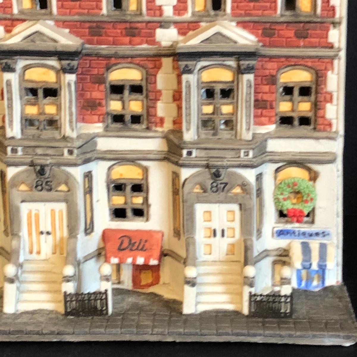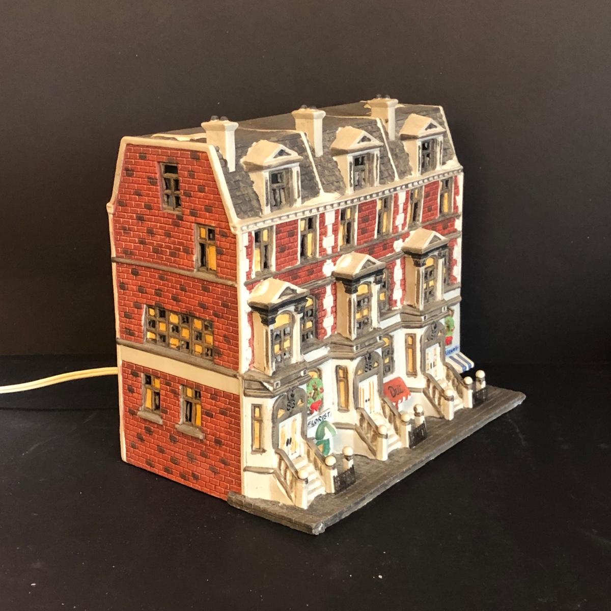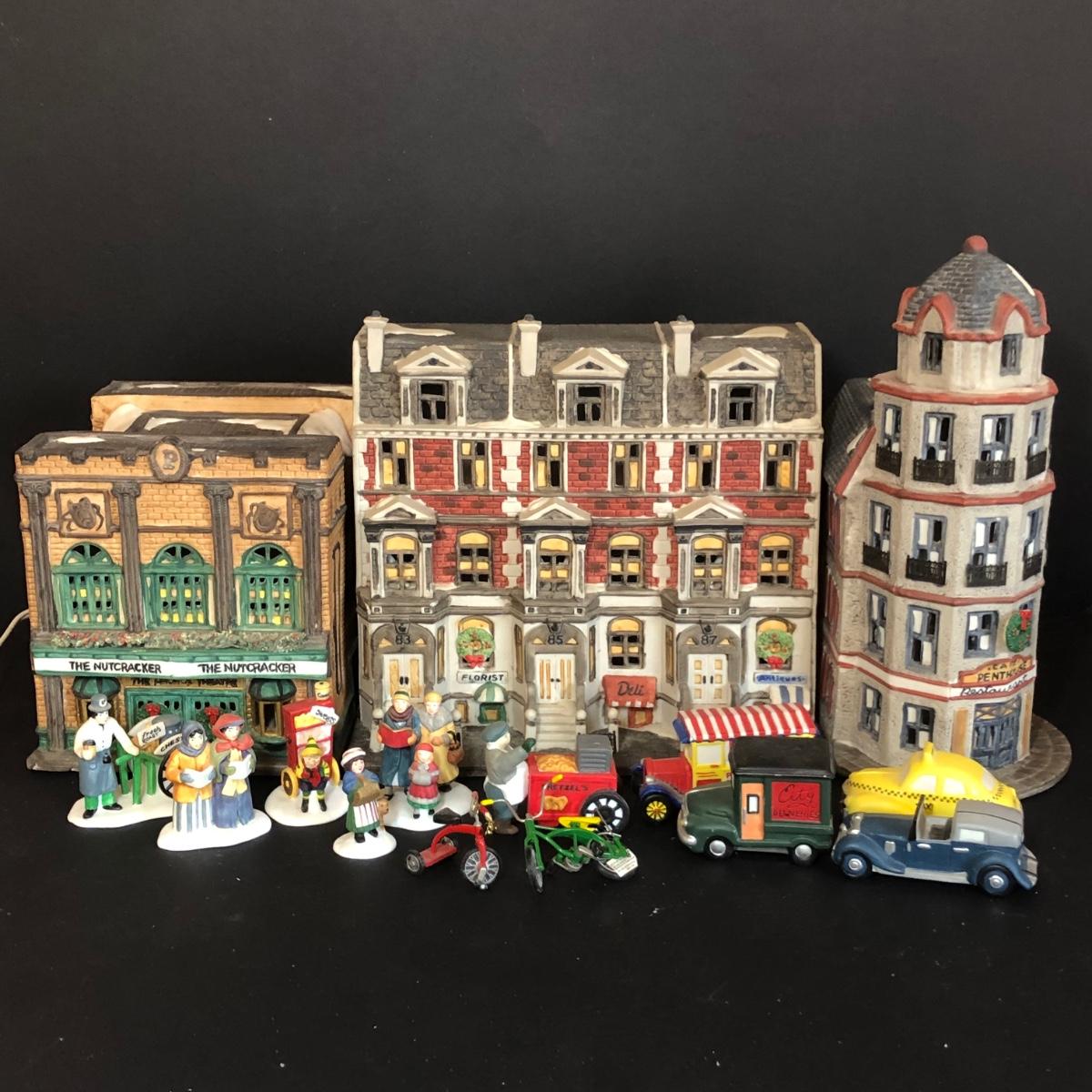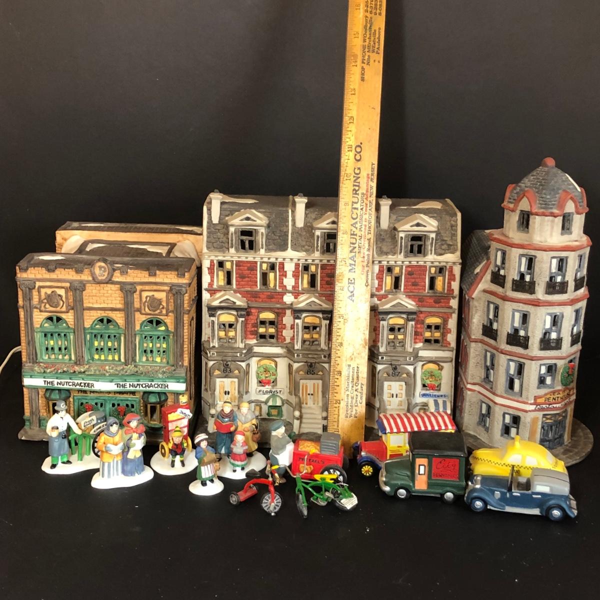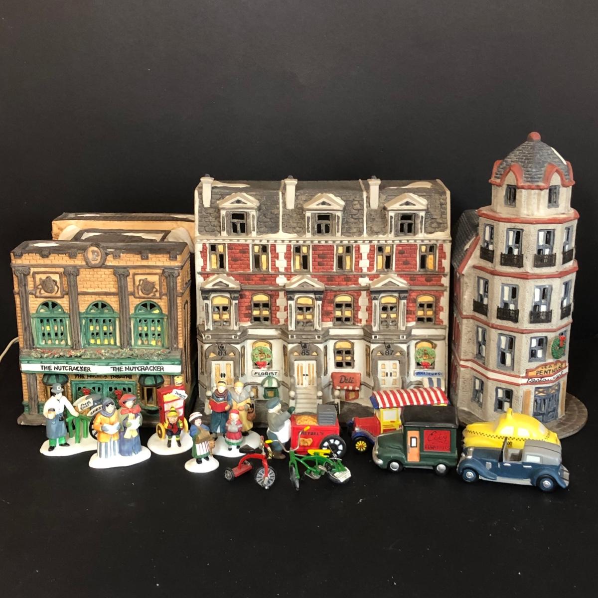 LOT 23M: Vintage Department 56 - 1987 Tower Cafe, 1987 Sutton Place Rowhouse, 1987 The Palace Theatre, Metal Tricycle Set, Porcelain Automobile Set, & More Dept 56 Accessories