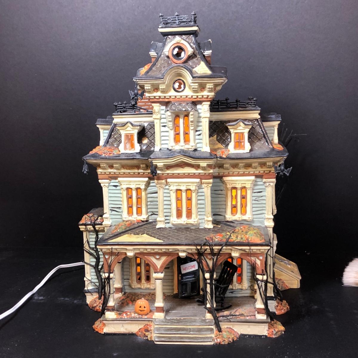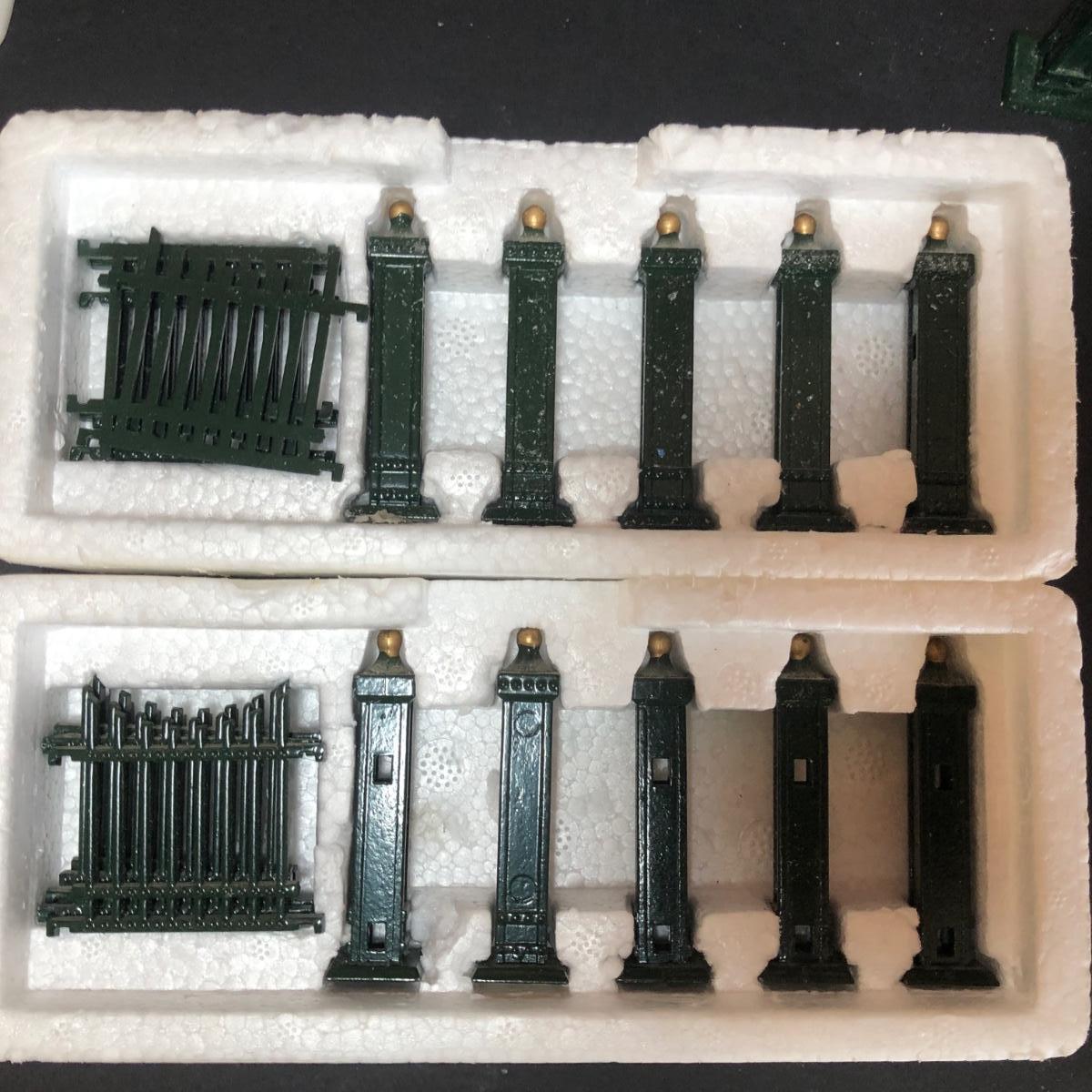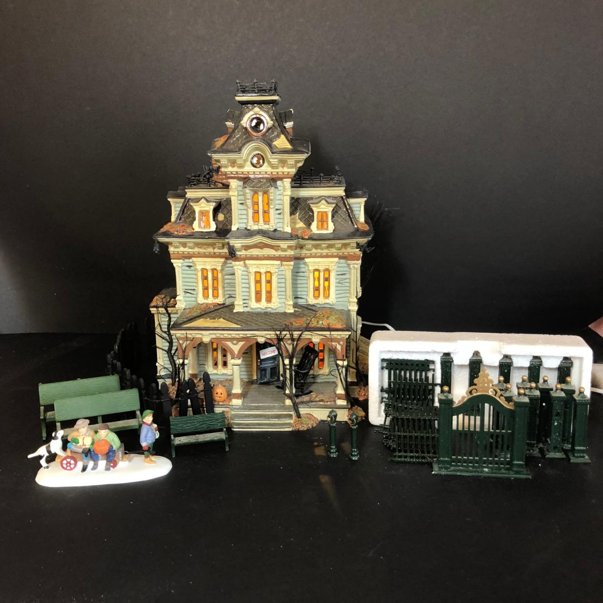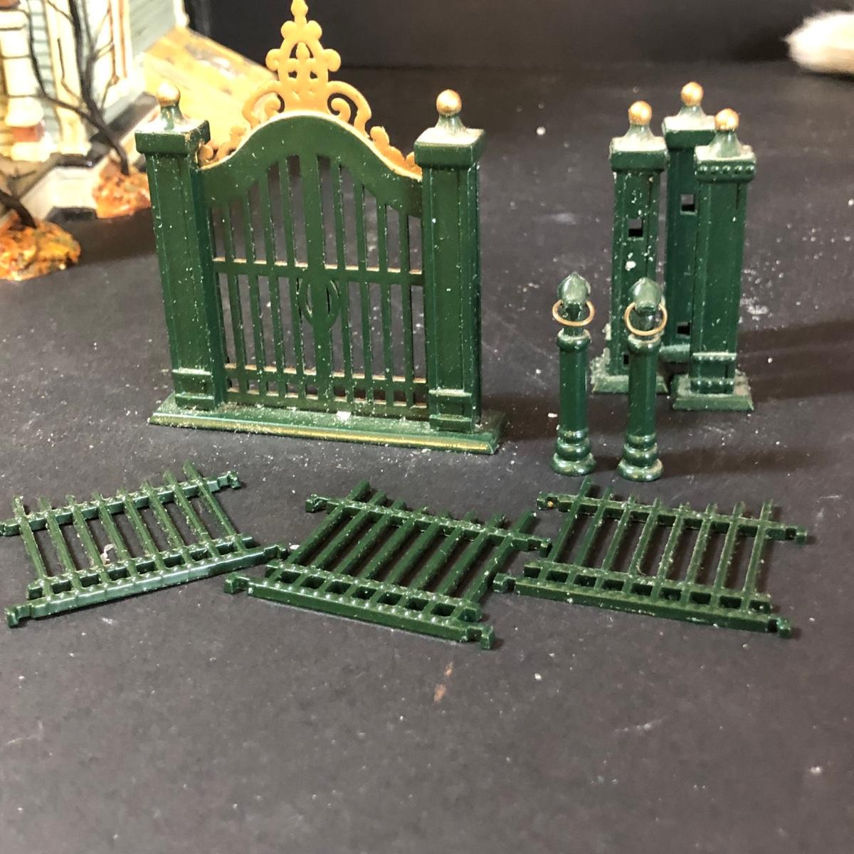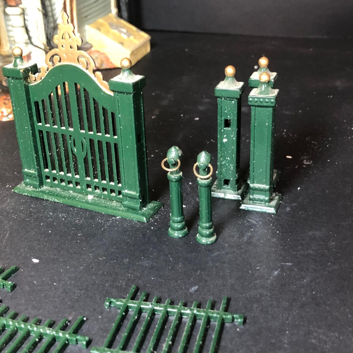 Grimsly Manor includes light and sound box, which has different options for the sound part. Both lights and sounds work.. No box is included with the Halloween House. Two full sets of Village Wrought Iron Fence extensions included along with a gate, horse hitches, and extras. All items have been on display and every effort has been made to photograph any wear/damage. Boxes only included if pictured. Boxes may or may not have condition issues due to storage and age.