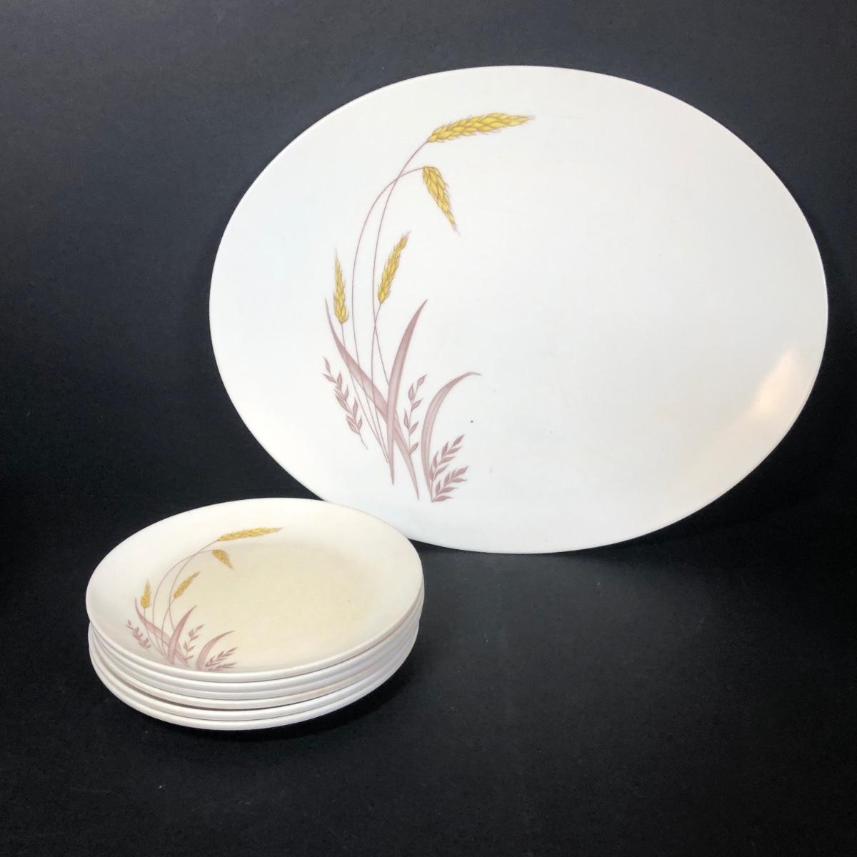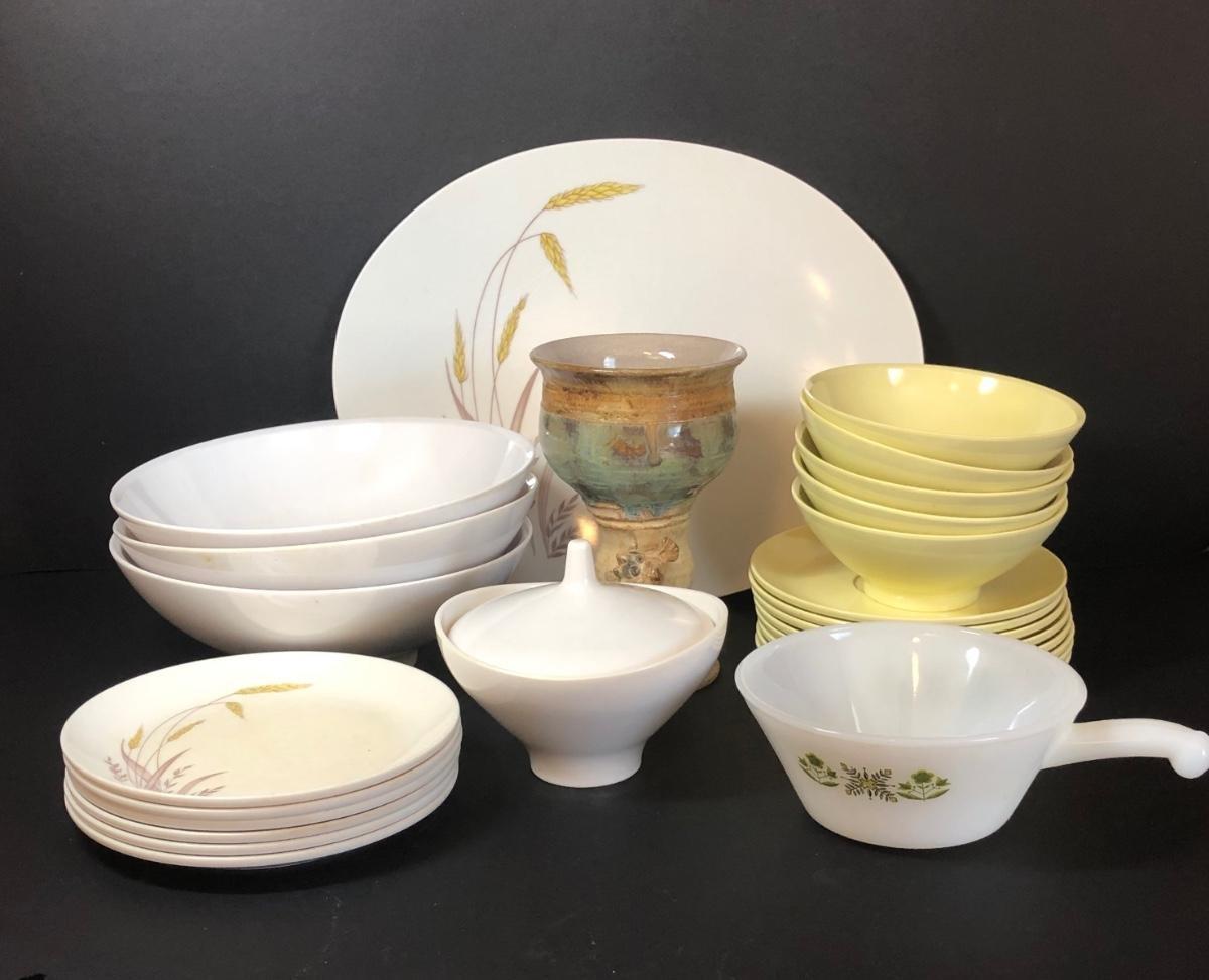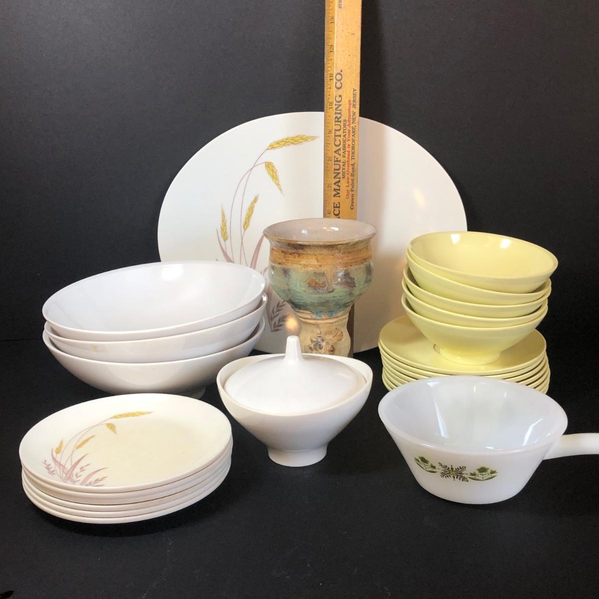 Boontonware dishes include serving platter and plates with wheat pattern, yellow Somerset bowls and saucers, three large white bowls, a lidded dish and a glazed pottery vase.