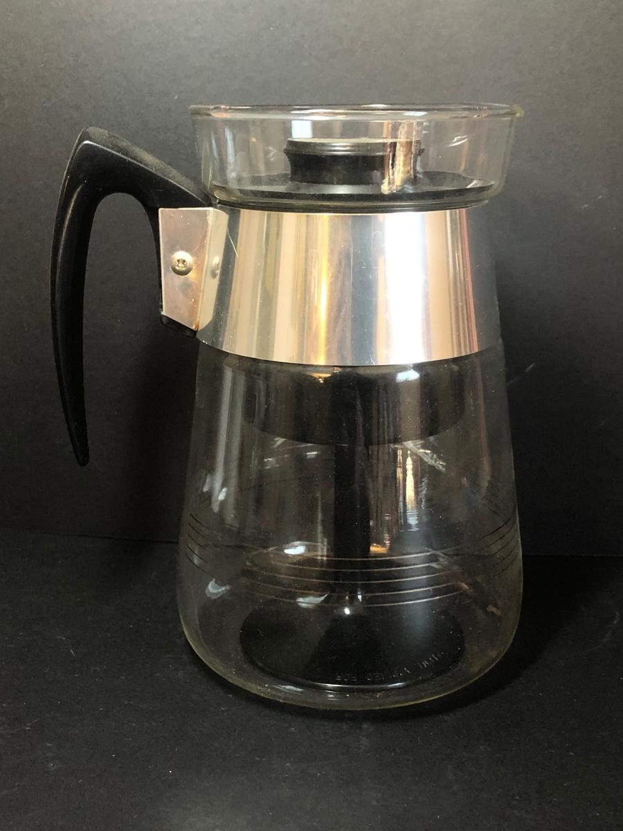 Includes a glass coffee pot with plastic handle, two tea pots in different patterns and four mugs with finger holes for handles.