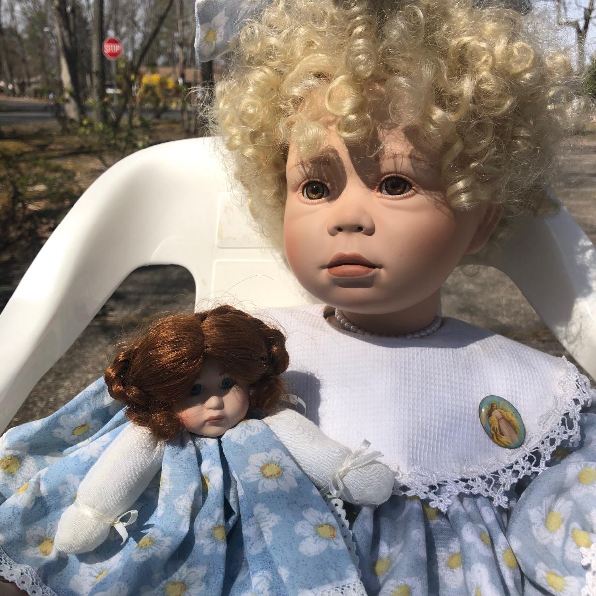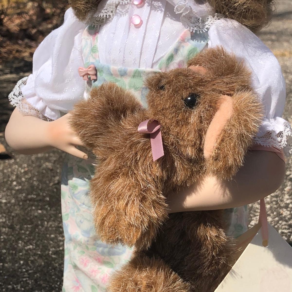 LOT 35M: Christine Orange Pocelain & Cloth Doll, Miniature Cloth Doll, 1990 Hamilton Collection "Jennifer" by Jane Zidjunas & Plastic Chair
