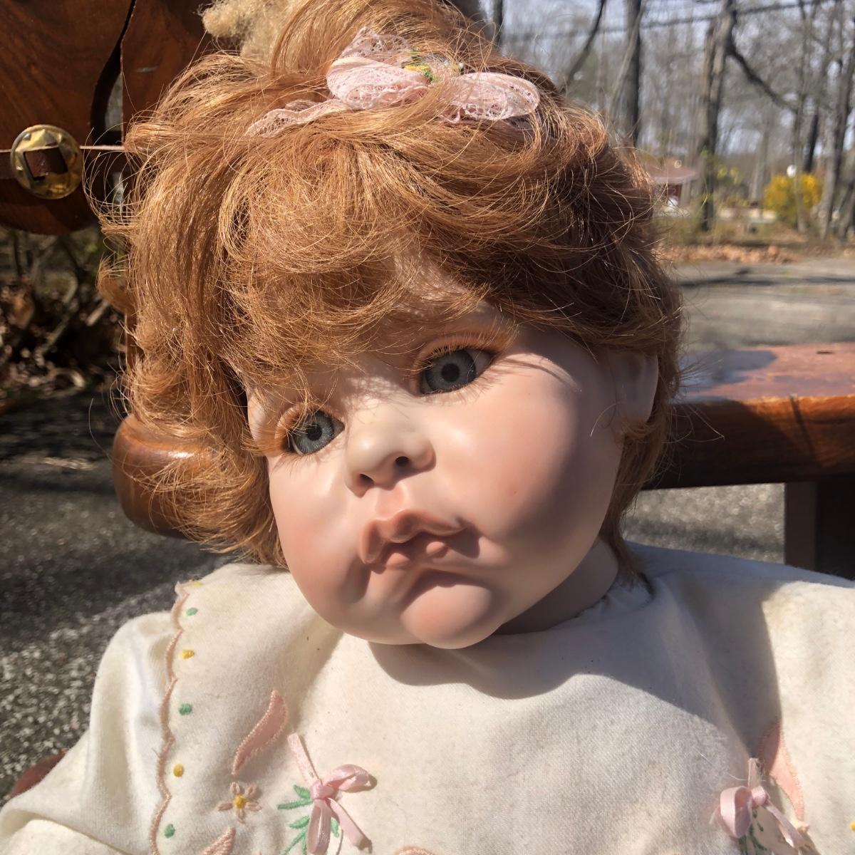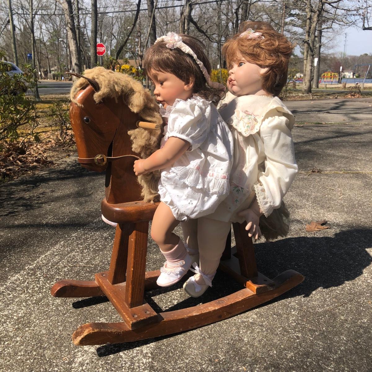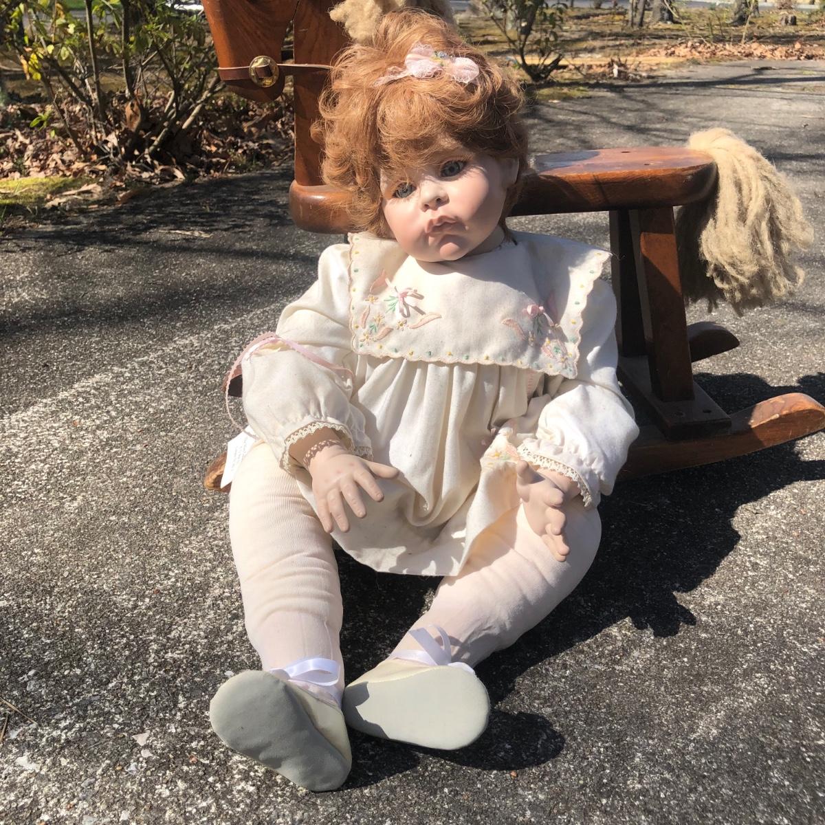 LOT 37M: 1991 "Angel Cheeks" Porcelain/Cloth Doll by Linda May, 1991 Pat Secrist Baby Doll & Wooden Rocking Horse