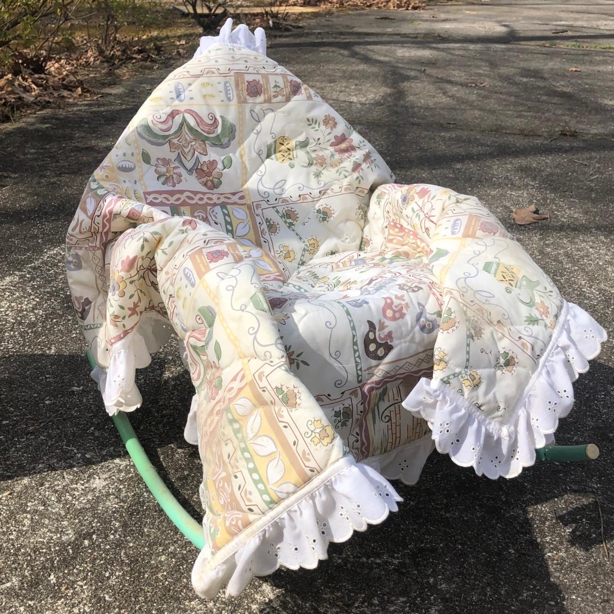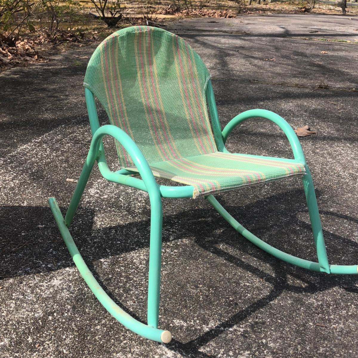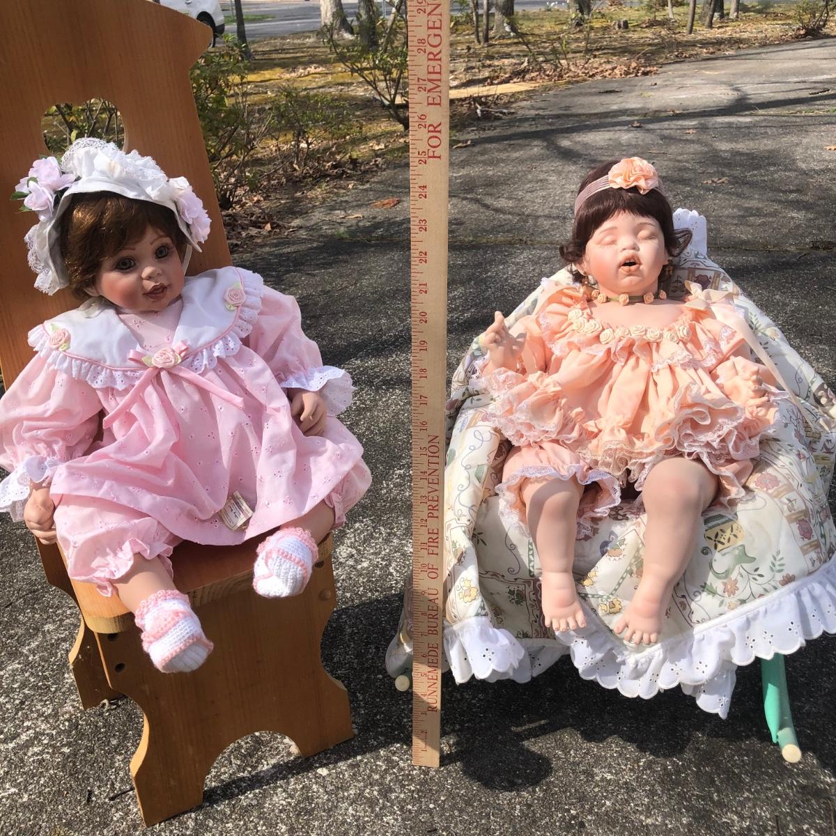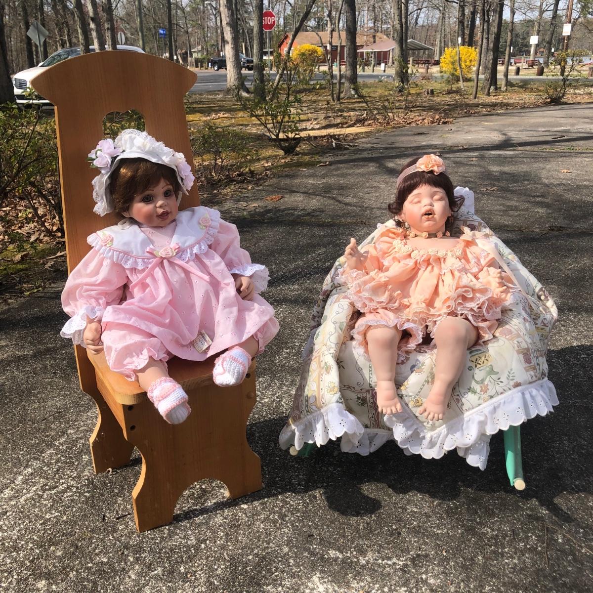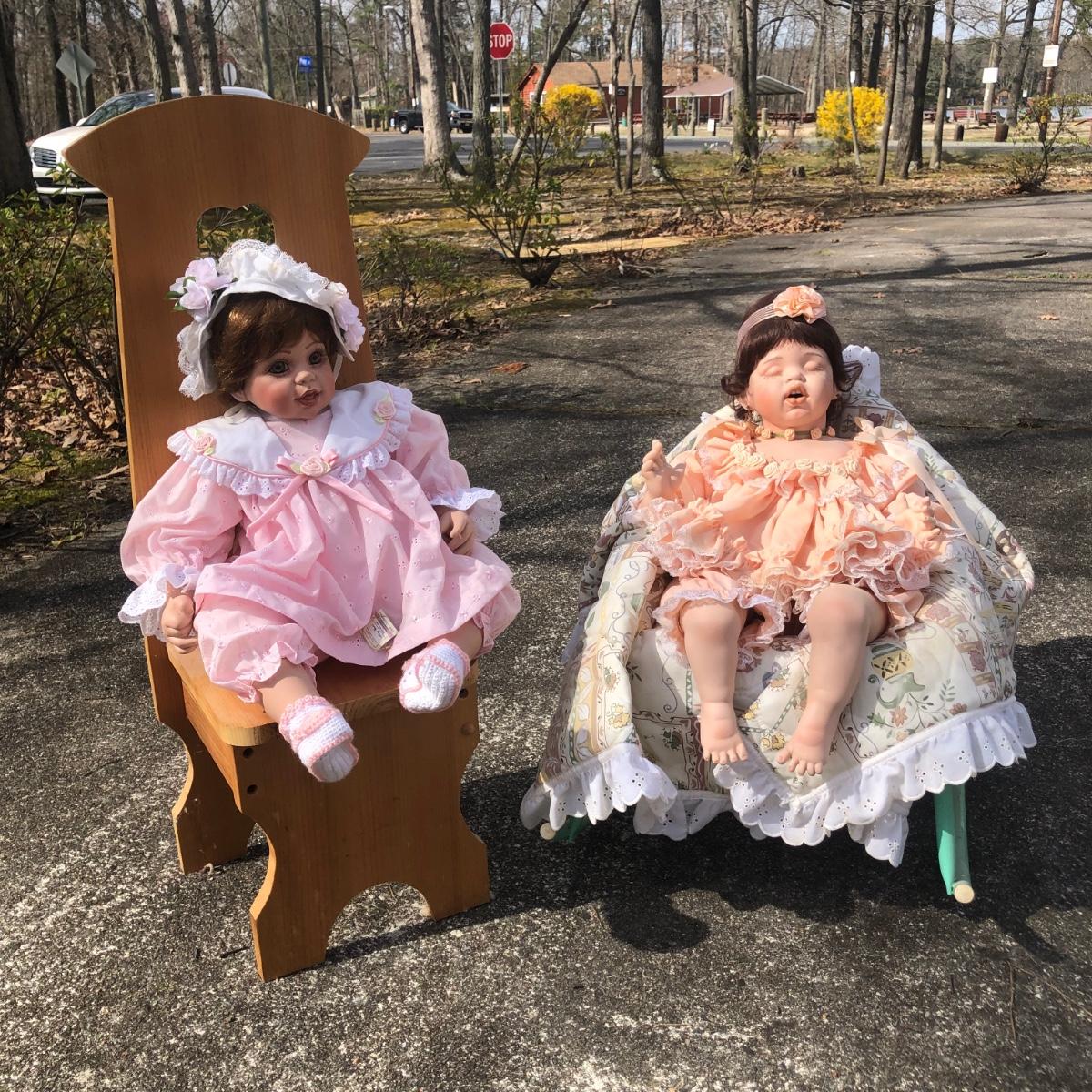 LOT 39M: Pair of Porcelain/Vinyl Dolls w/ Wooden Chair & Outdoor Rocking Chair
