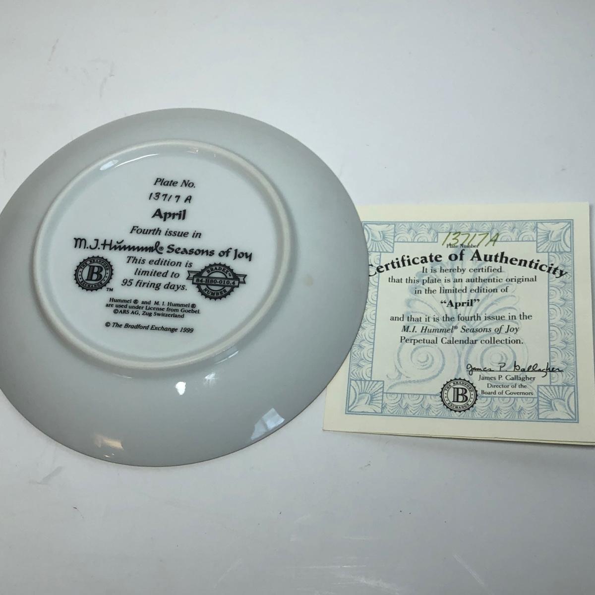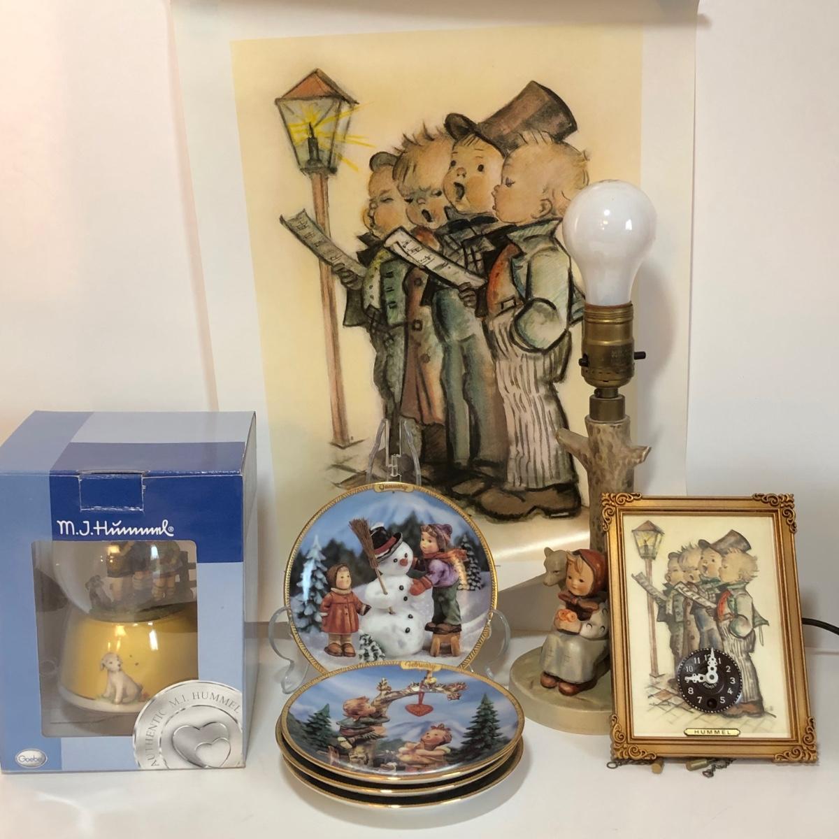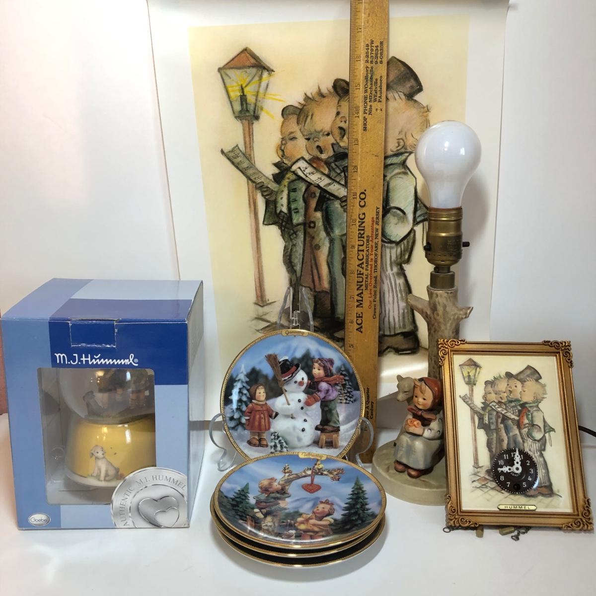 LOT 45M: M.I. Hummel/Goebel Collection: Lamp, Wall Clock, Seasons of Joy Plates, Follow the Leader Water Globe & Goebel Collectors' Club Poster