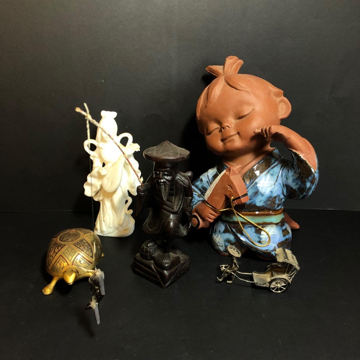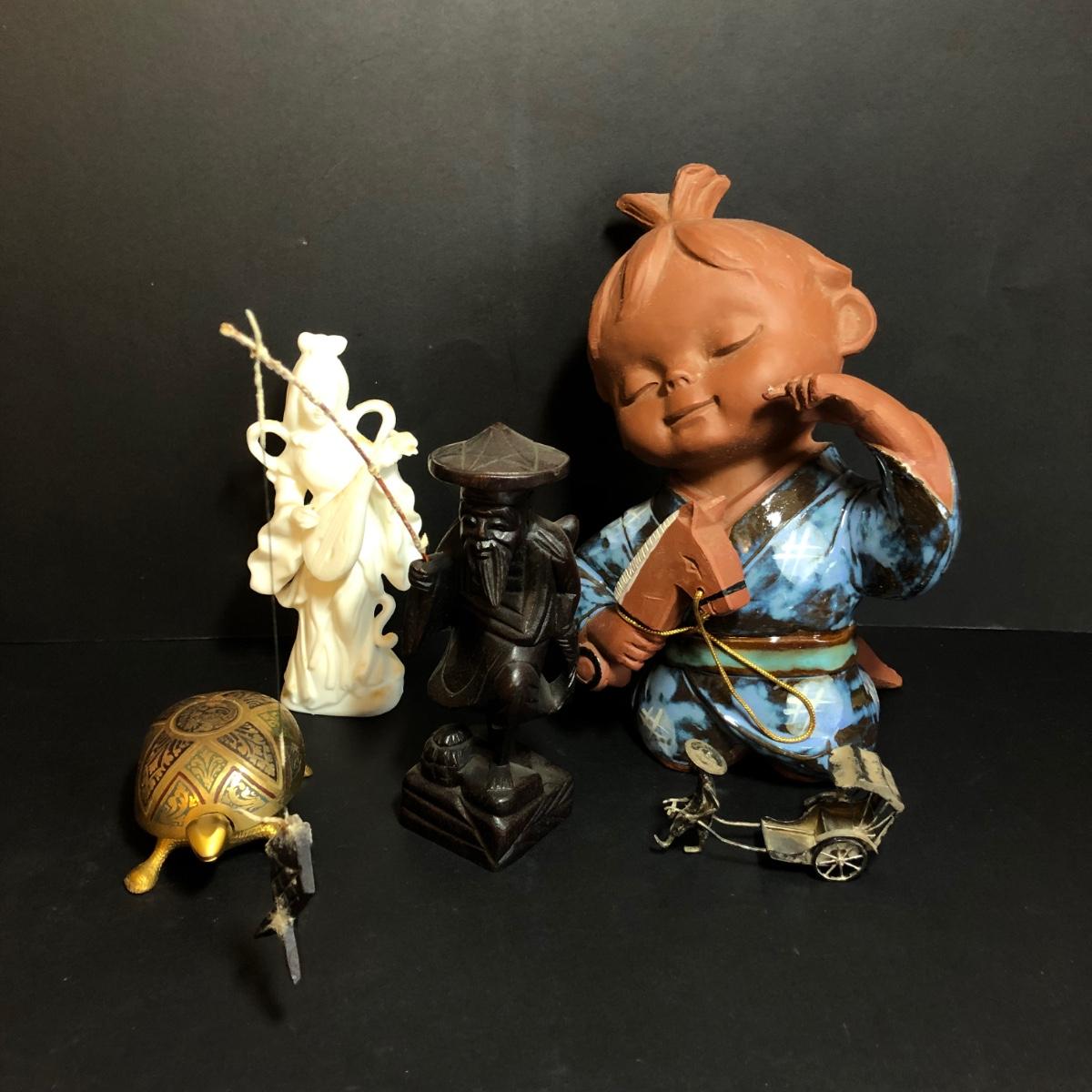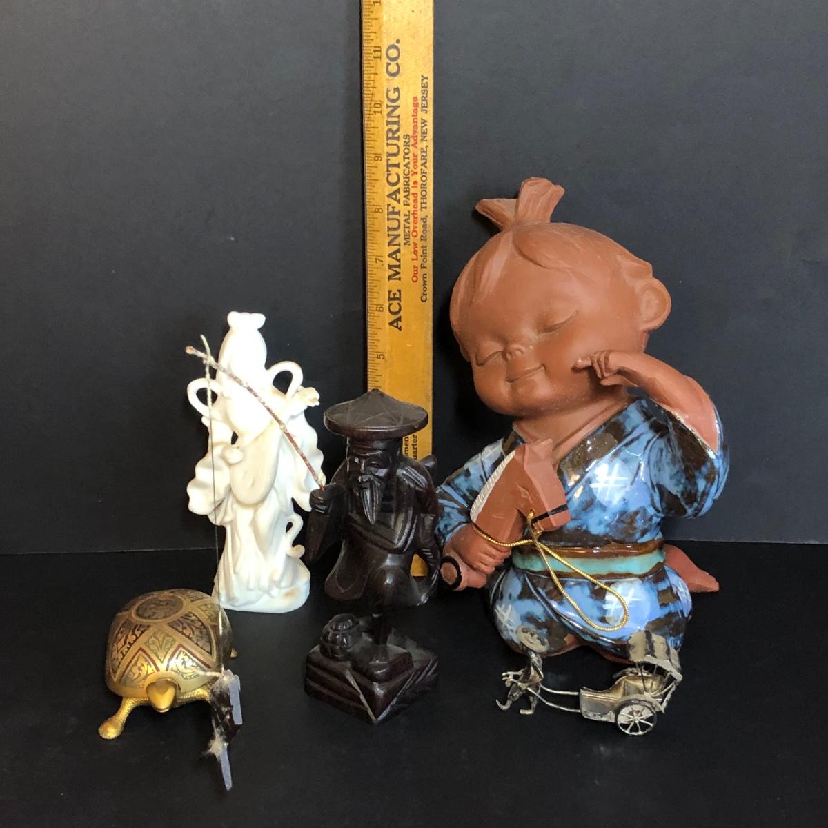 LOT 47M: Vintage Japanese Uctci Clay Pottery Girl, Brass Colored Turtle, Wooden Fisherman & More