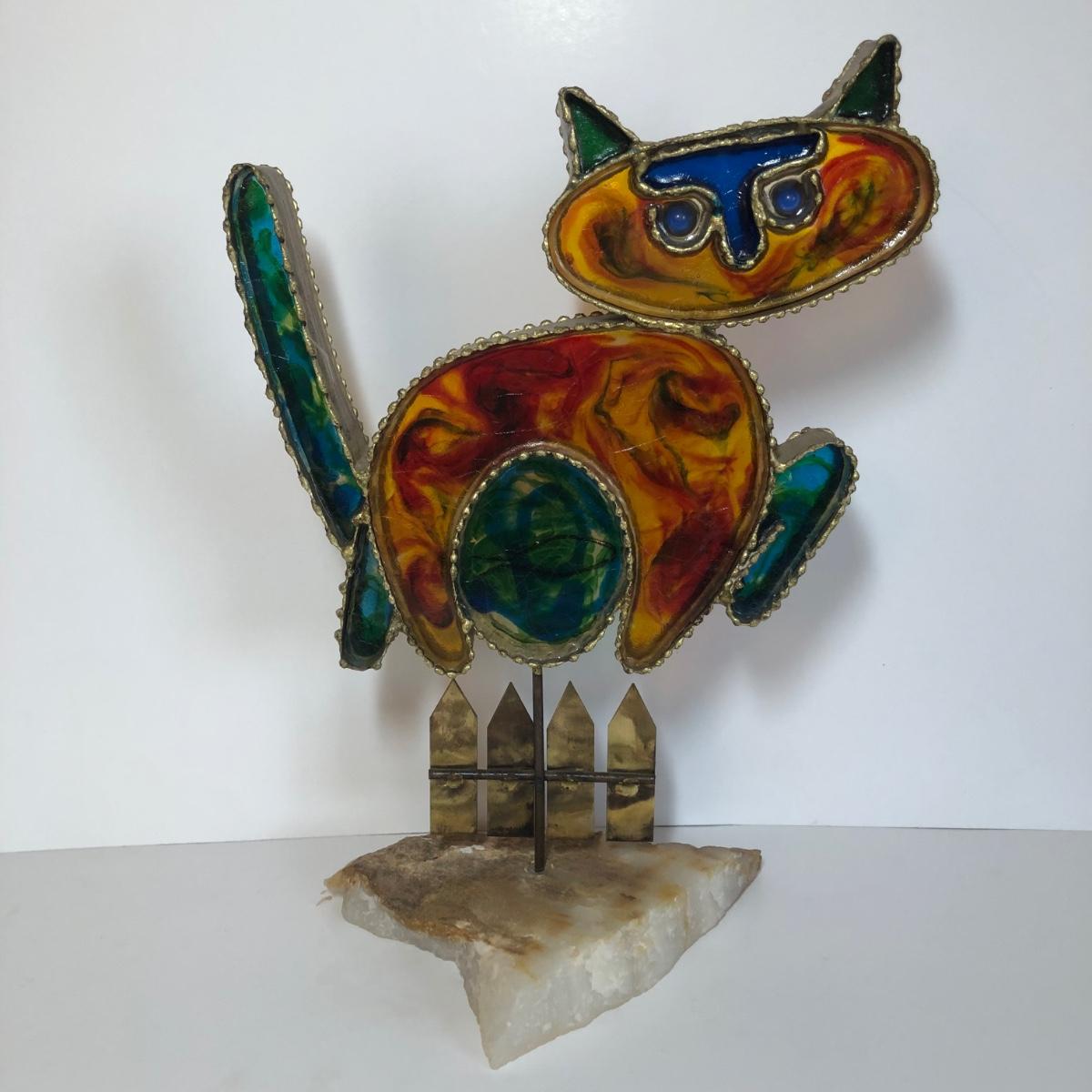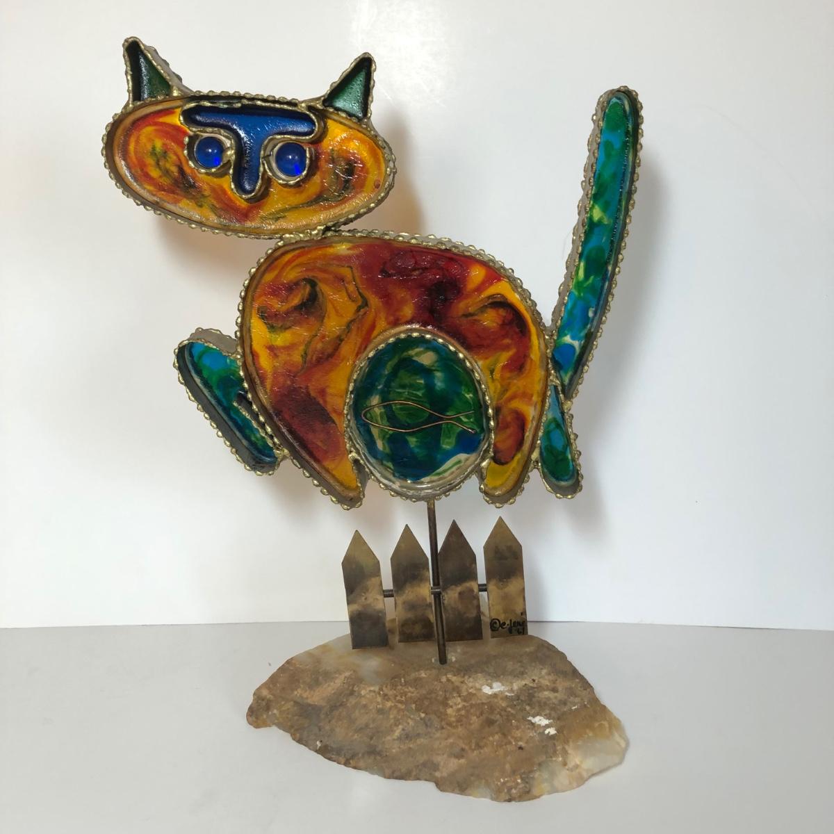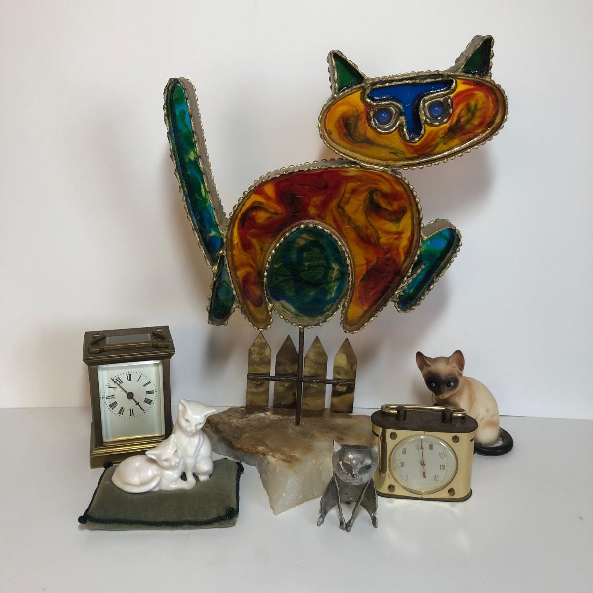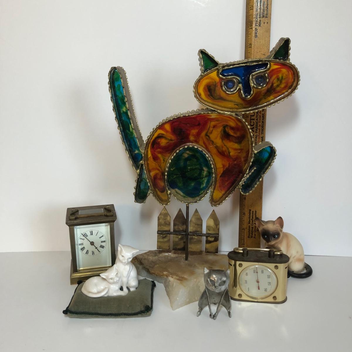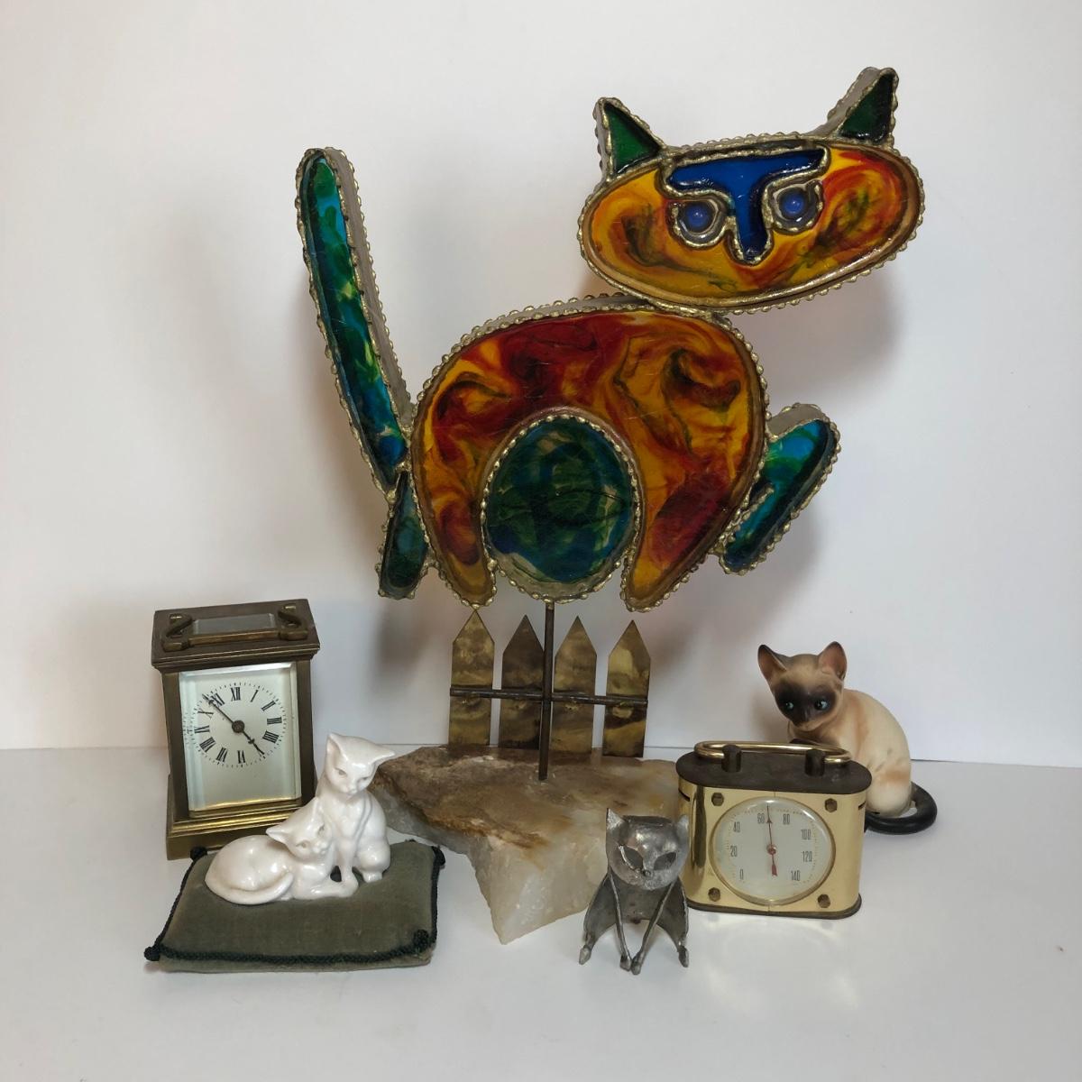 LOT 51M: Stained Glass Cat Sculpture, Miniature Clocks, Amber Glass Candle holder & Cat Figurines