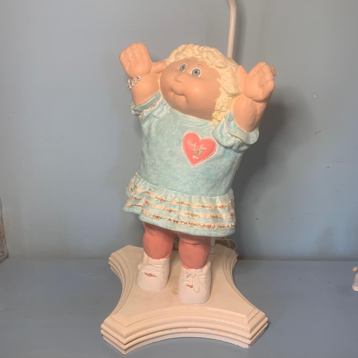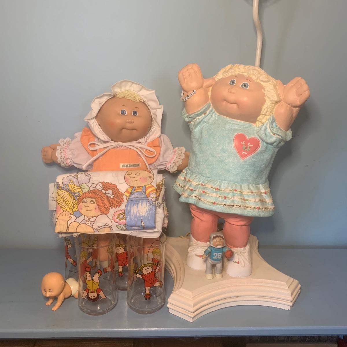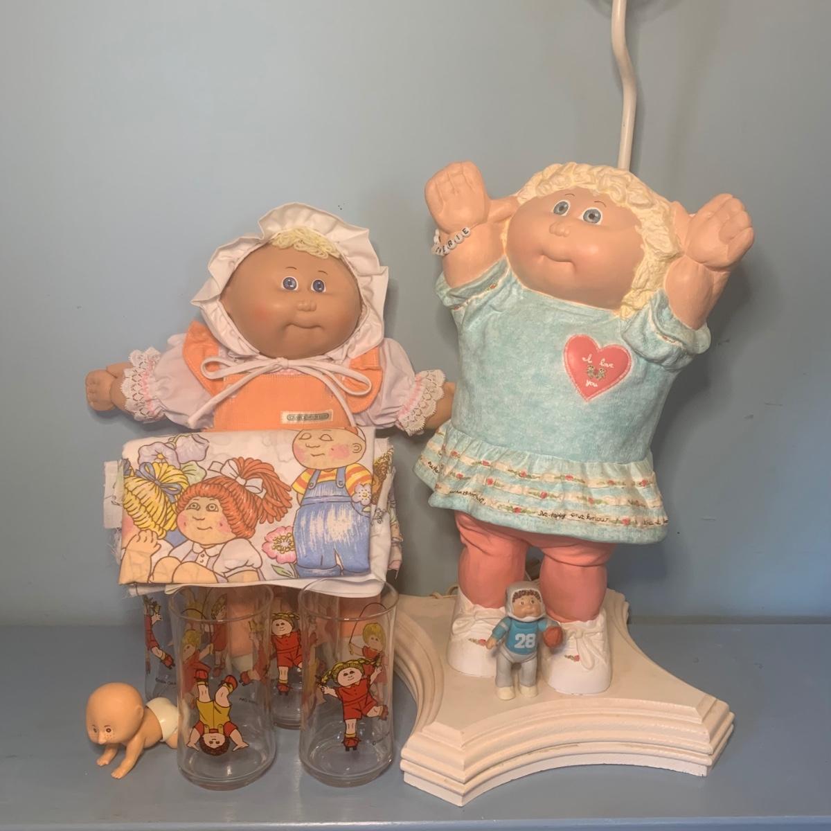 LOT 76R: Cabbage Patch: Lamp, Beverage Glasses Dolls, Porcelain Doll & Unmeasured Fabric Scraps