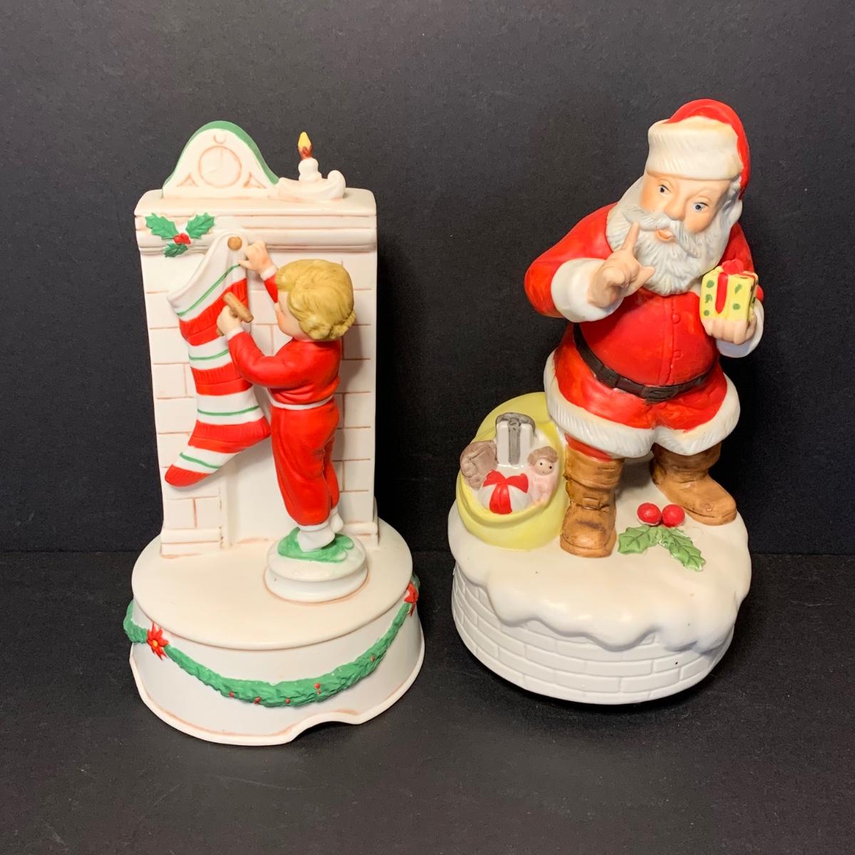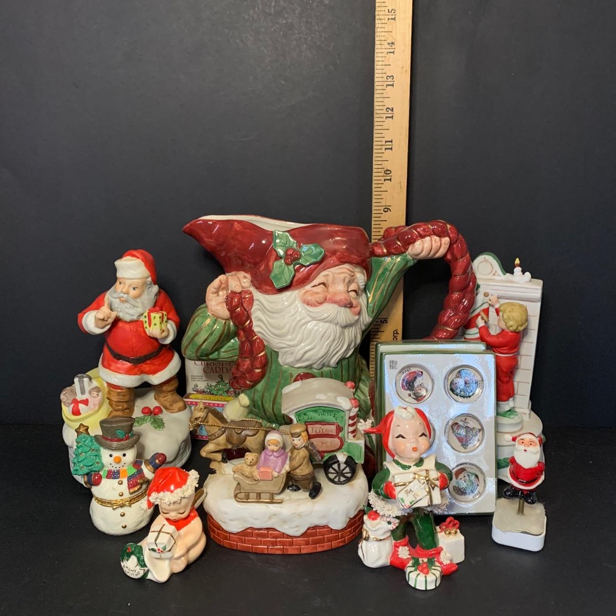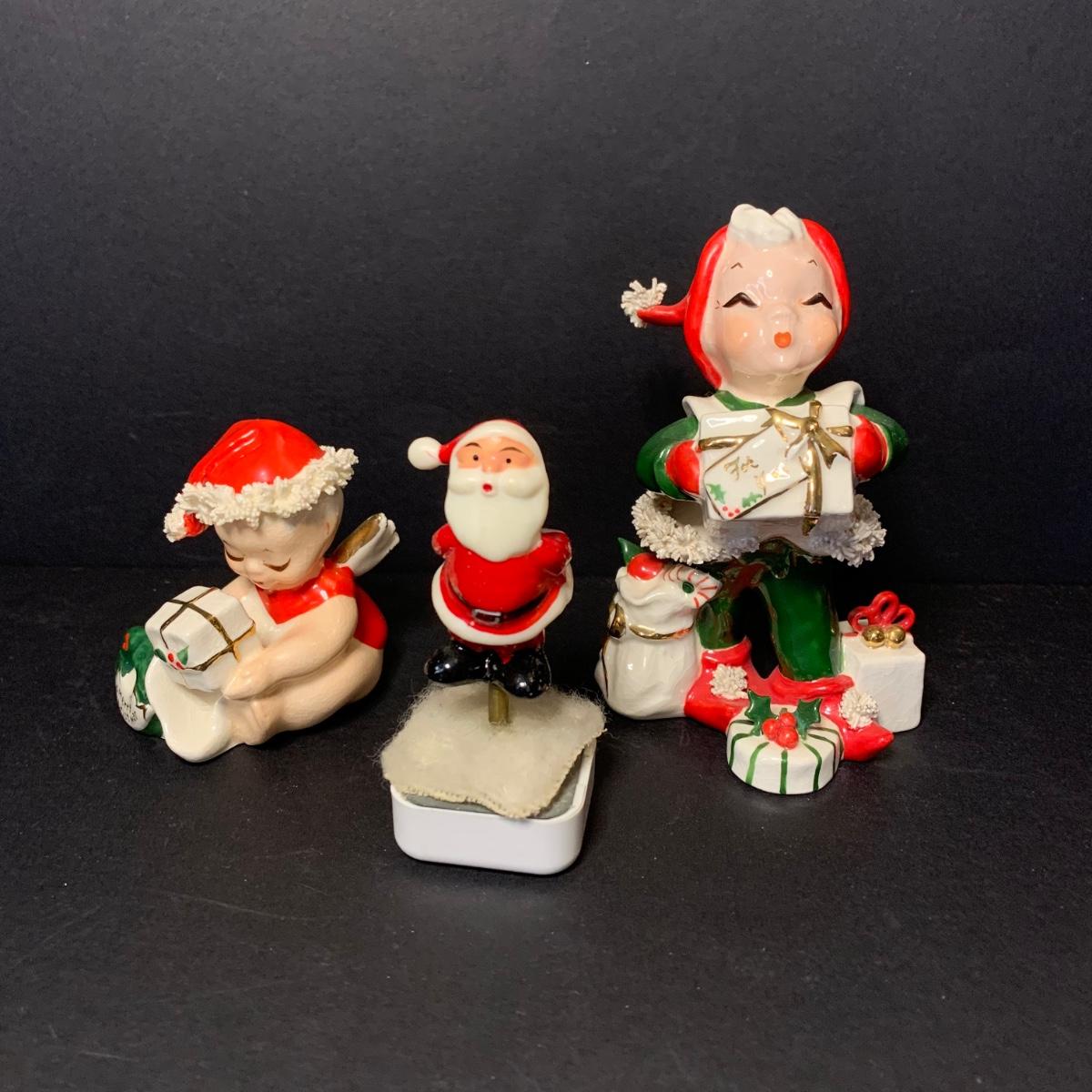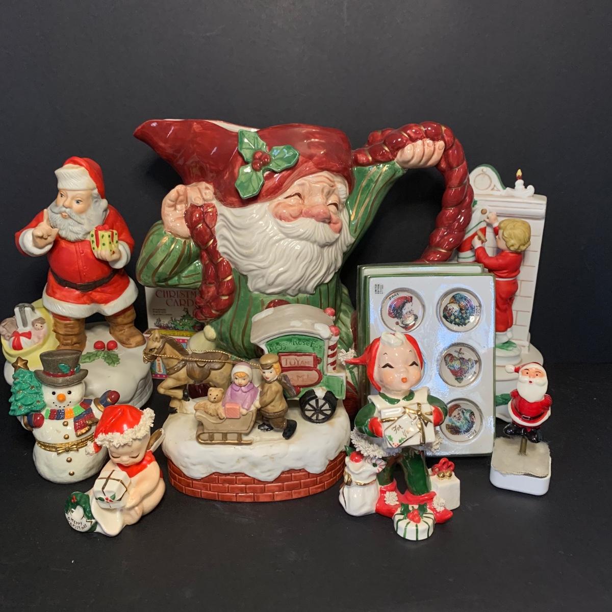 LOT  79R: Vintage Christmas & More: Spaghetti Trim Figures, Fitz & Floyd Pitcher, Miniature Porcelain Plates &  Music Boxes