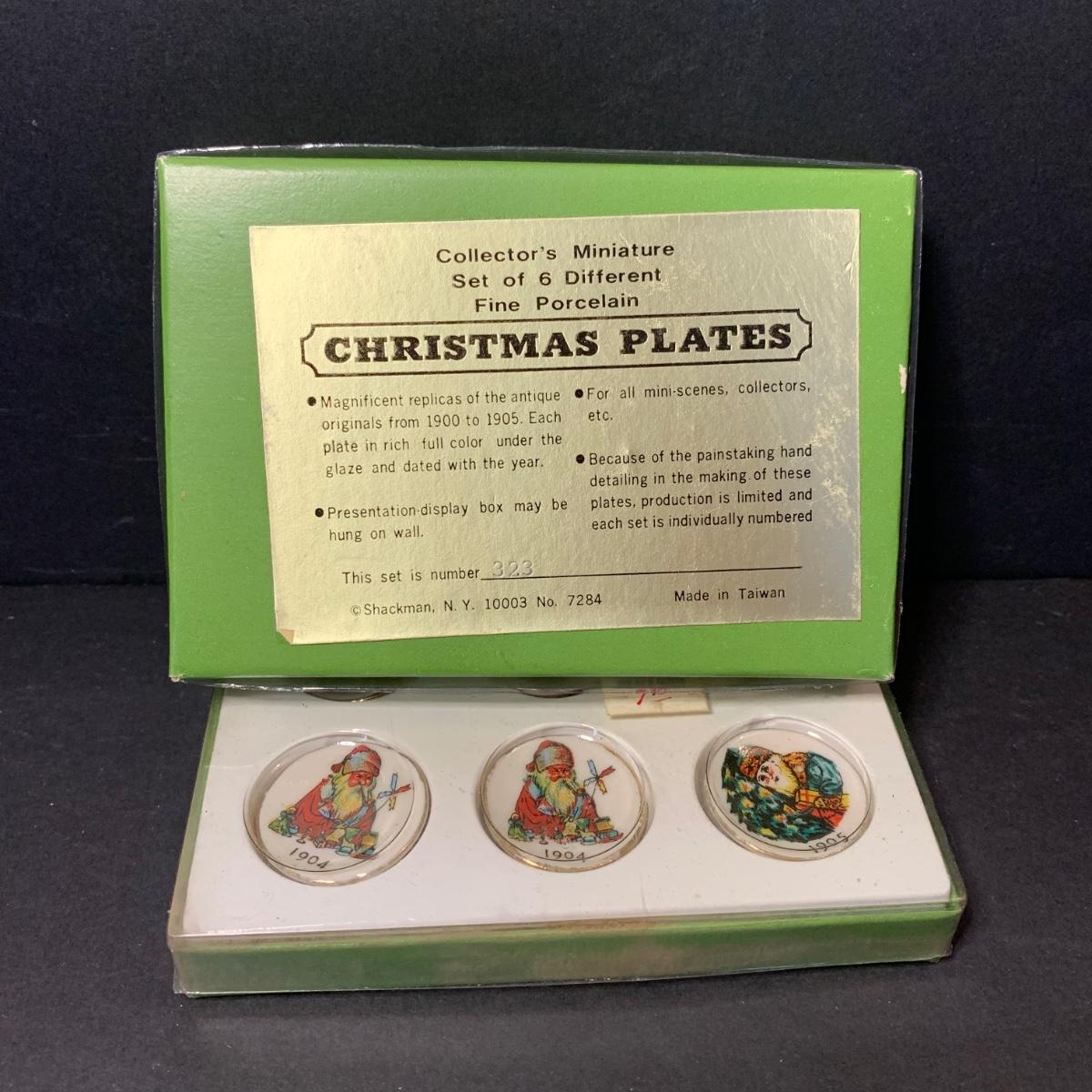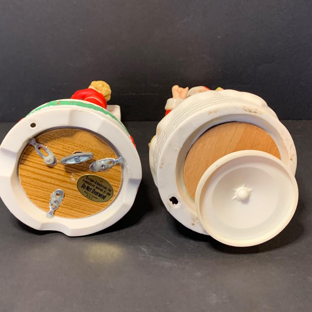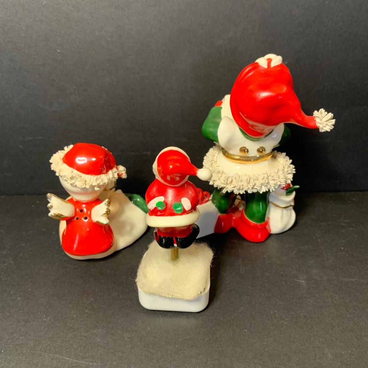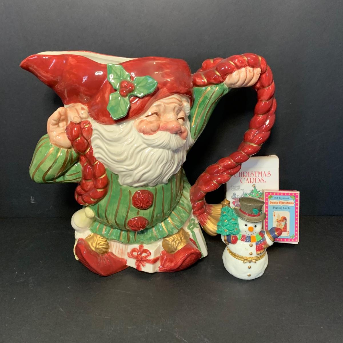 LOT  79R: Vintage Christmas & More: Spaghetti Trim Figures, Fitz & Floyd Pitcher, Miniature Porcelain Plates &  Music Boxes