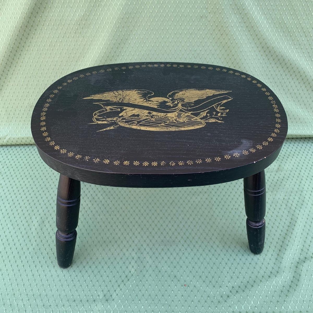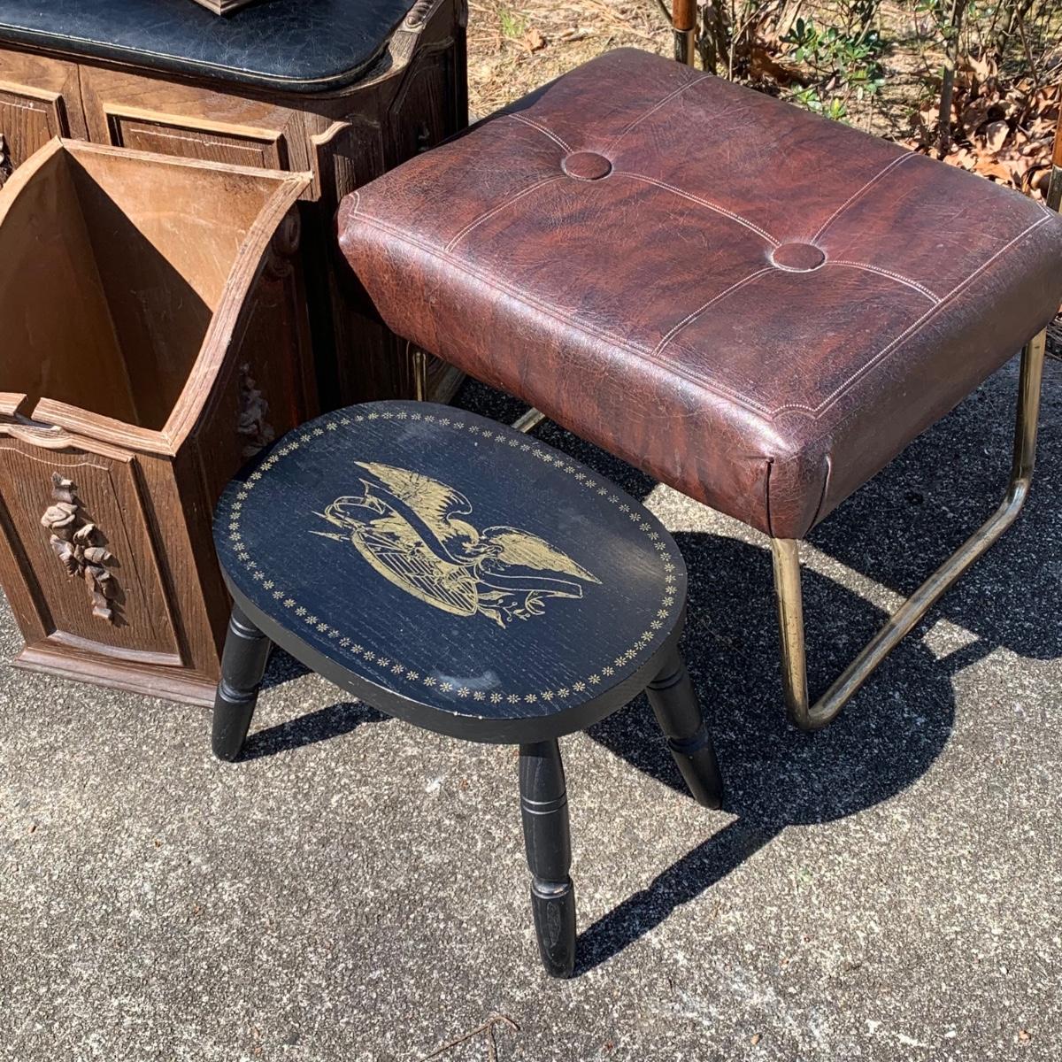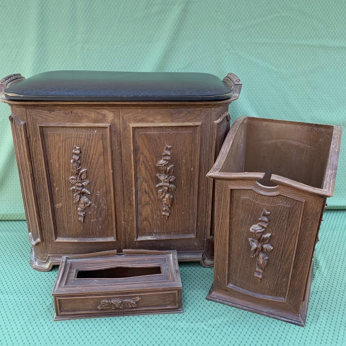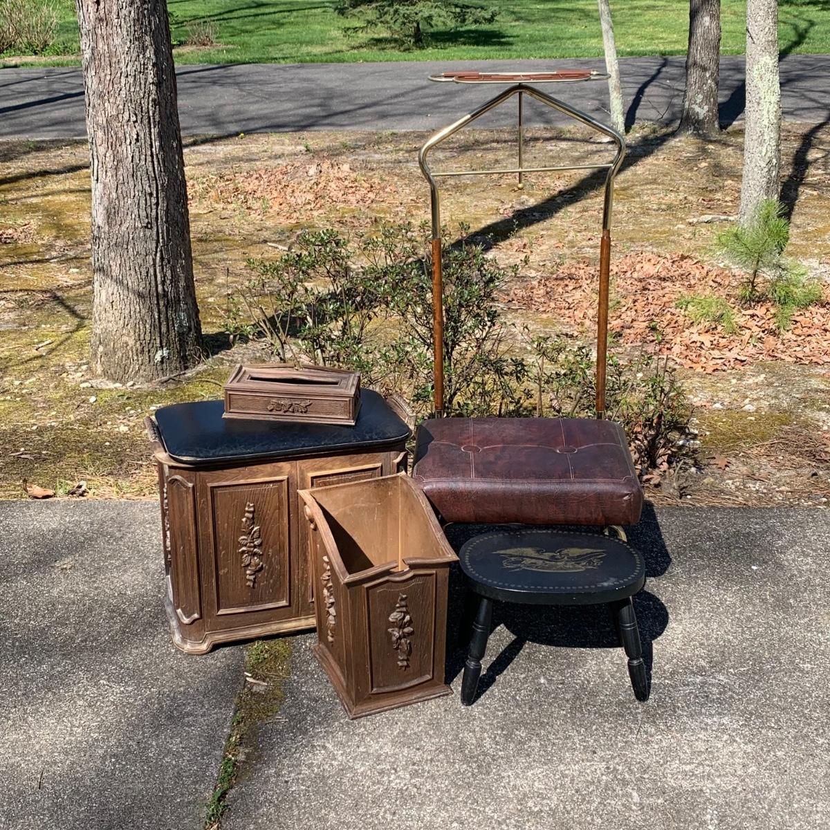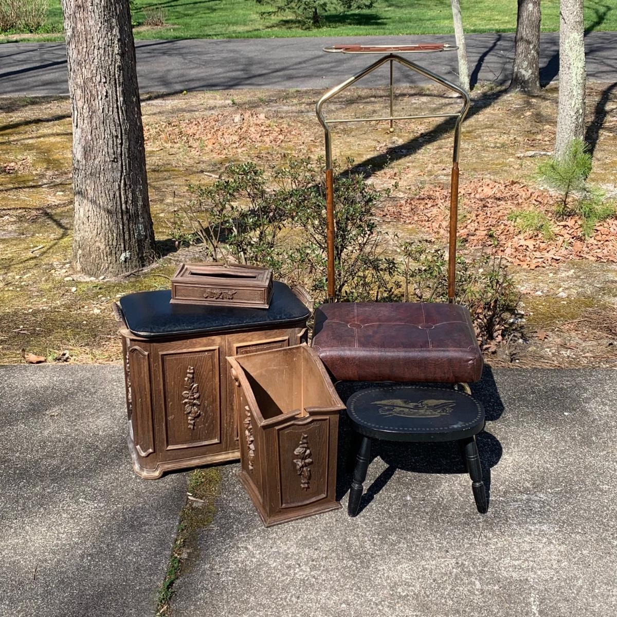 LOT 89: Vintage Black Step Stool, MCM Valet Stand/Butlers Seat & Wood-like Plastic Bathroom Accessories