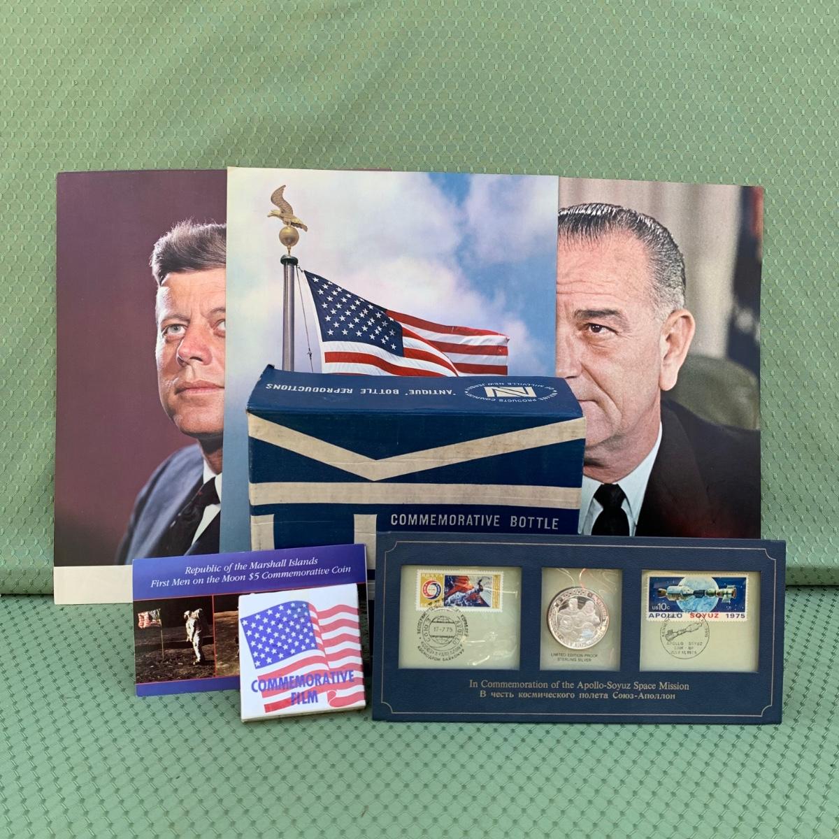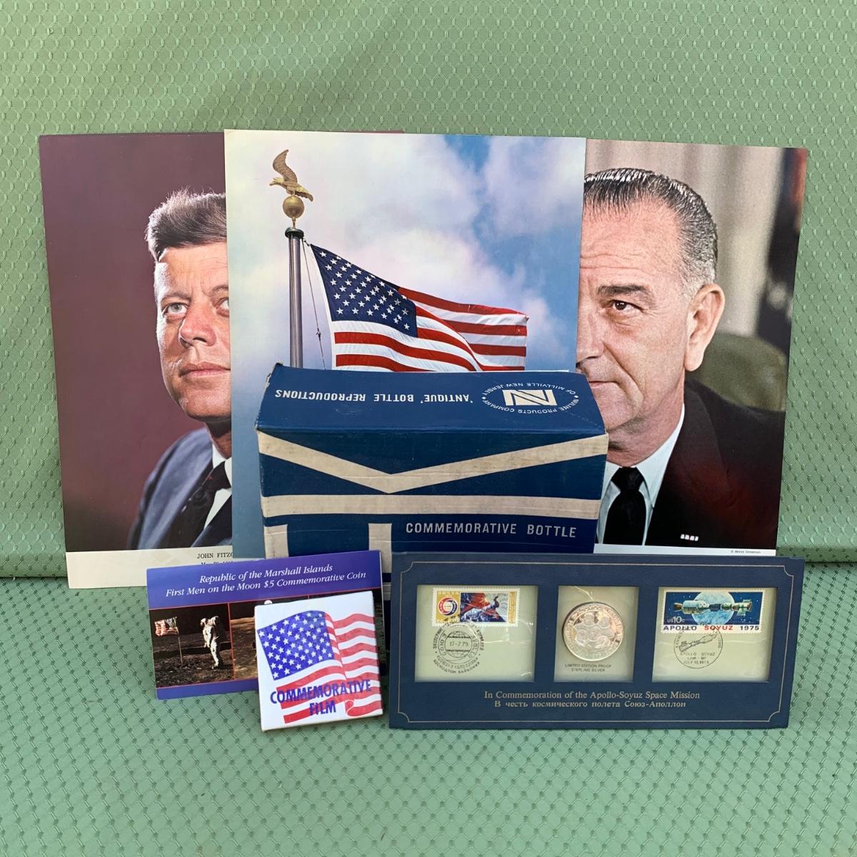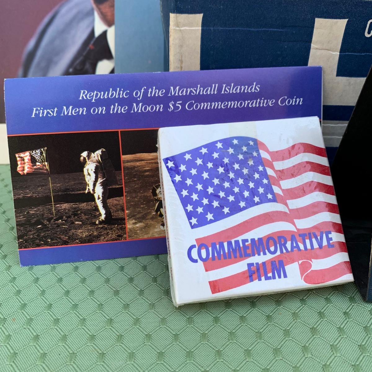 LOT 94R: Patriotic Collection:Apollo  Space Mission Sterling Silver Coin & Stamp Set "First Men On The Moon" $5 Commemorative Coin in Paper Sleeve & More