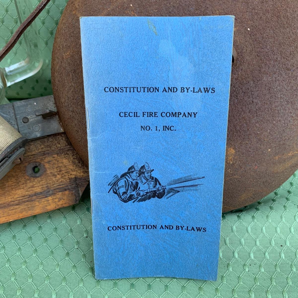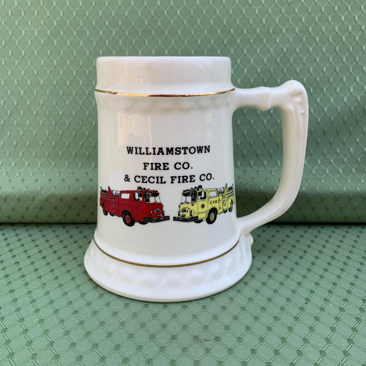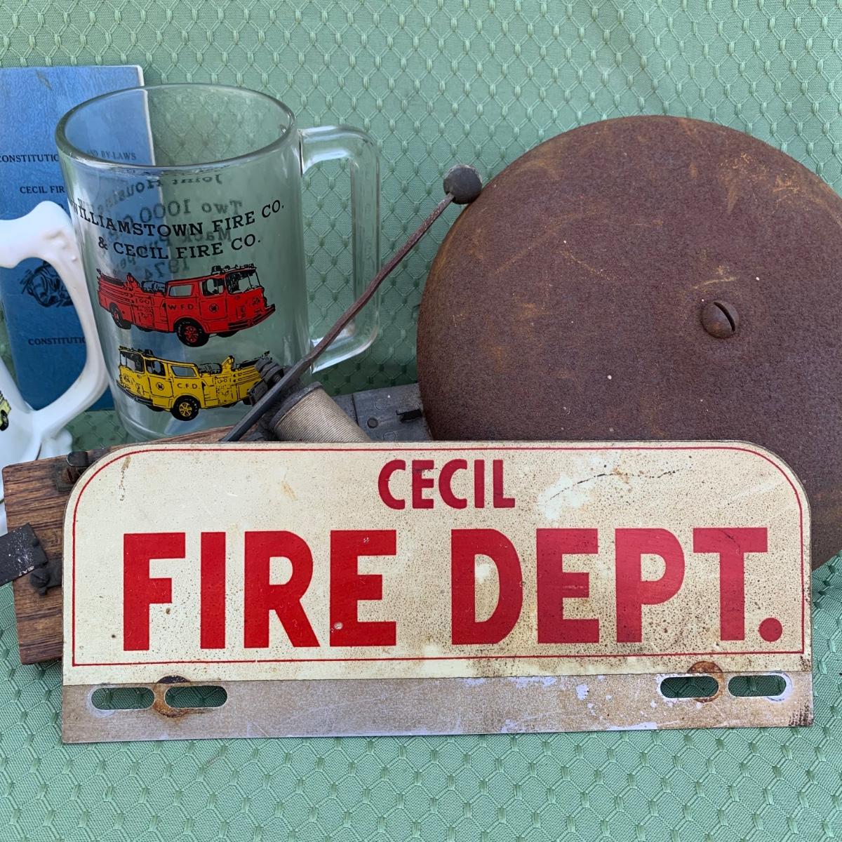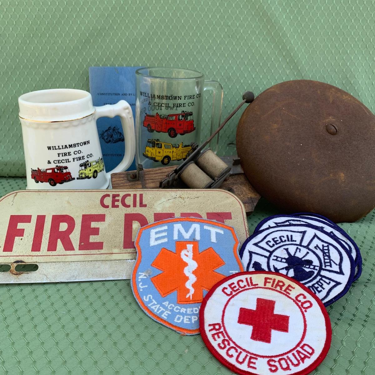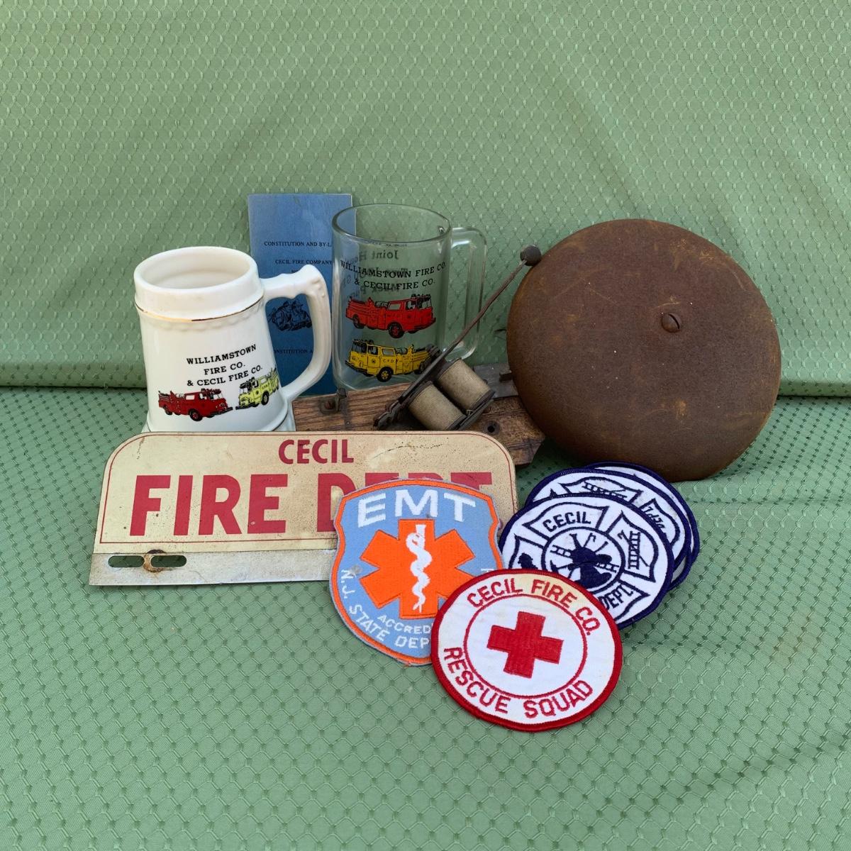 LOT 95R: Vintage Alarm Bell, Williamstown & Cecil Mugs, Patches, Fire Company Constitution & By-Laws Booklet
