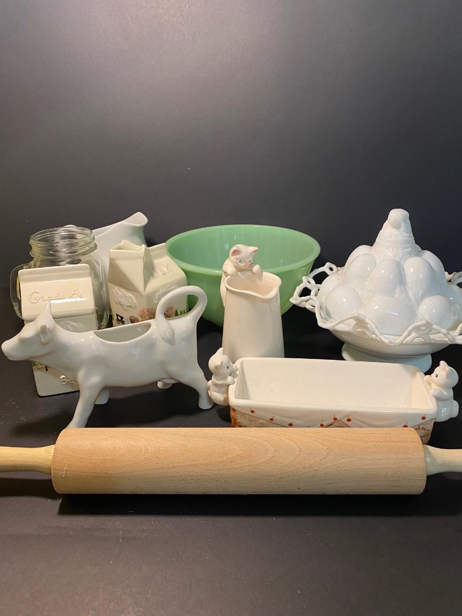 LOT 115: Cow creamer, Kitten Creamer & Butter Dish, Chick Covered Dish and More