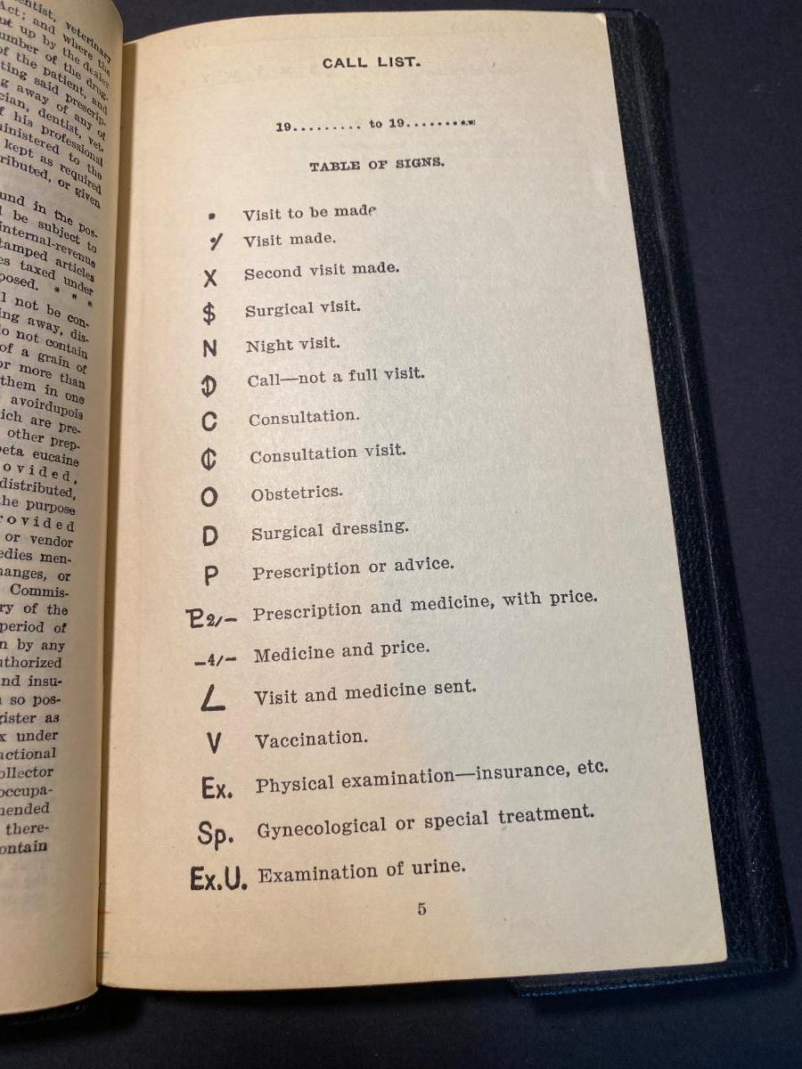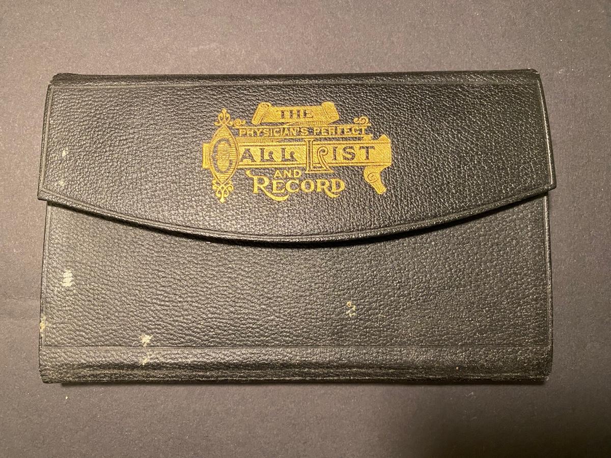 Unique lot of physicians finds. Drs home visits log book, wooden physician, bank book and other medical finds.