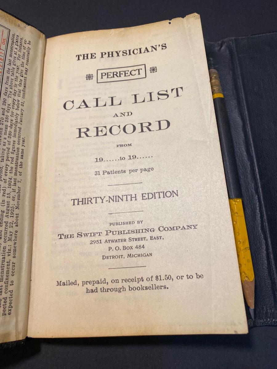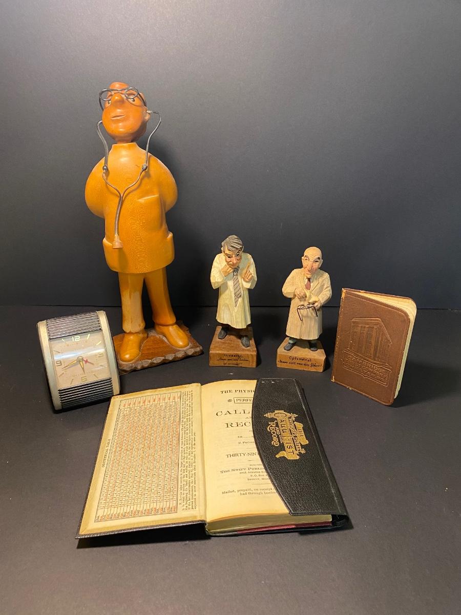 LOT 118: The Physicians Perfect Call List and Record Book, , Westclox Clock, Wooden Sculptures