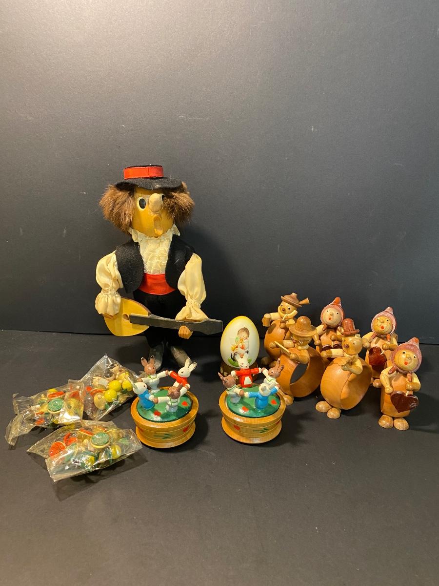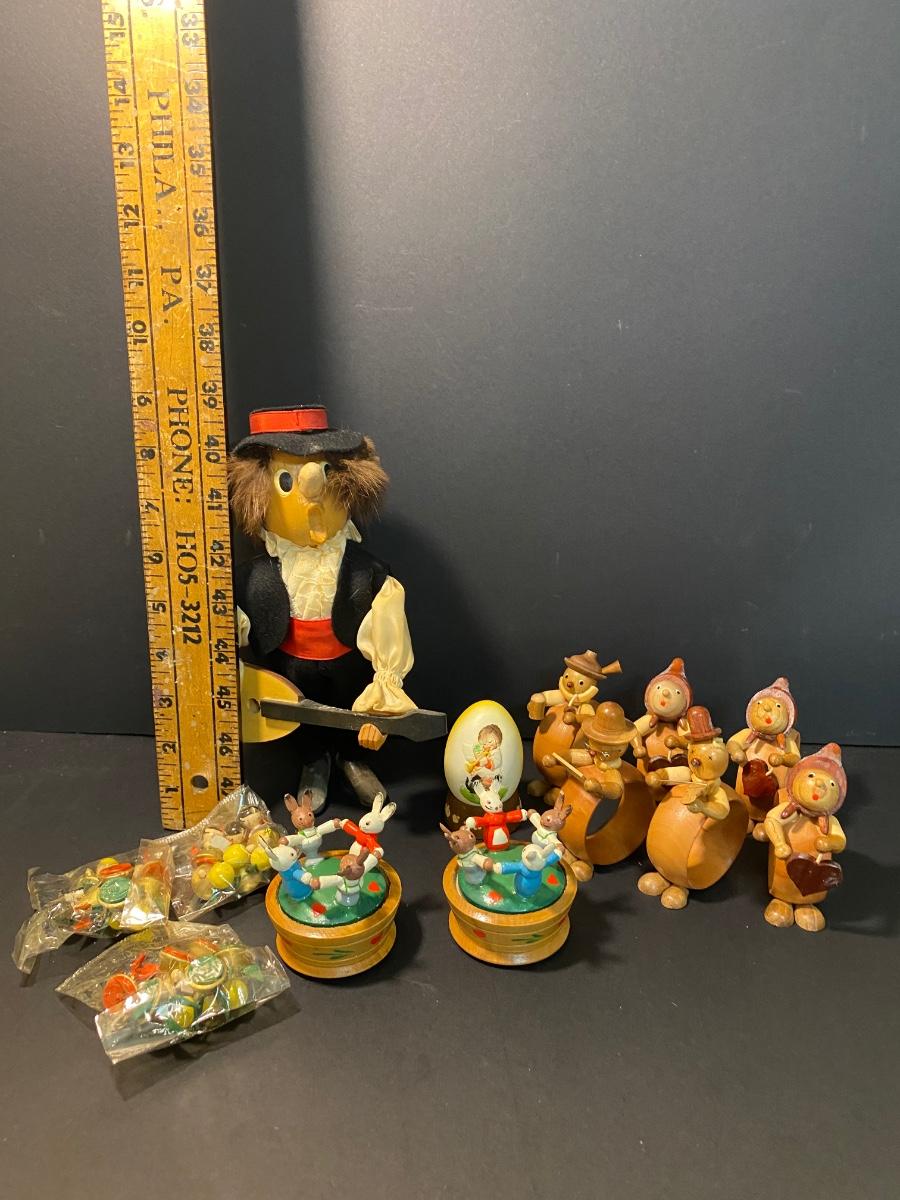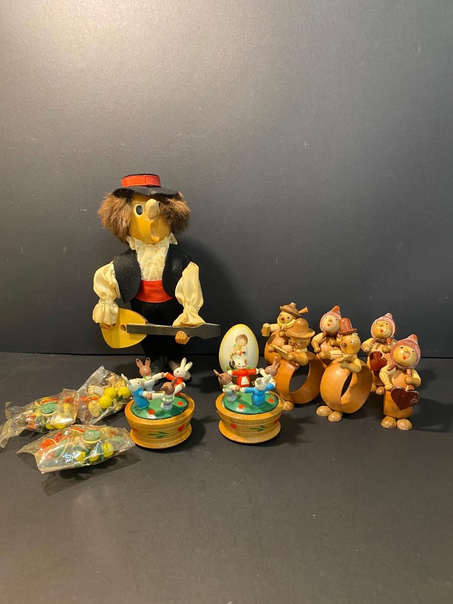 LOT 140: ANRI Wooden Musician, ANRI Wooden Egg w/Stand, Made in Italy Napkin Rings & More