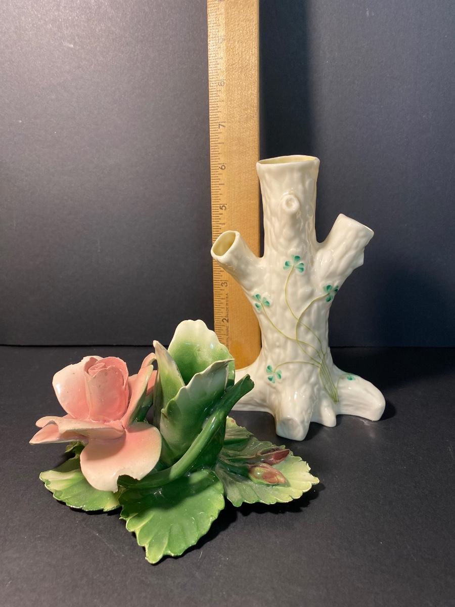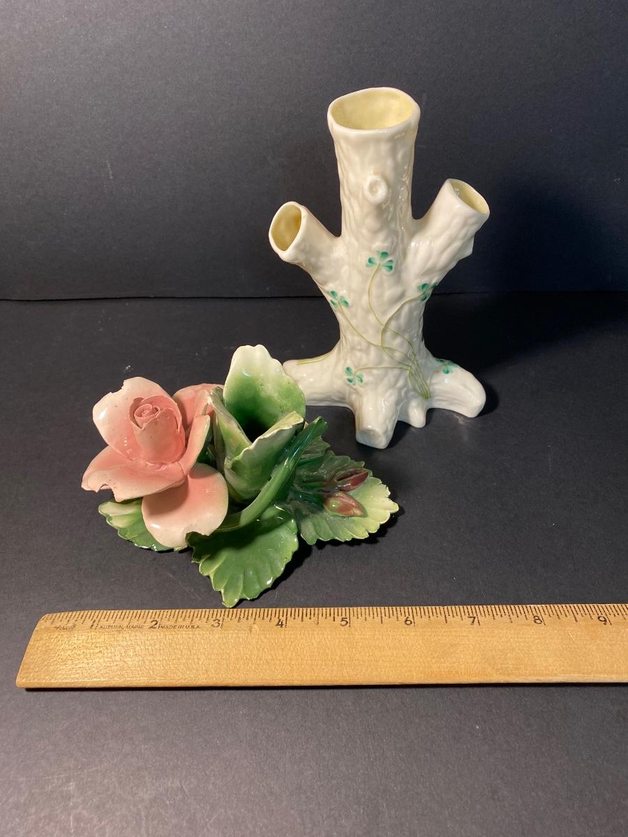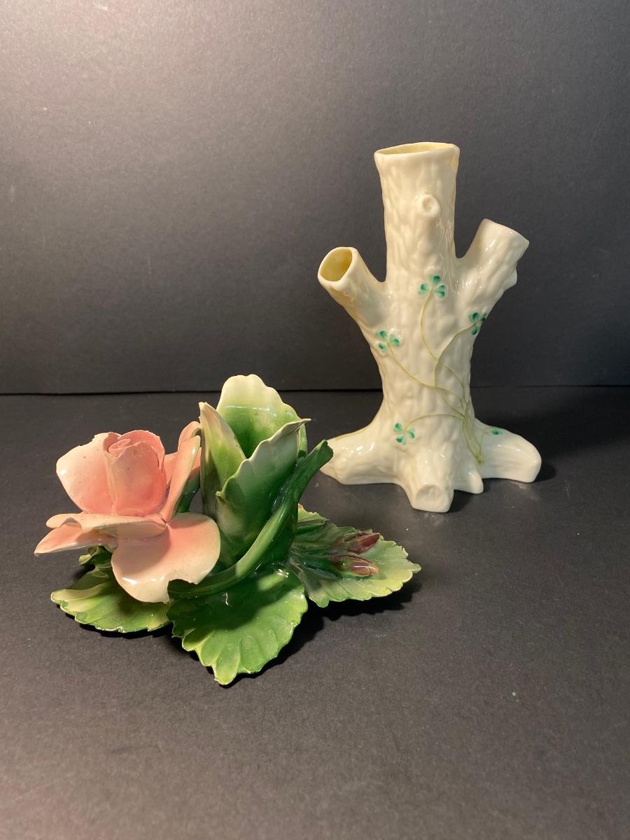 LOT 147: Capodimonte Rose Porcelain Sculpture & Belleek Vase