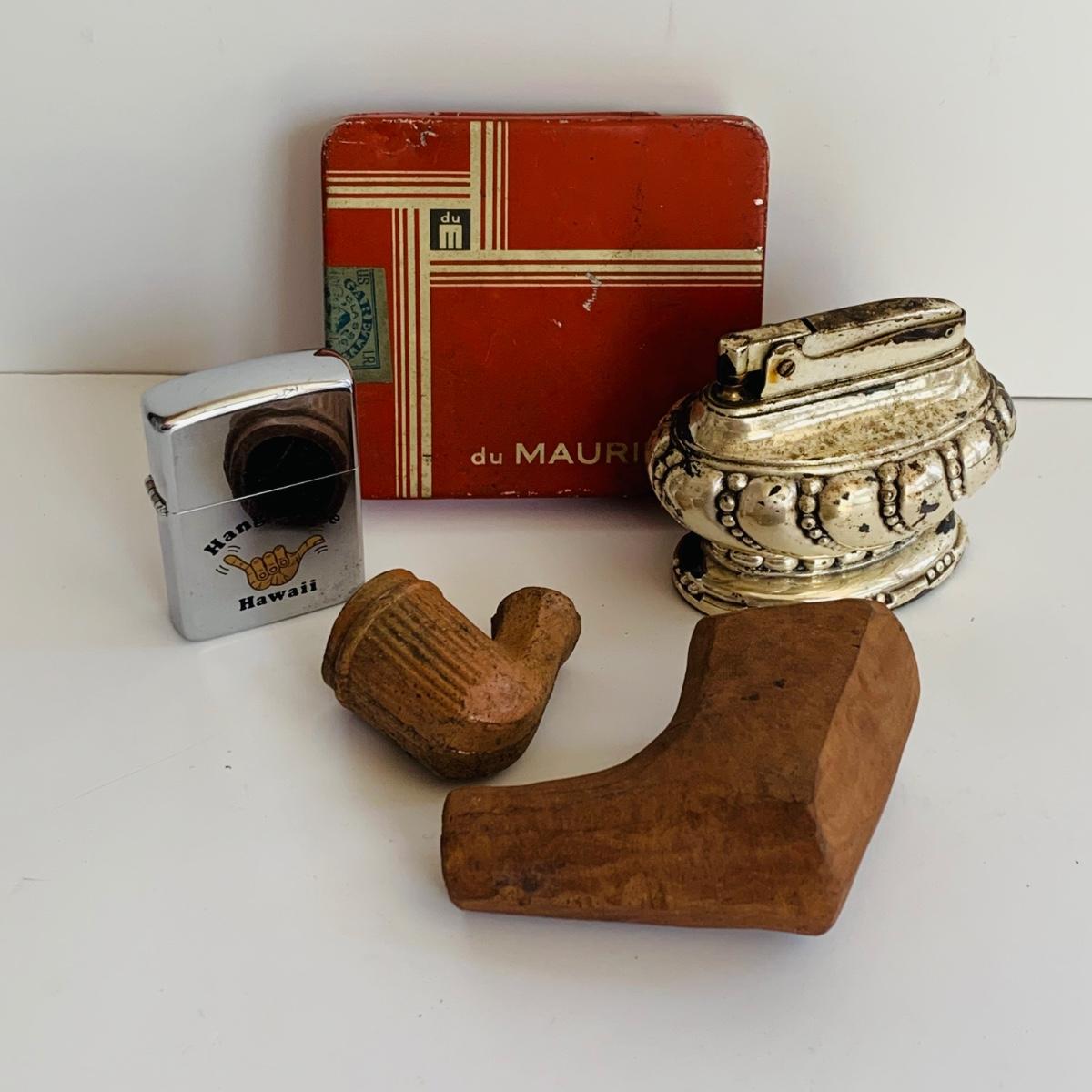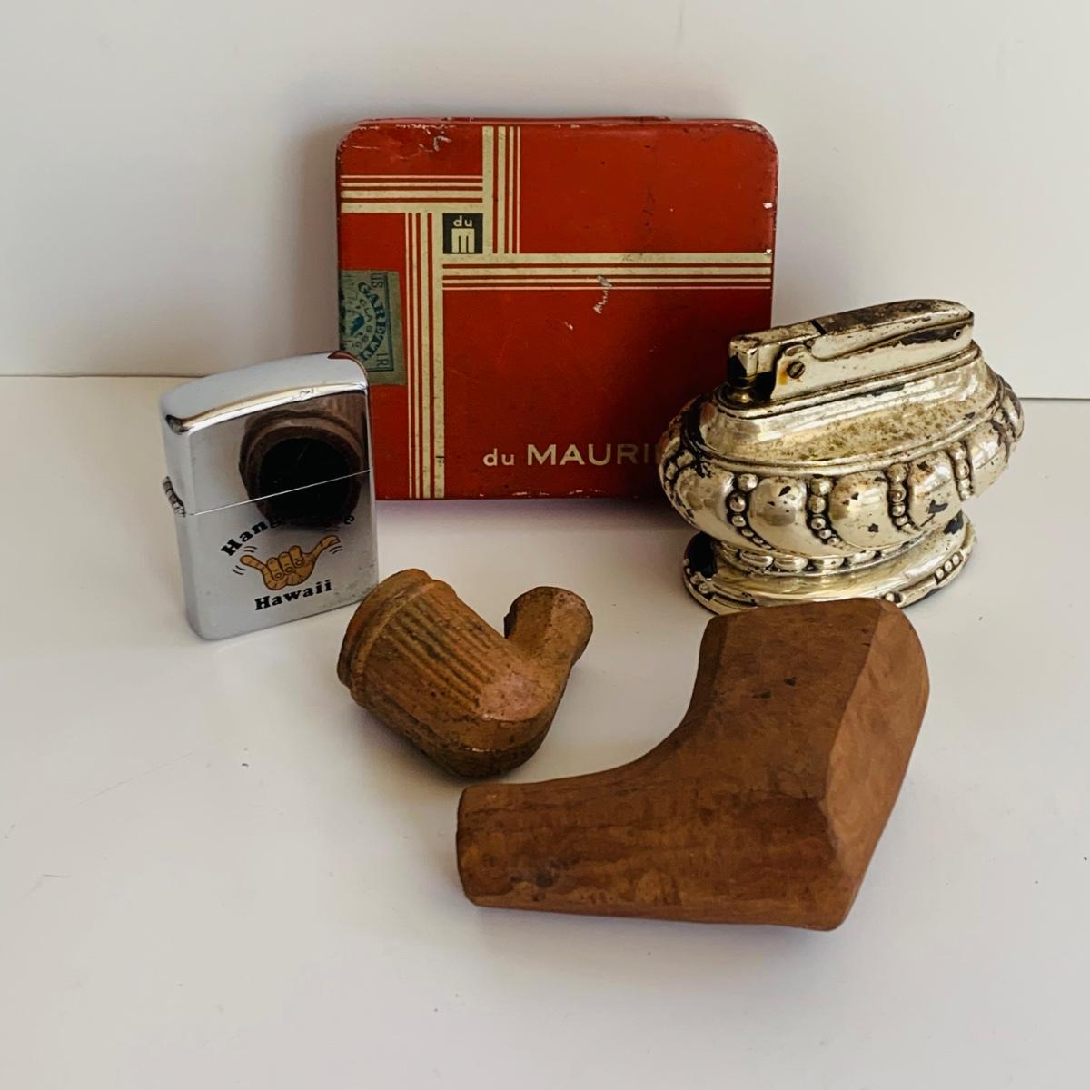 LOT 502: Vintage de Maurier Tobacco Tin,  Ronson Lighter, Zippo "Hang Loose" Lighter & Pipe Bowls Stummels