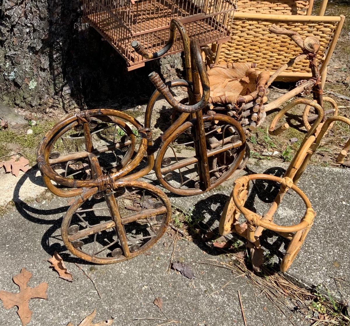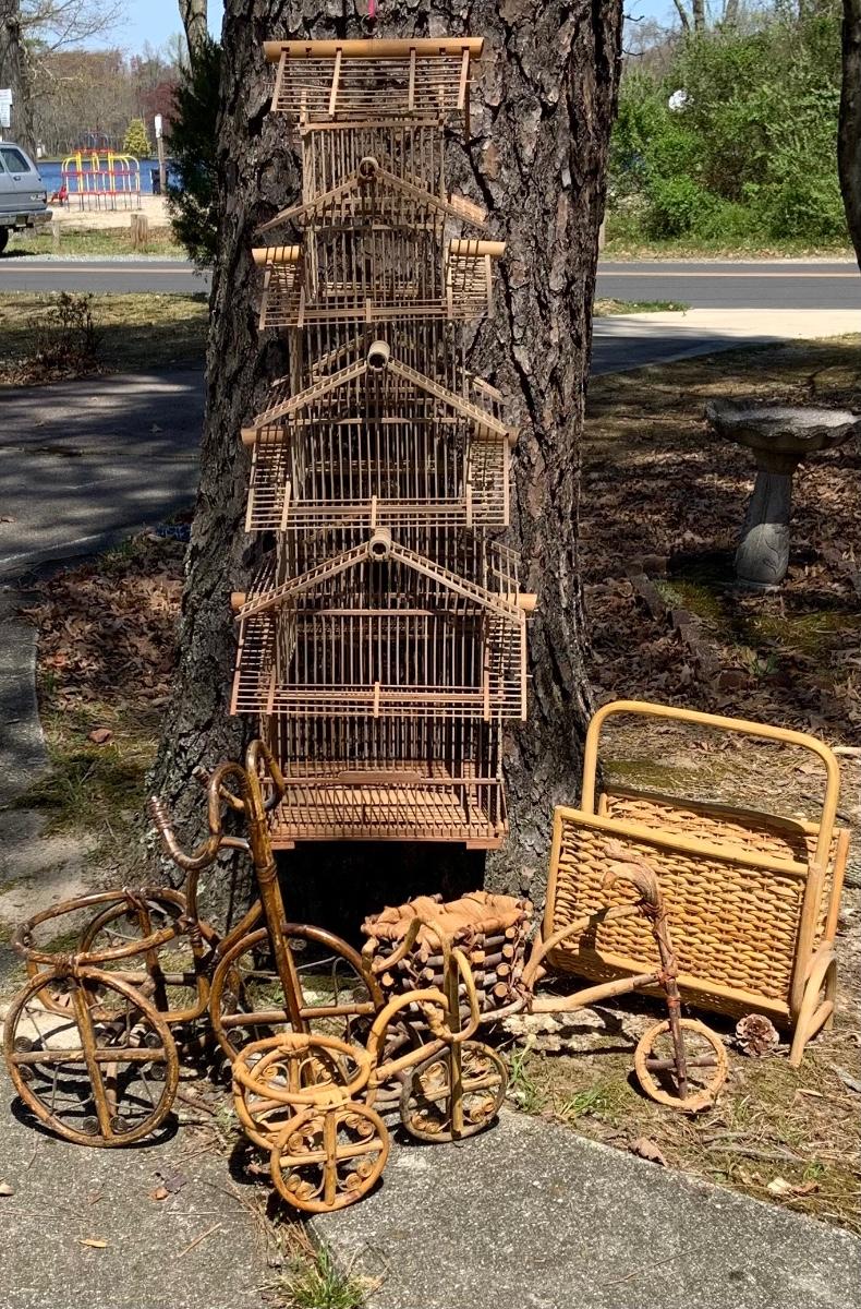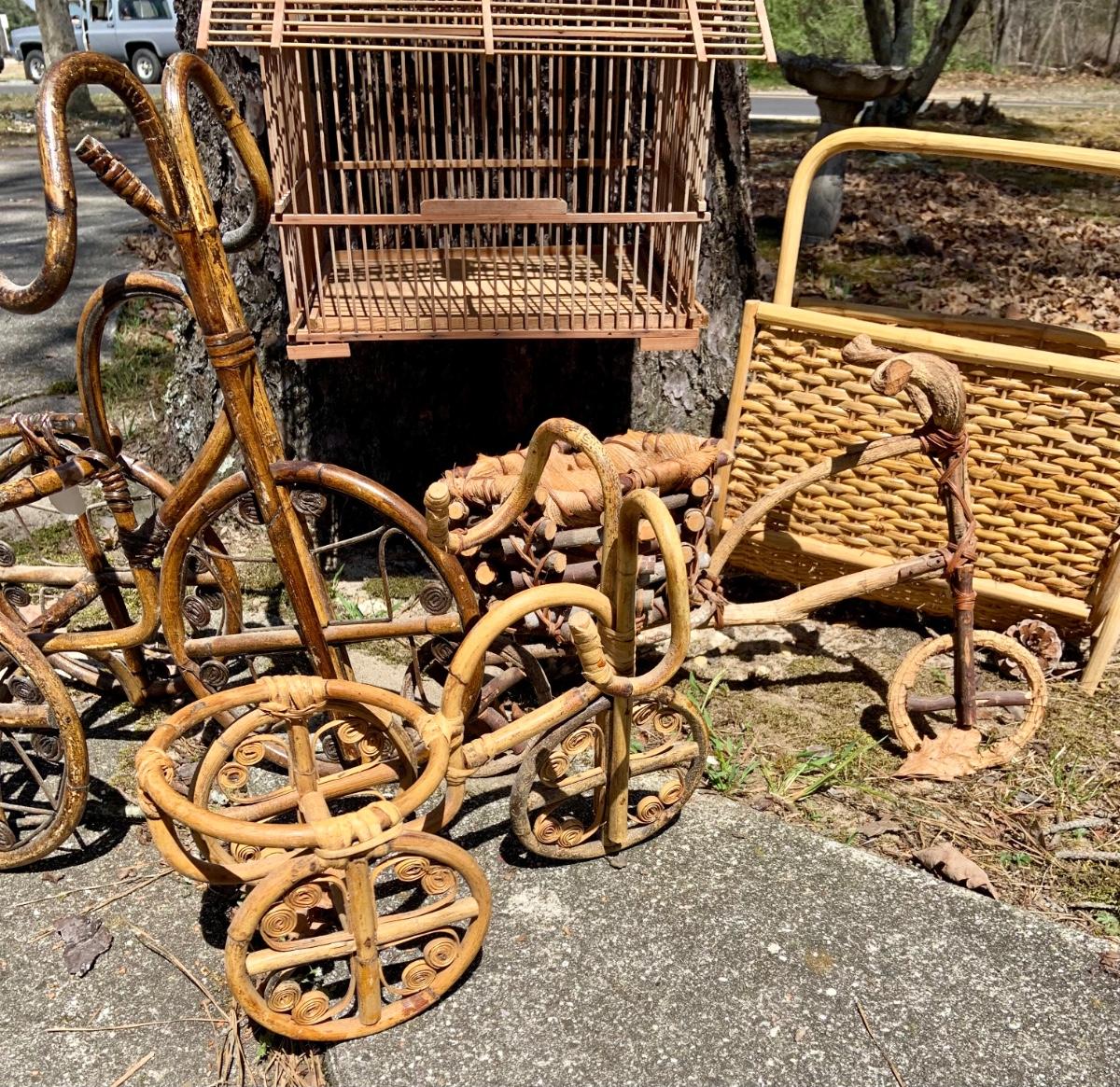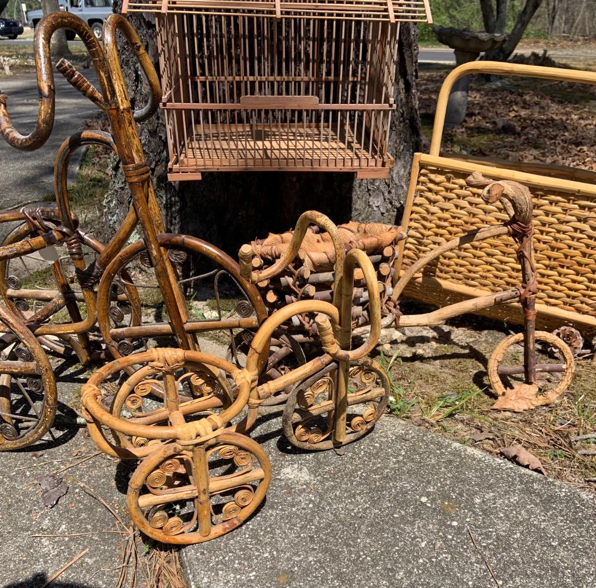 LOT:167G: Wicker Collection including a Bird Cage, Bicycle Shaped Planters and Magazine Rack