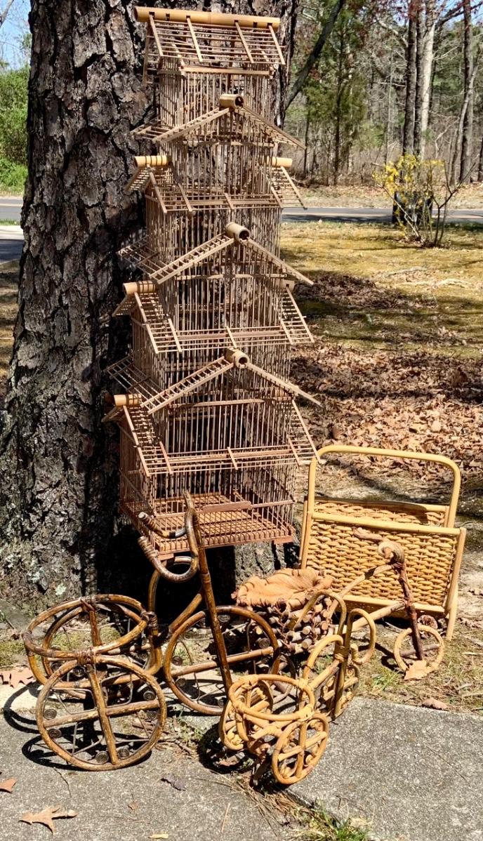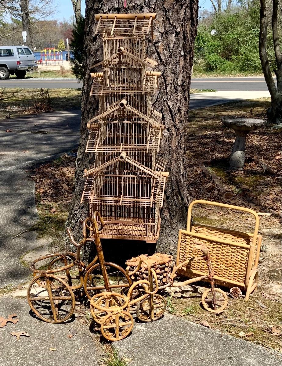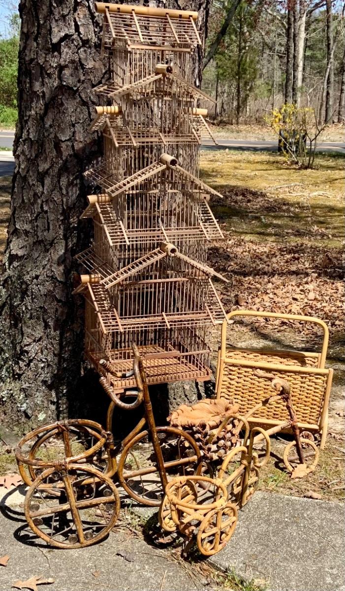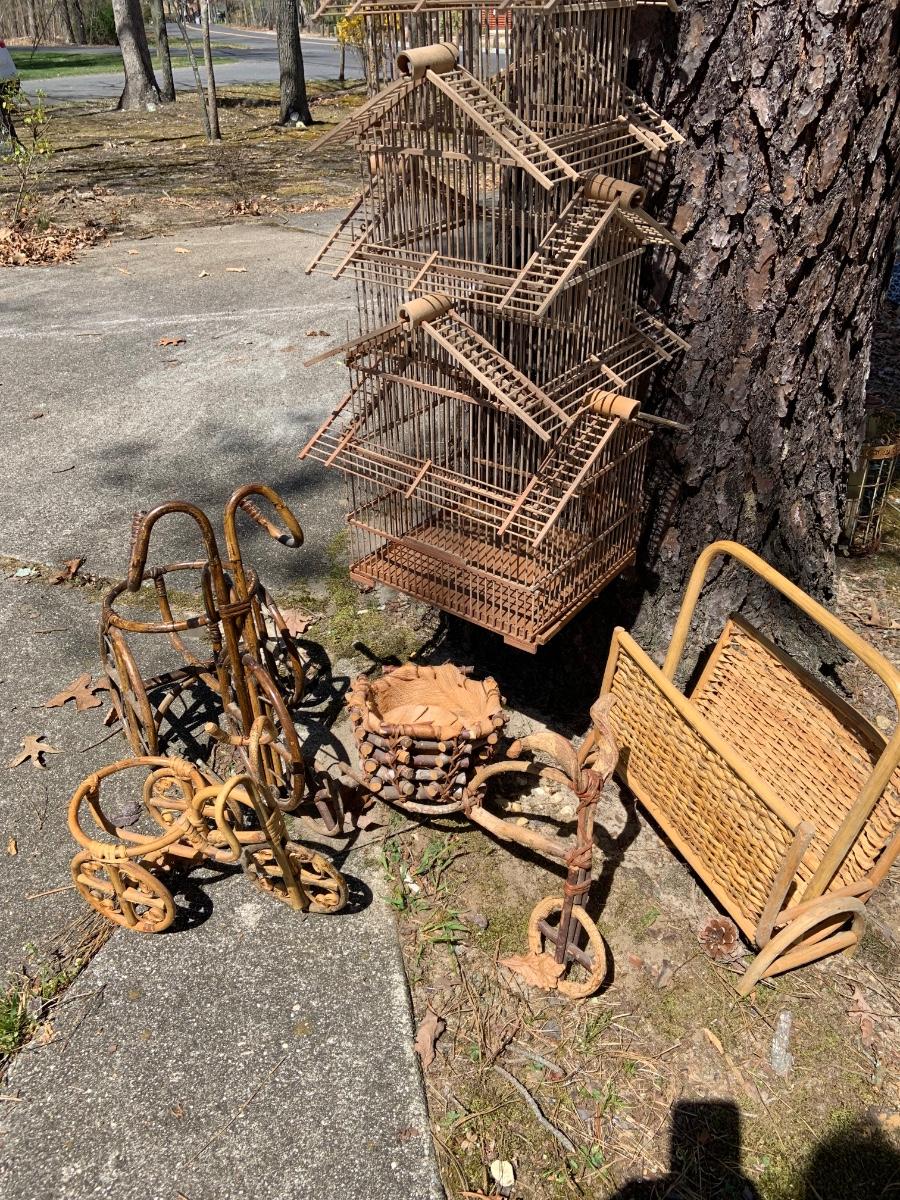 LOT:167G: Wicker Collection including a Bird Cage, Bicycle Shaped Planters and Magazine Rack