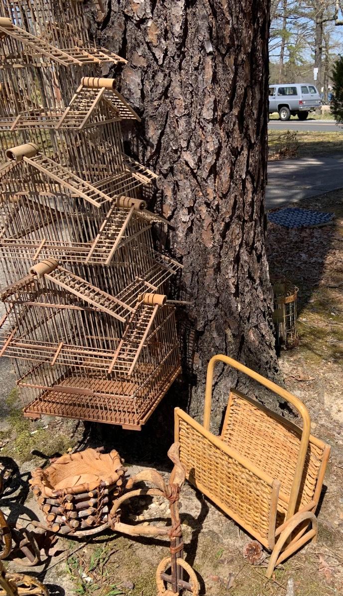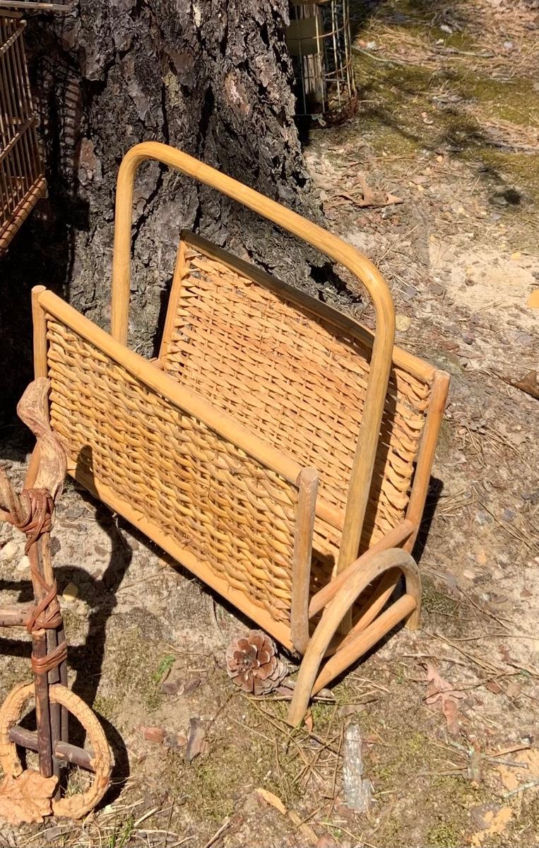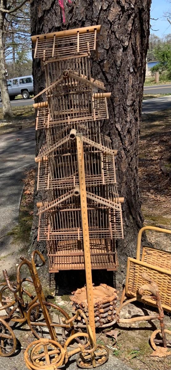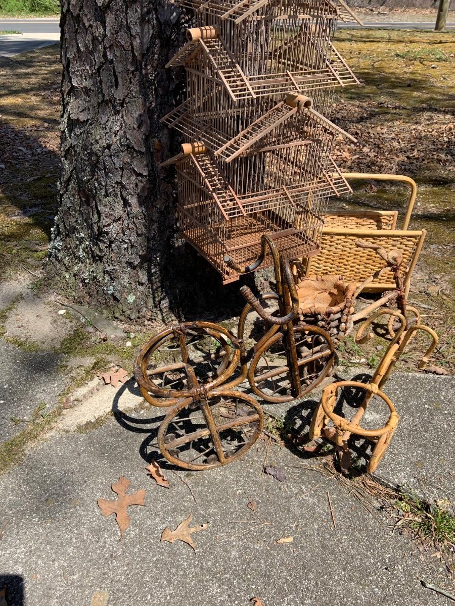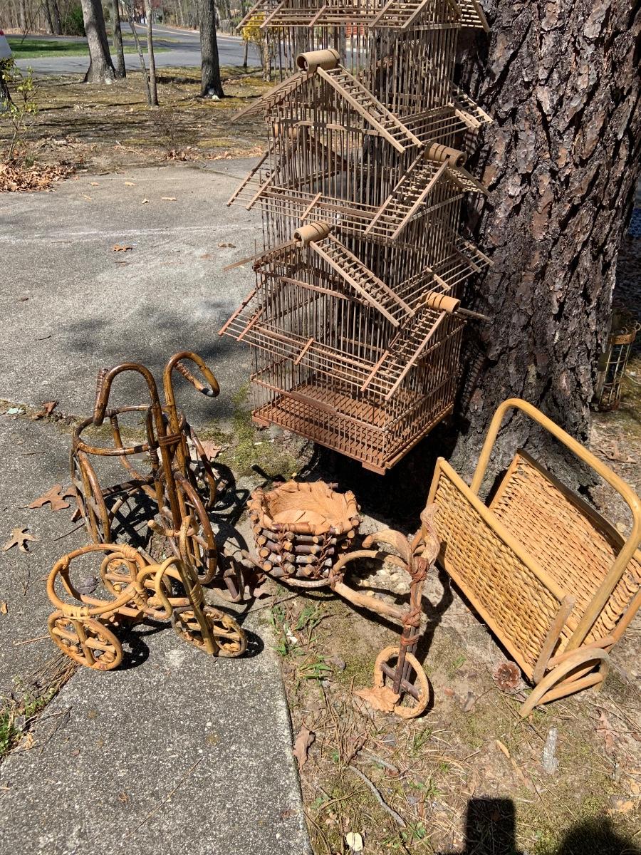 LOT:167G: Wicker Collection including a Bird Cage, Bicycle Shaped Planters and Magazine Rack