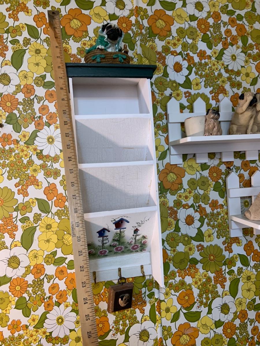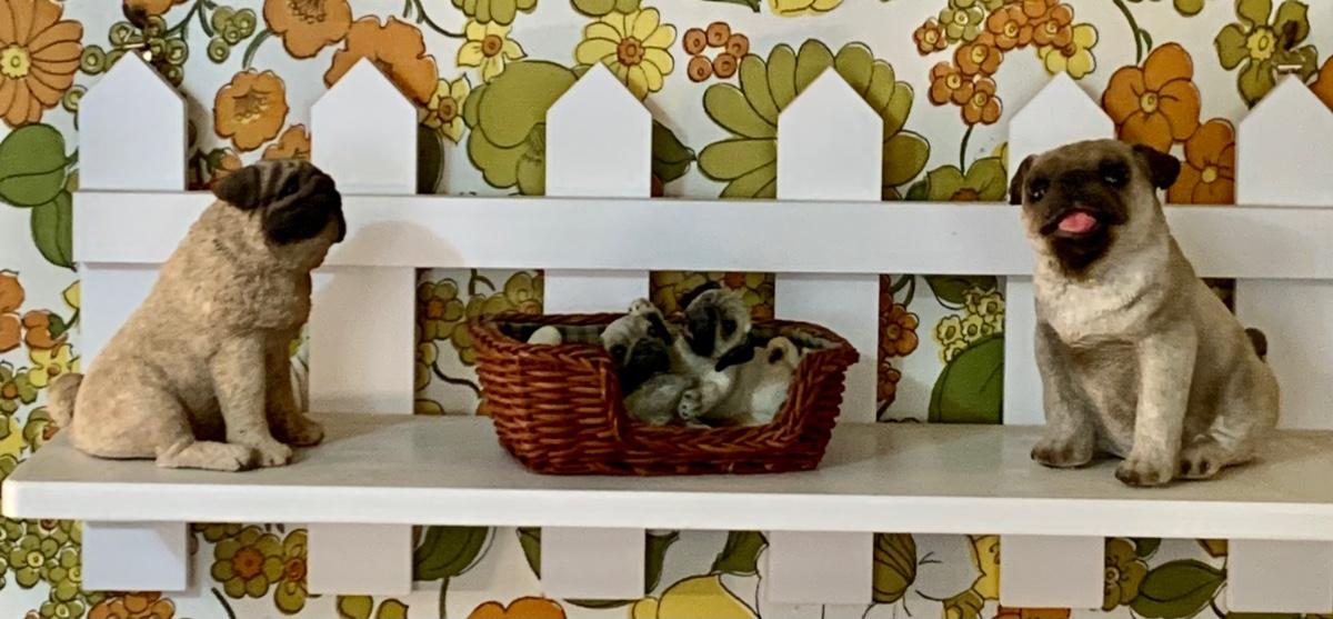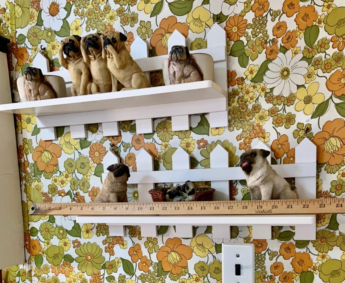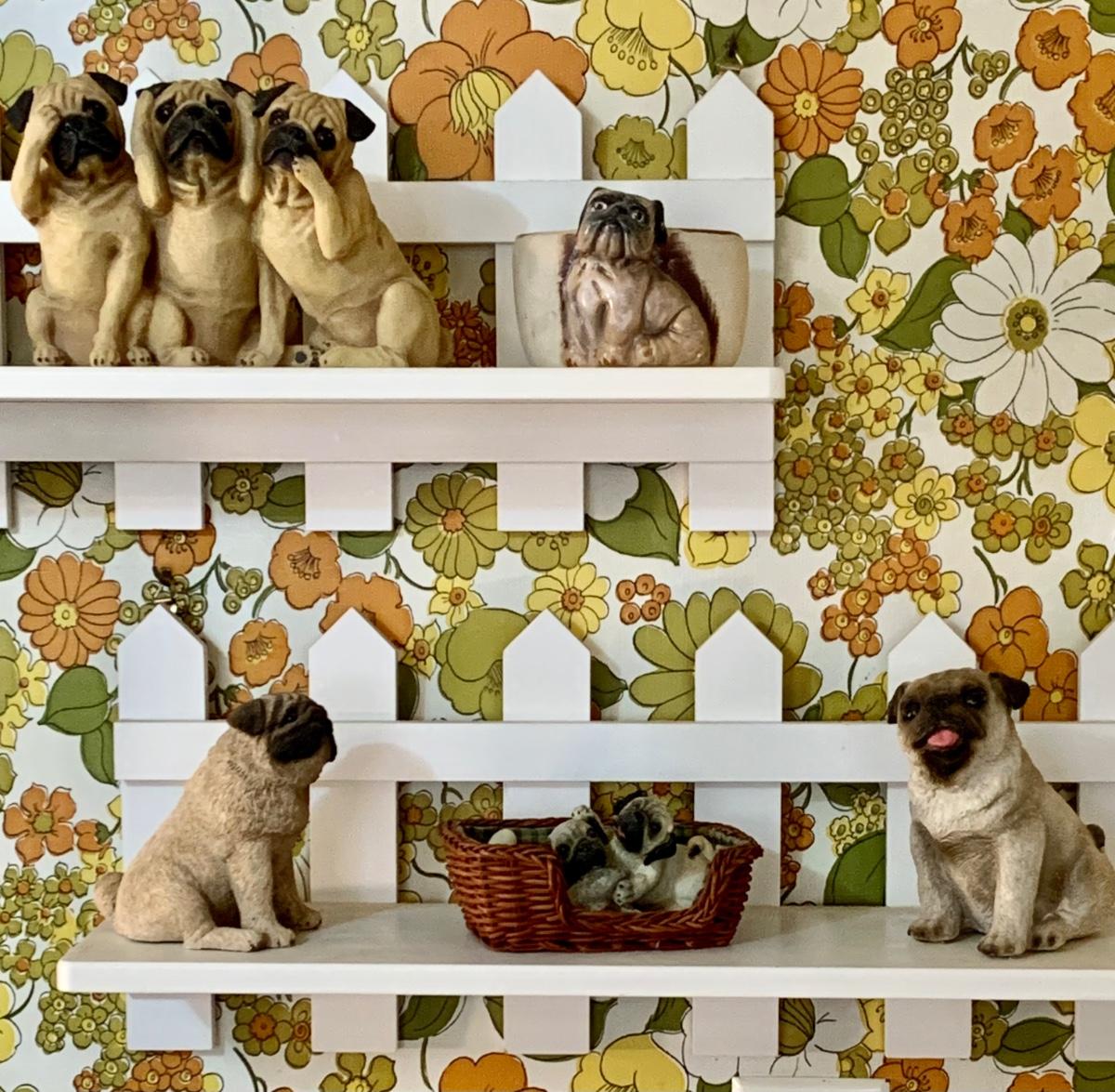 LOT:178G: 2 Fence Shaped Shelves and a Mail Hold with a Collection of Pug Figurines