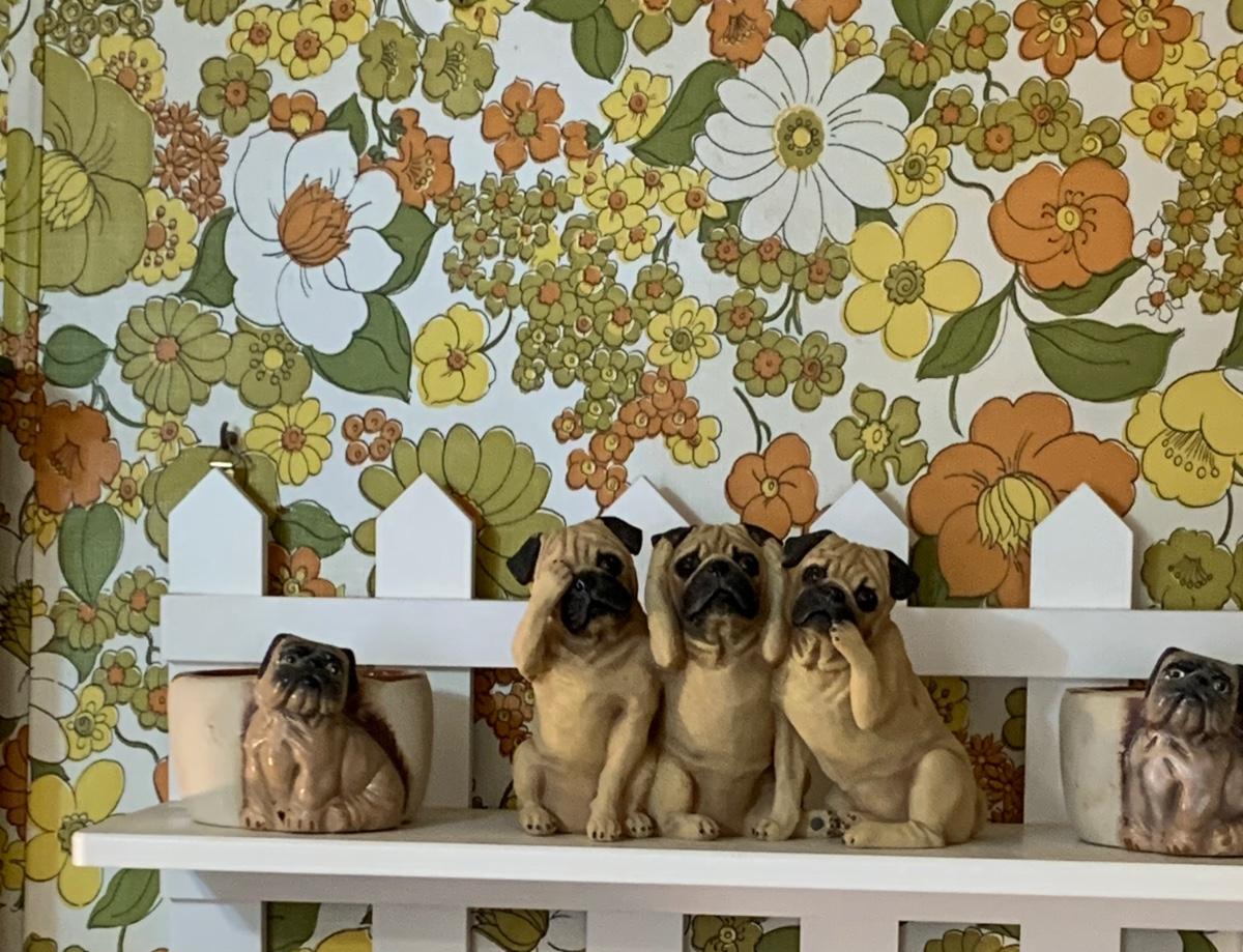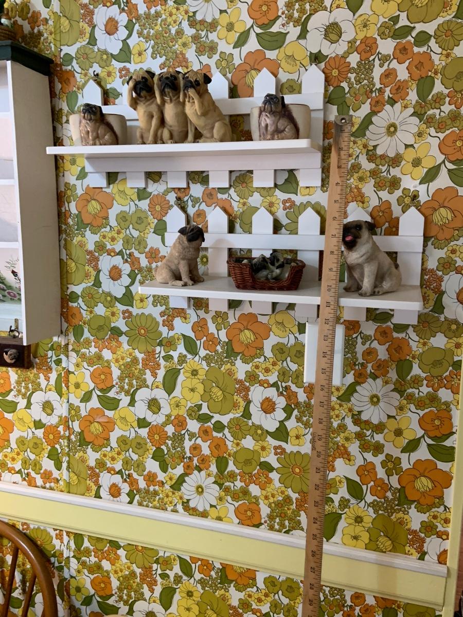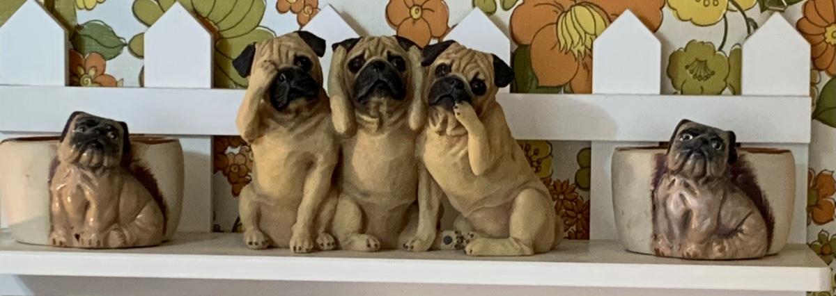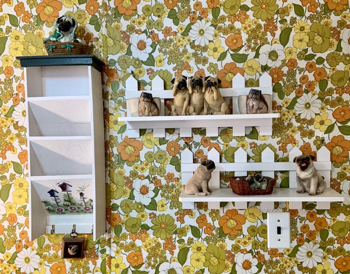LOT:178G: 2 Fence Shaped Shelves and a Mail Hold with a Collection of Pug Figurines