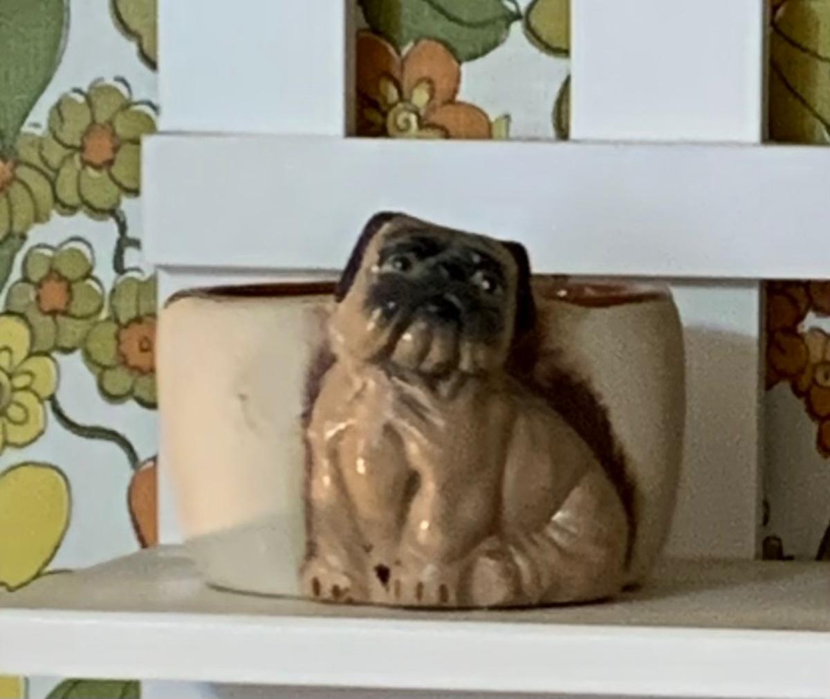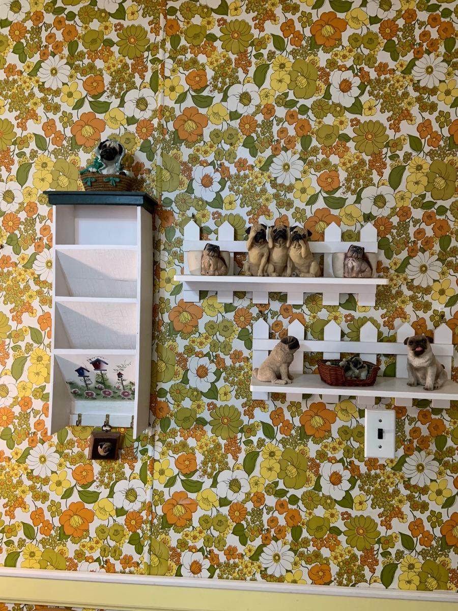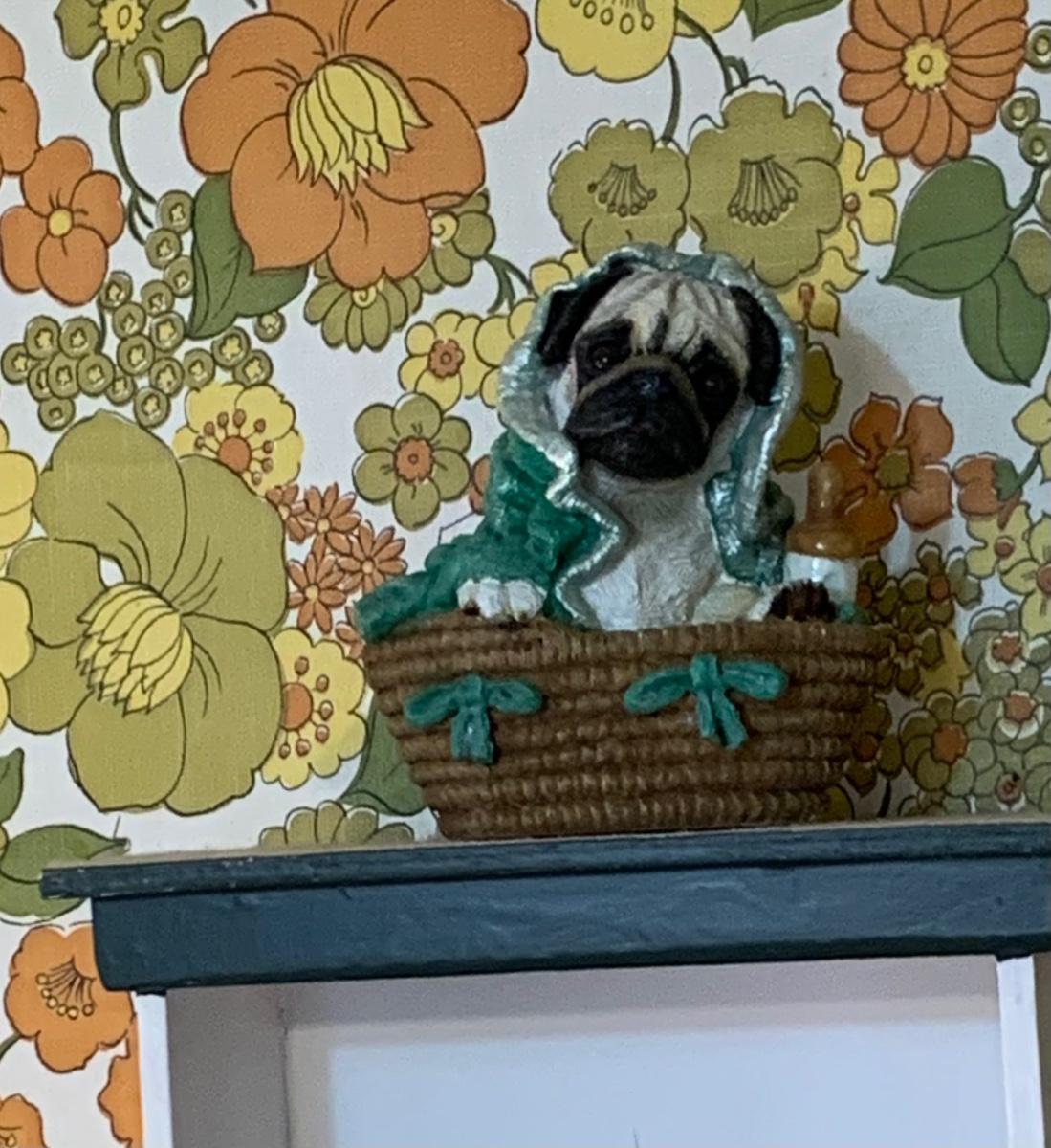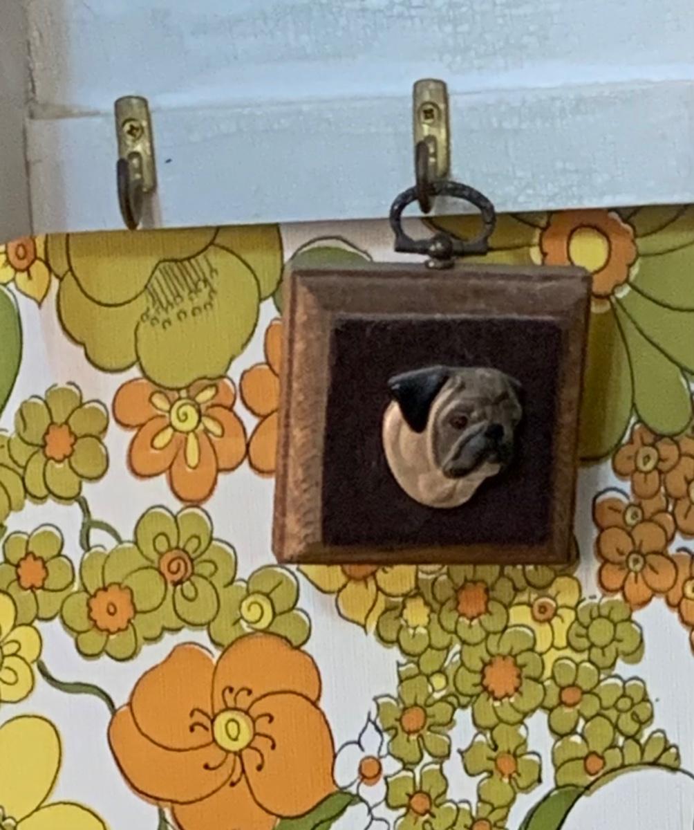 LOT:178G: 2 Fence Shaped Shelves and a Mail Hold with a Collection of Pug Figurines