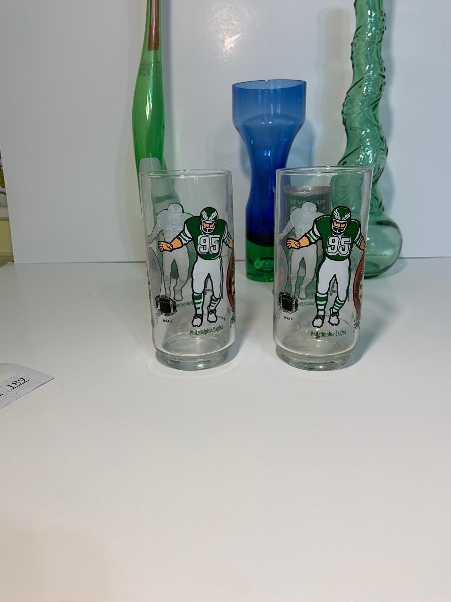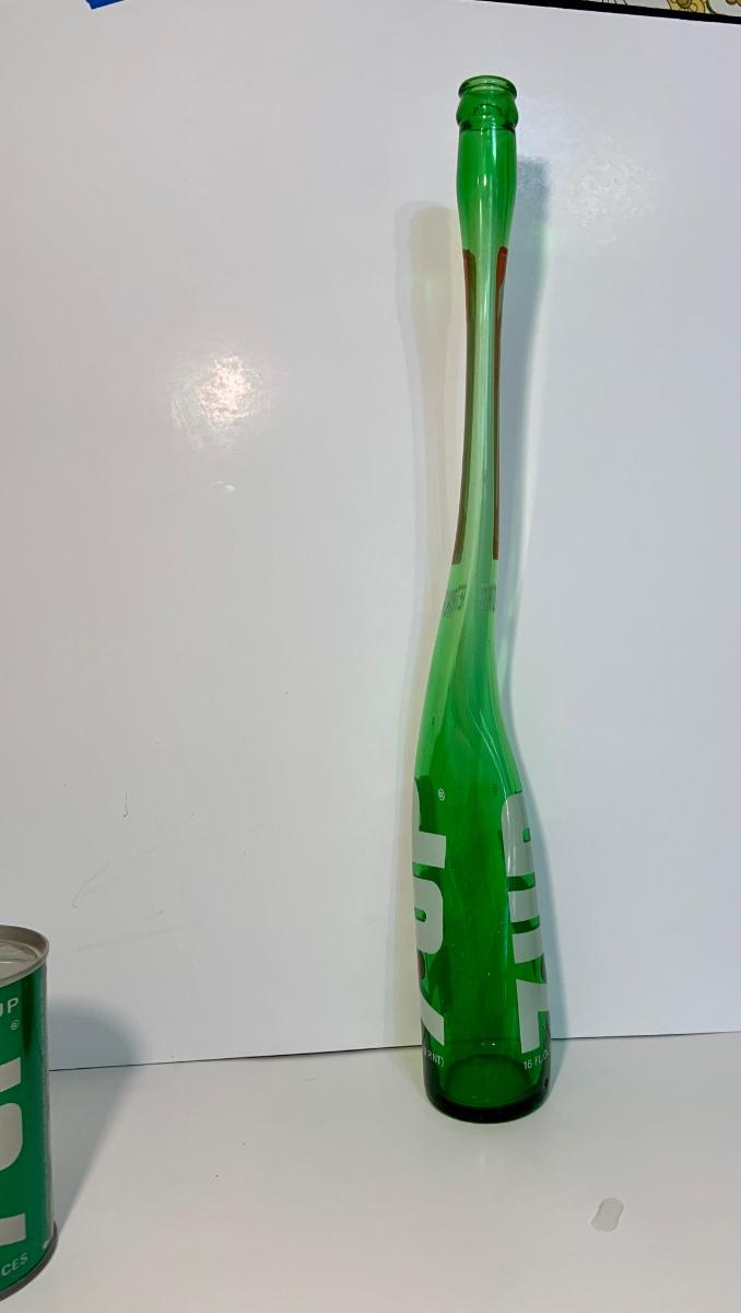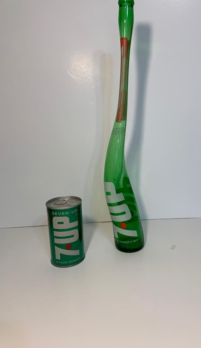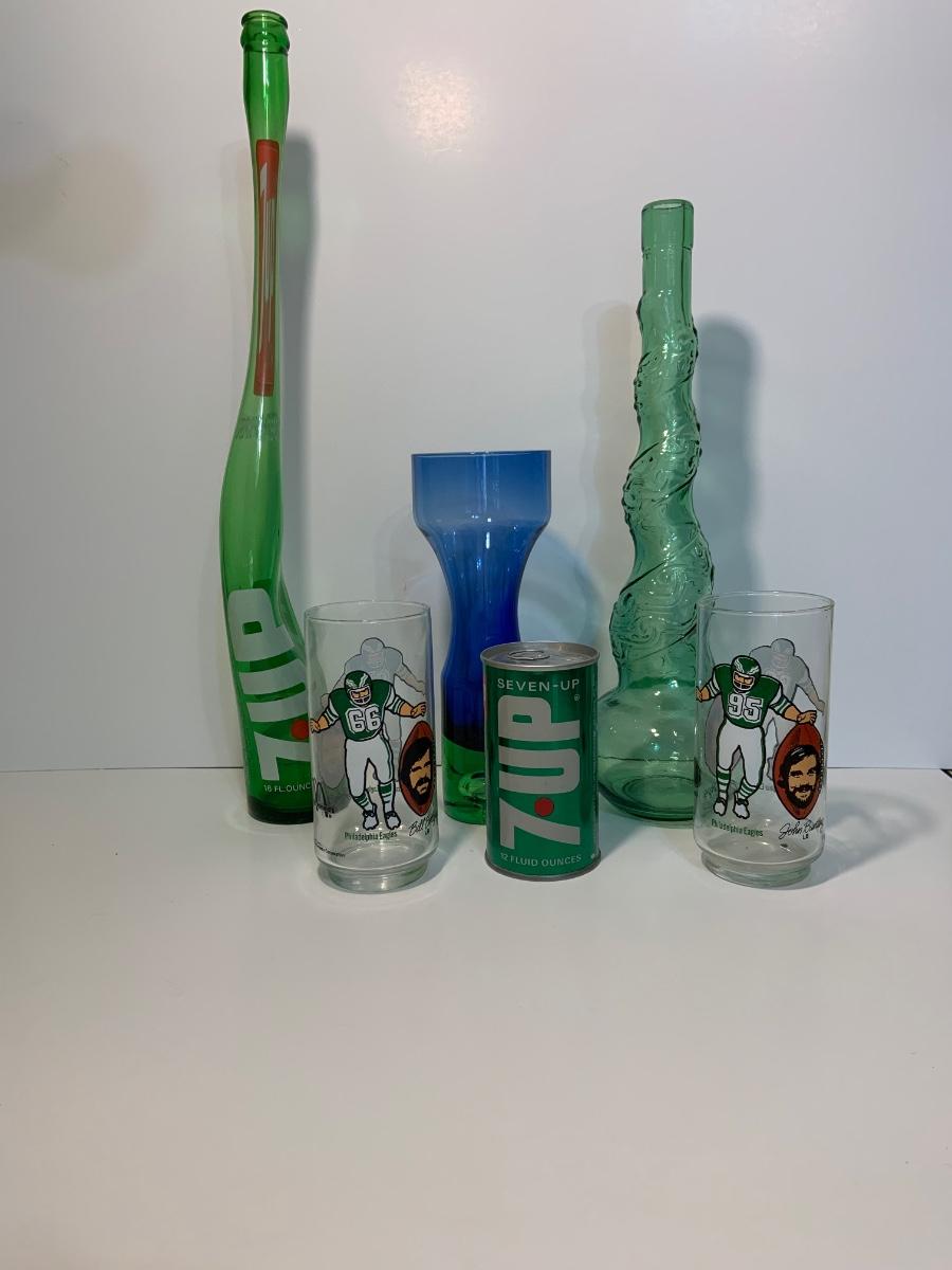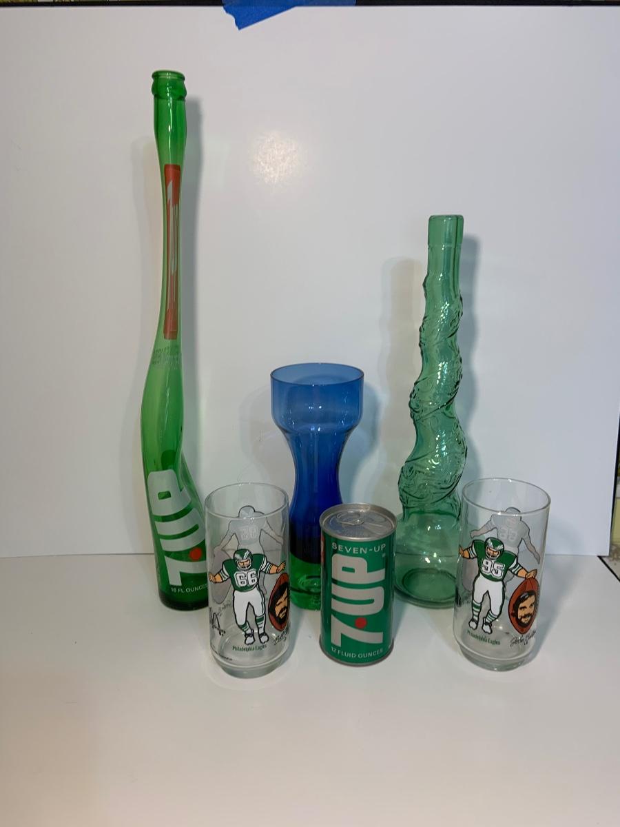 LOT::183G: Classic 7-UP Pulled Green Glass Bottle; a Faux 7-UP Can Music Box; Two 1980McDonalds Phildelphia Eagles Glasses, and more.