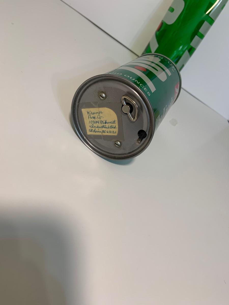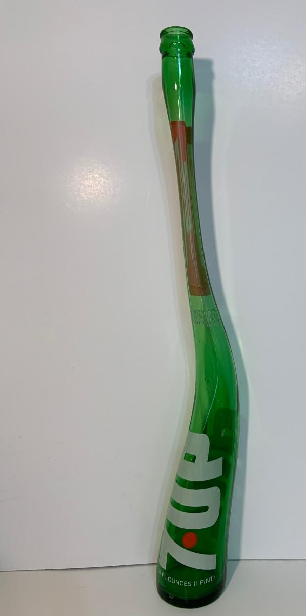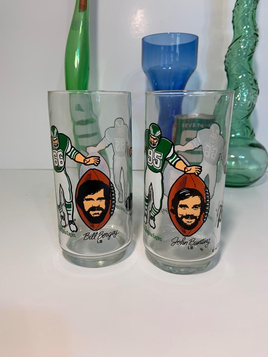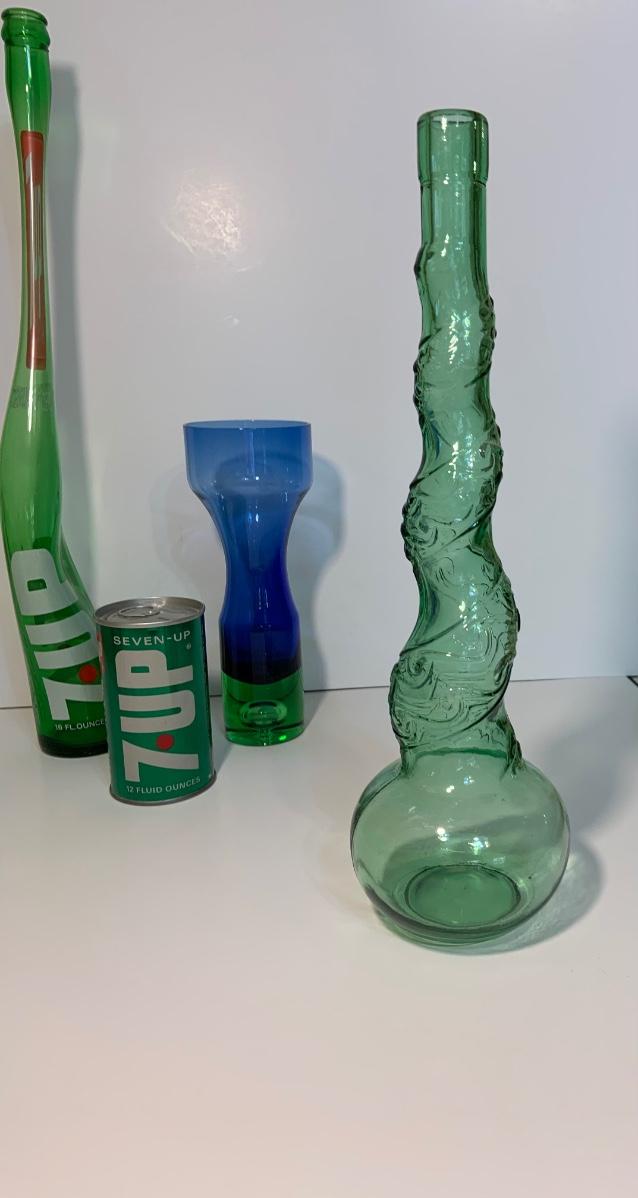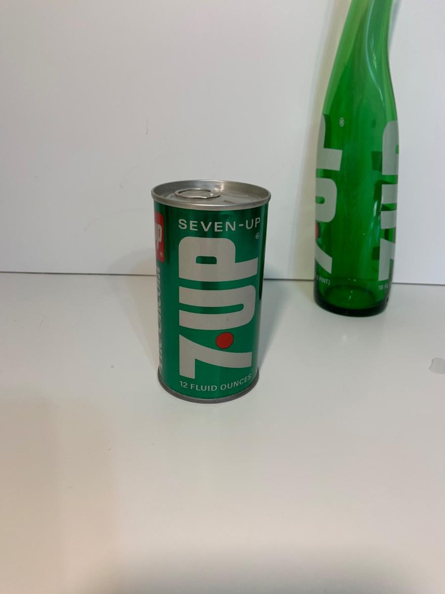 LOT::183G: Classic 7-UP Pulled Green Glass Bottle; a Faux 7-UP Can Music Box; Two 1980McDonalds Phildelphia Eagles Glasses, and more.