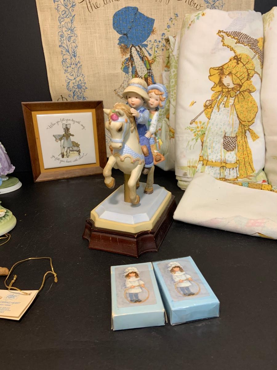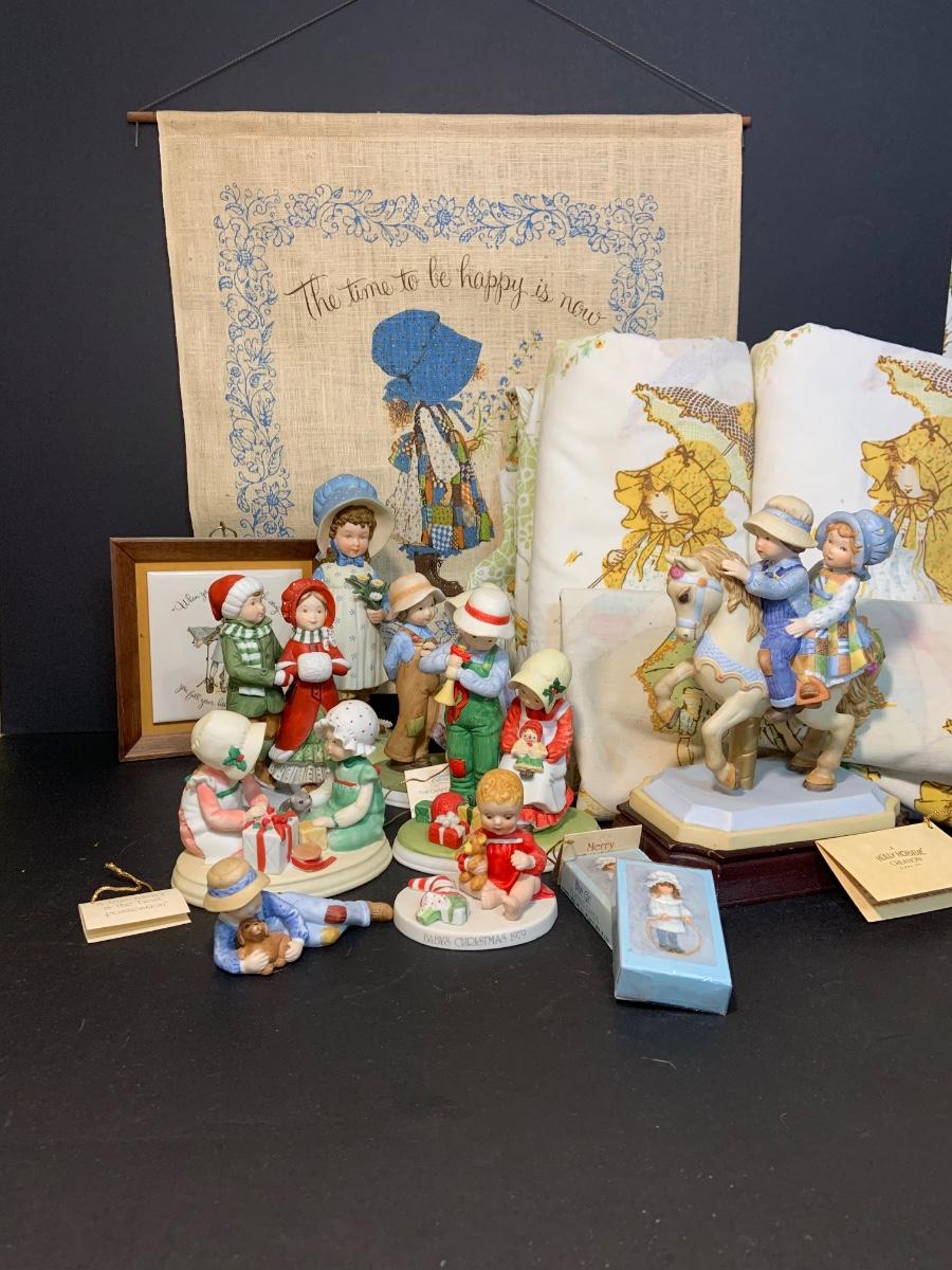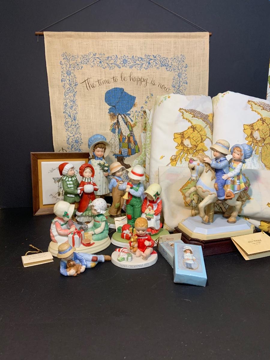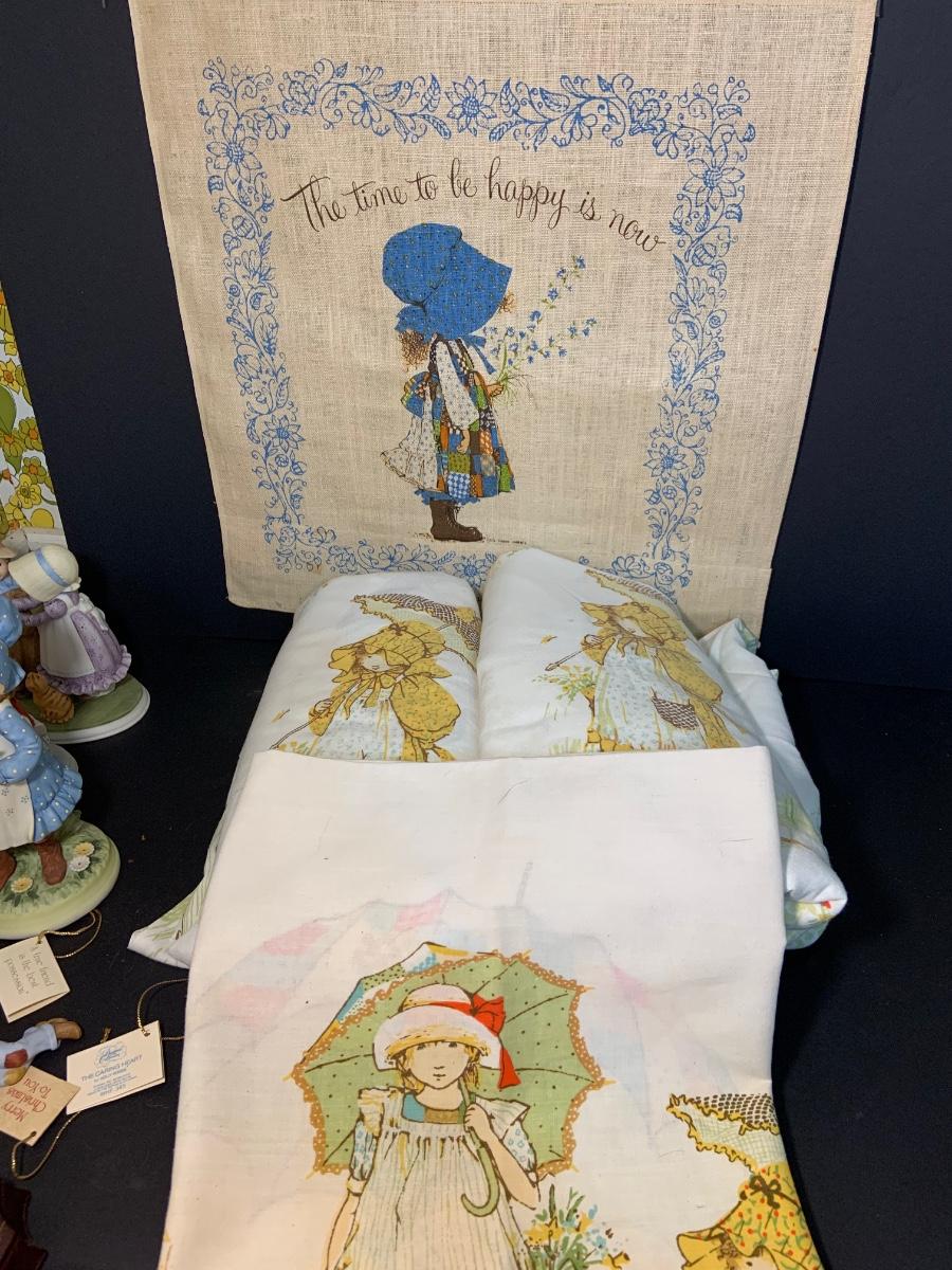 LOT:186G: Large Holly Hobby Collection Including Bed Sheets; Figurines - Holiday and Others; Playing Cards; a Wall Hanging and Plaque.