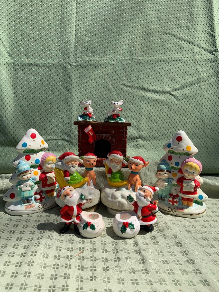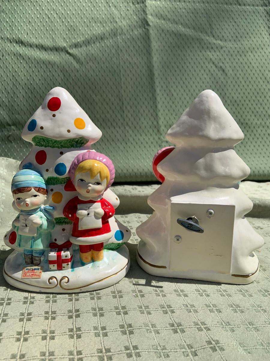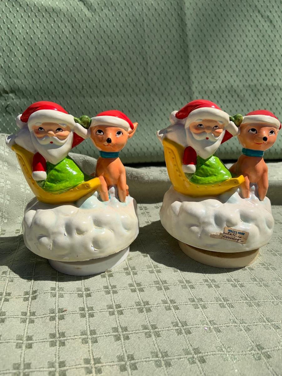 LOT:187G: Vintage Christmas Music Box Collection (4); Vintage 1958 Holt Howard Mice Napkin Holders and Santa Toothpick Holders & Fireplace