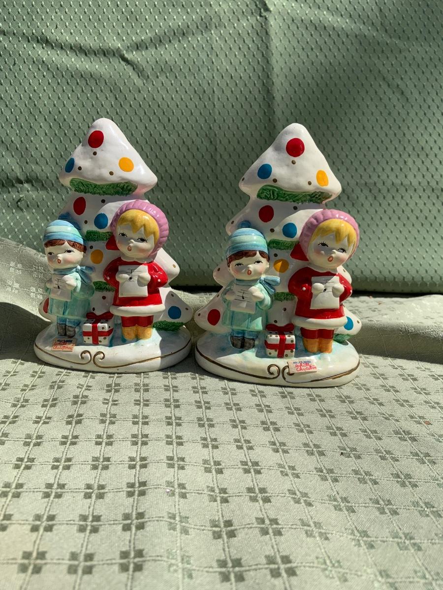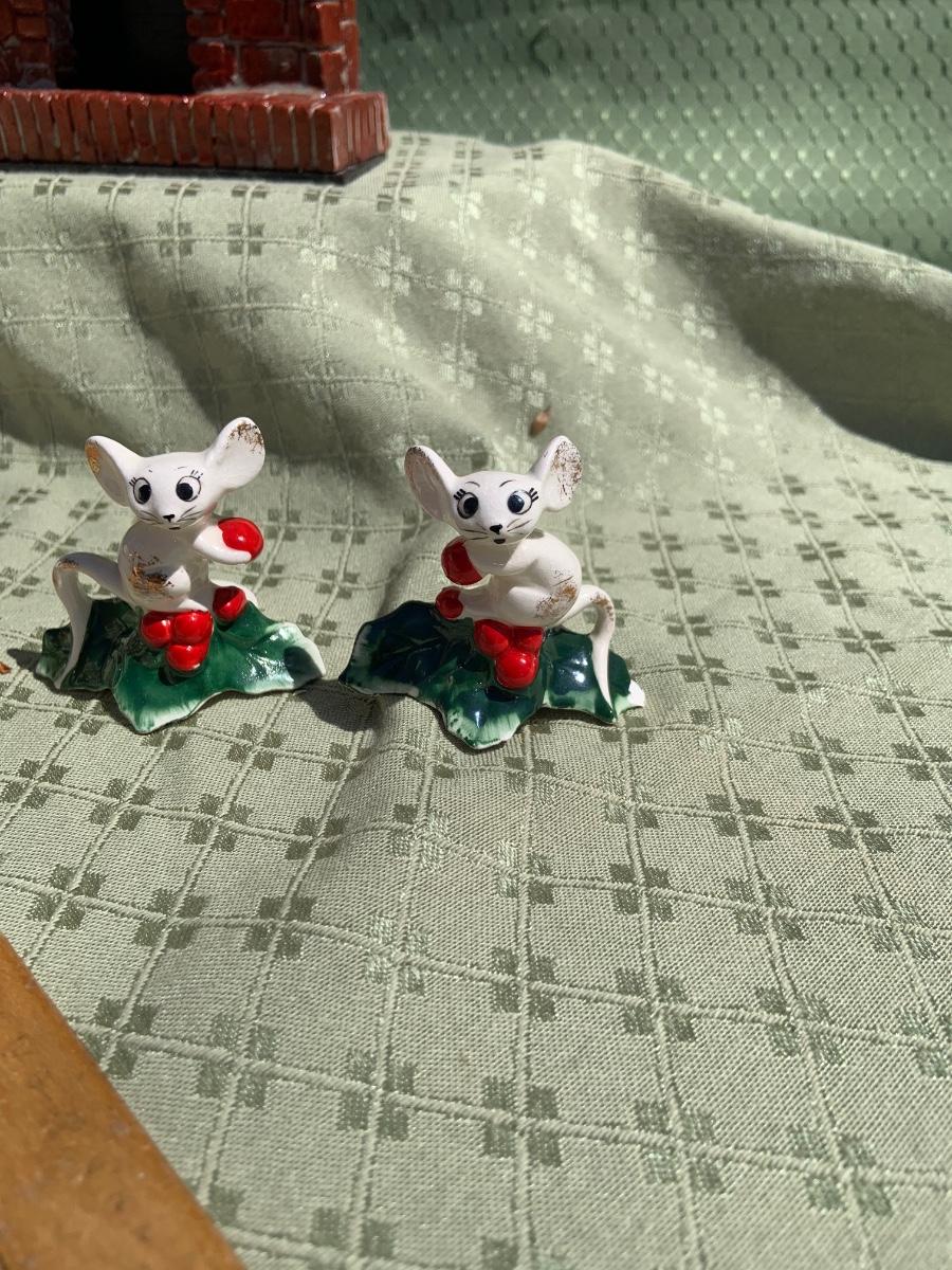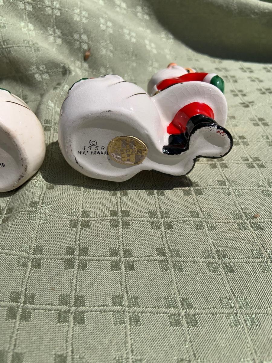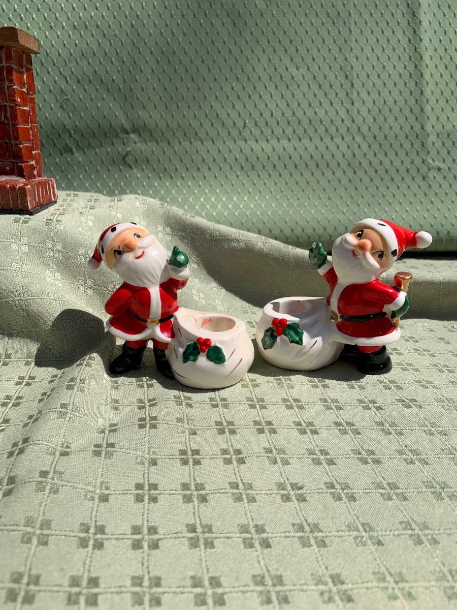 LOT:187G: Vintage Christmas Music Box Collection (4); Vintage 1958 Holt Howard Mice Napkin Holders and Santa Toothpick Holders & Fireplace