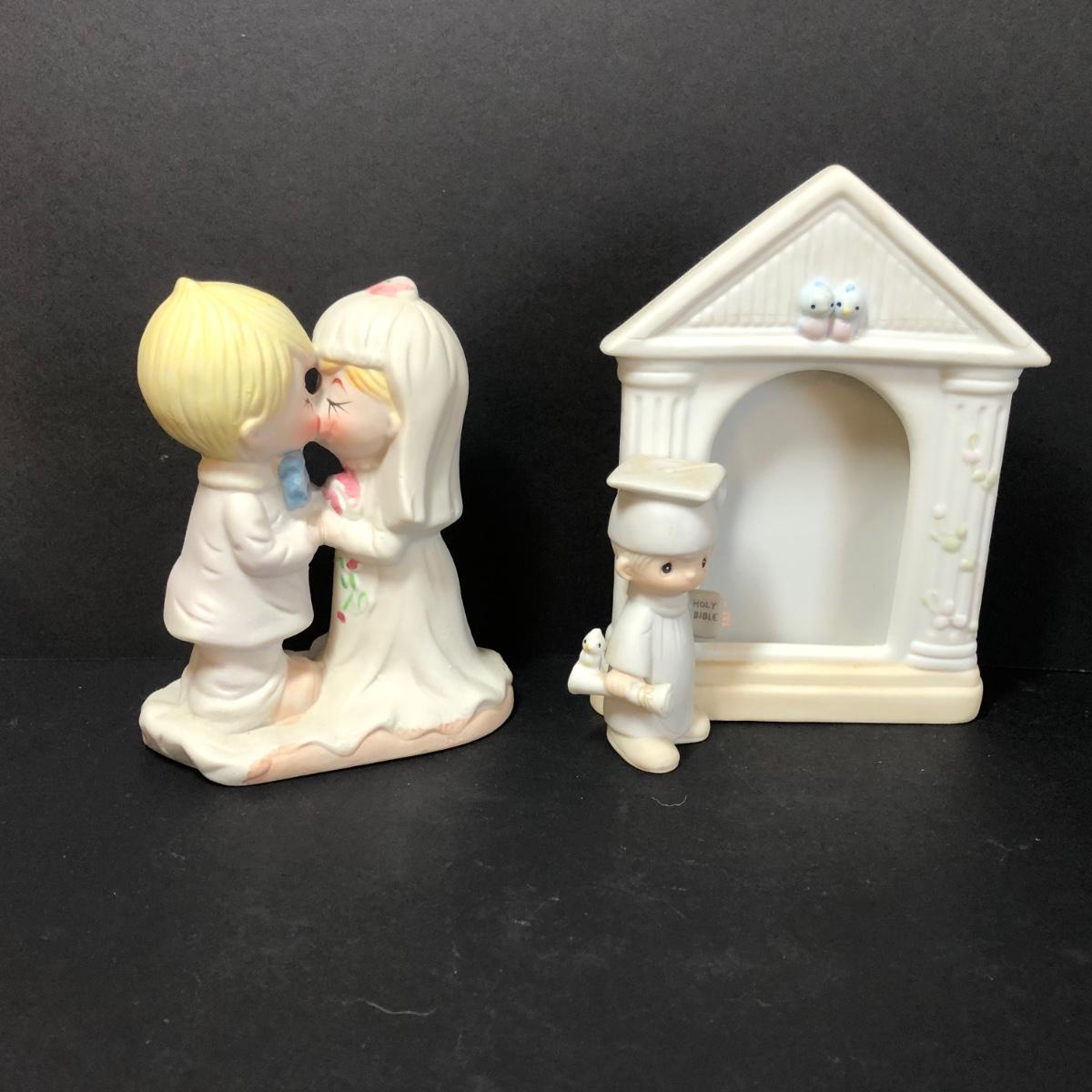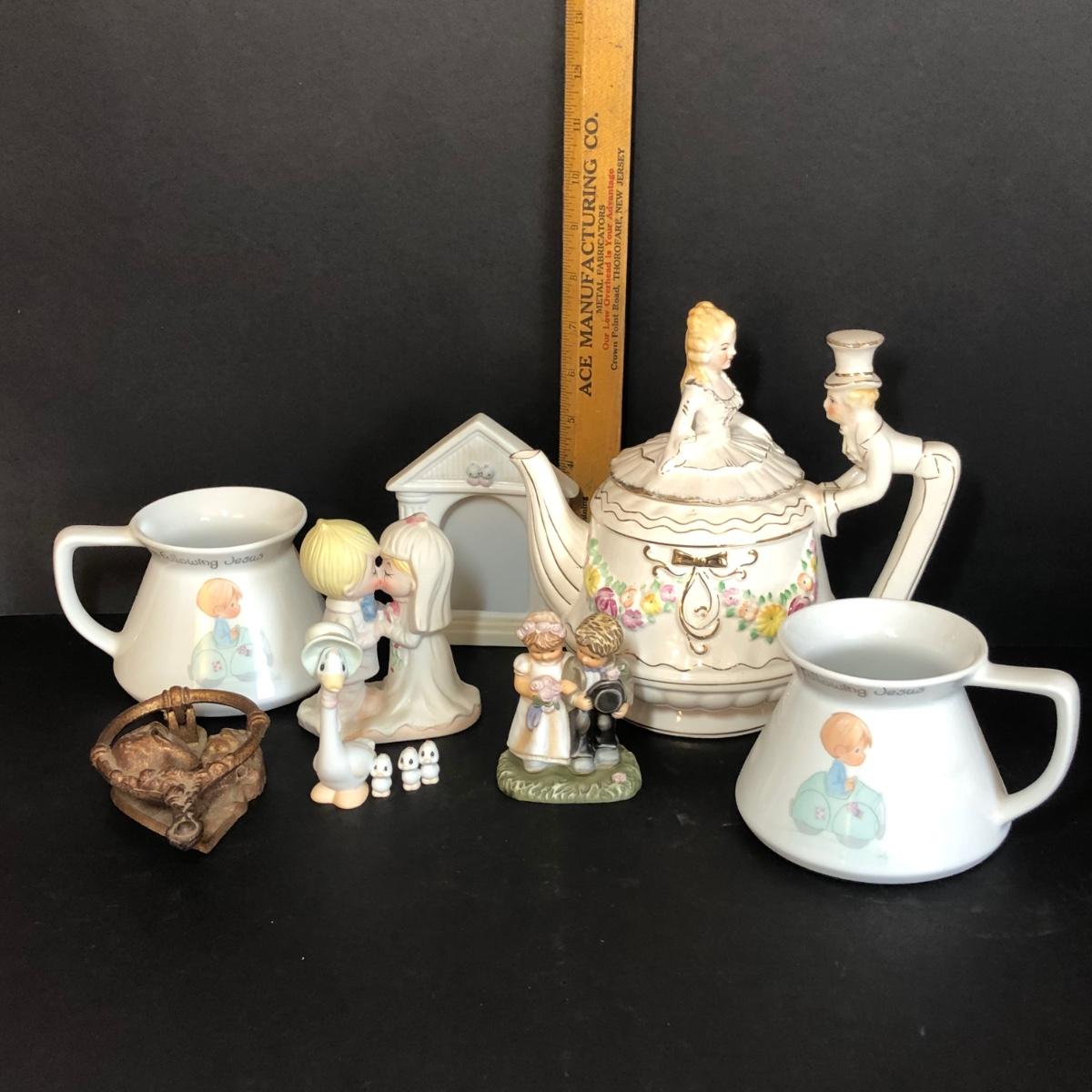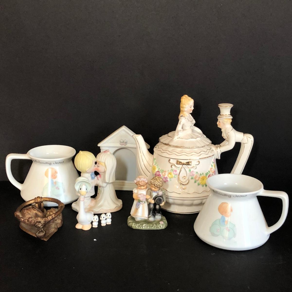 Includes an ornate music box tea pot, two "I'm Following Jesus" Precious moments mugs, three precious moments figurines, a kissing couple door knocker and a 2003 Goebel Figure named "One of Many Happy Anniversaries."