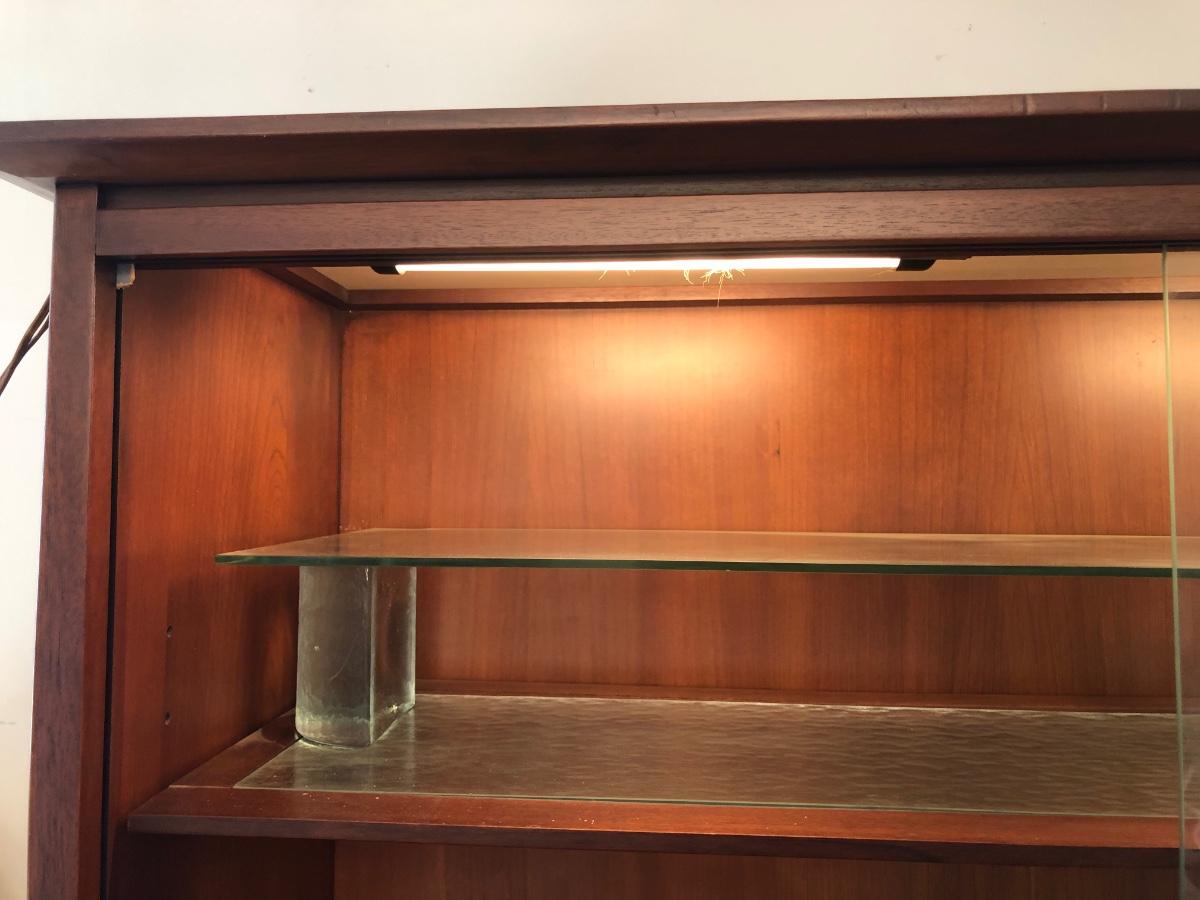 Piece designed by John Van Koert for Drexel. Lighting works. Includes extra glass shelf. Measures 50W x 20D x 72H.