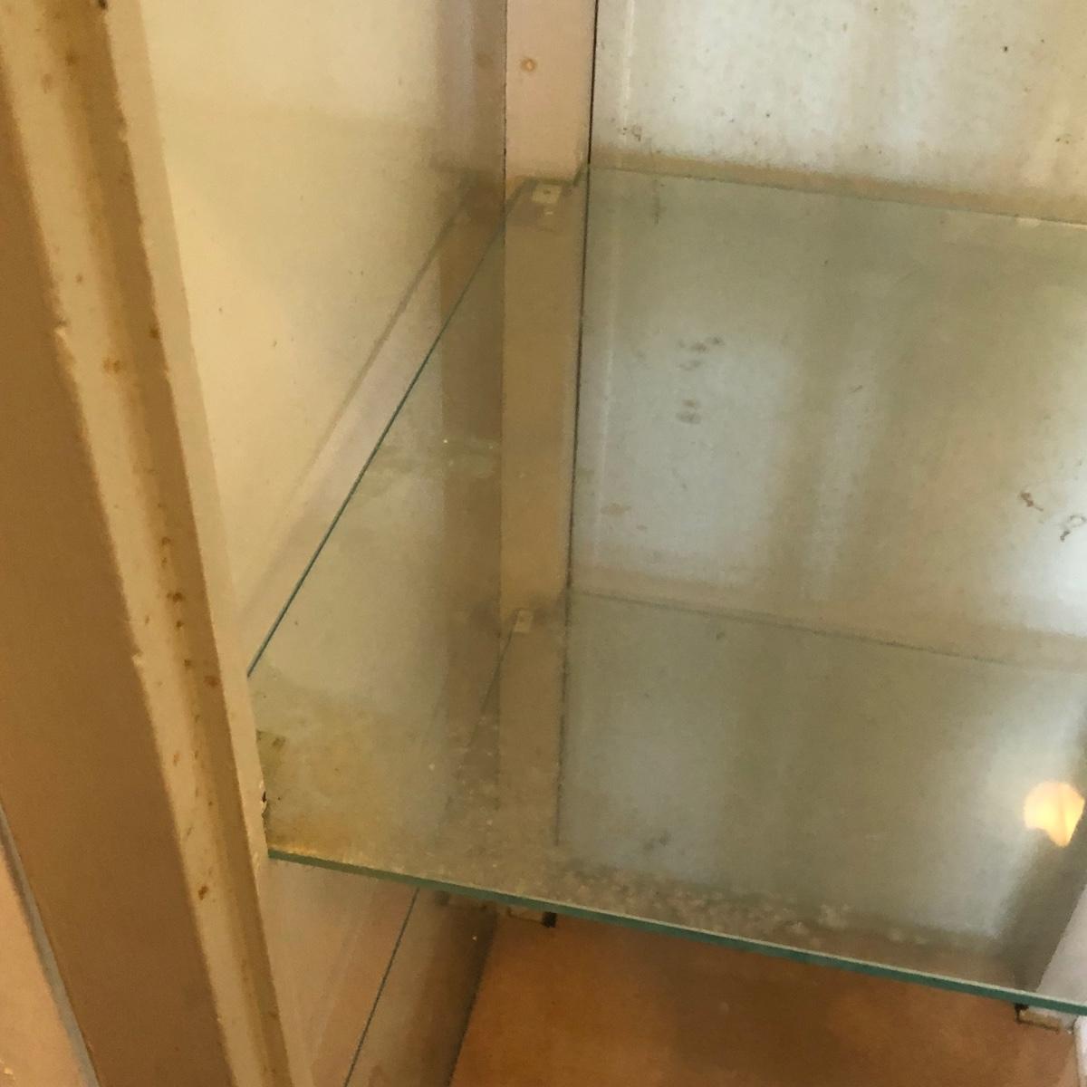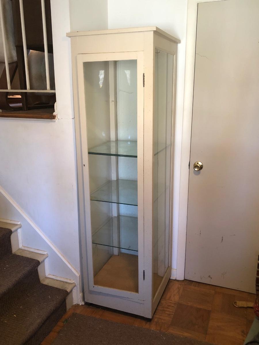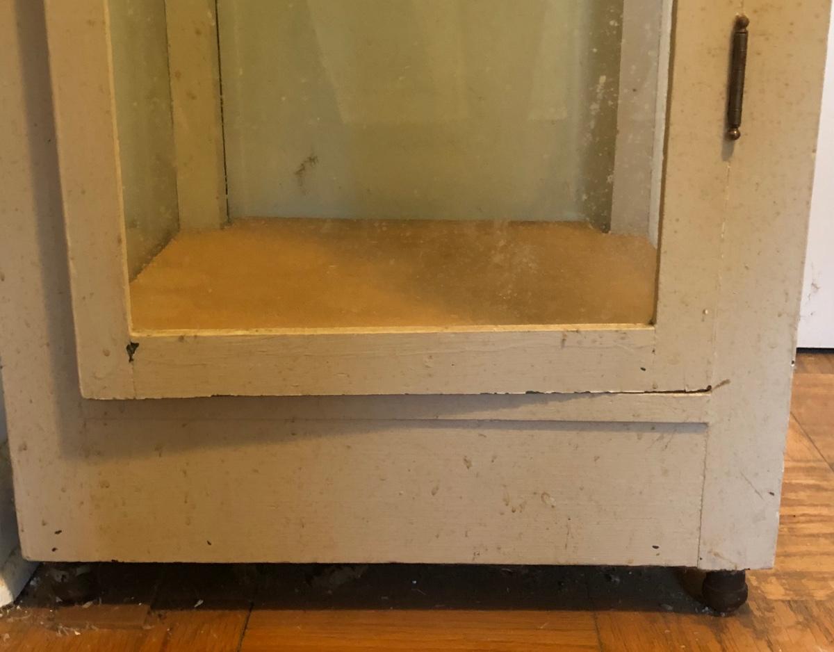 Cabinet needs some TLC and has a small crack in one of the glass panes (see photos). Measures 19W x 21H x 70D.