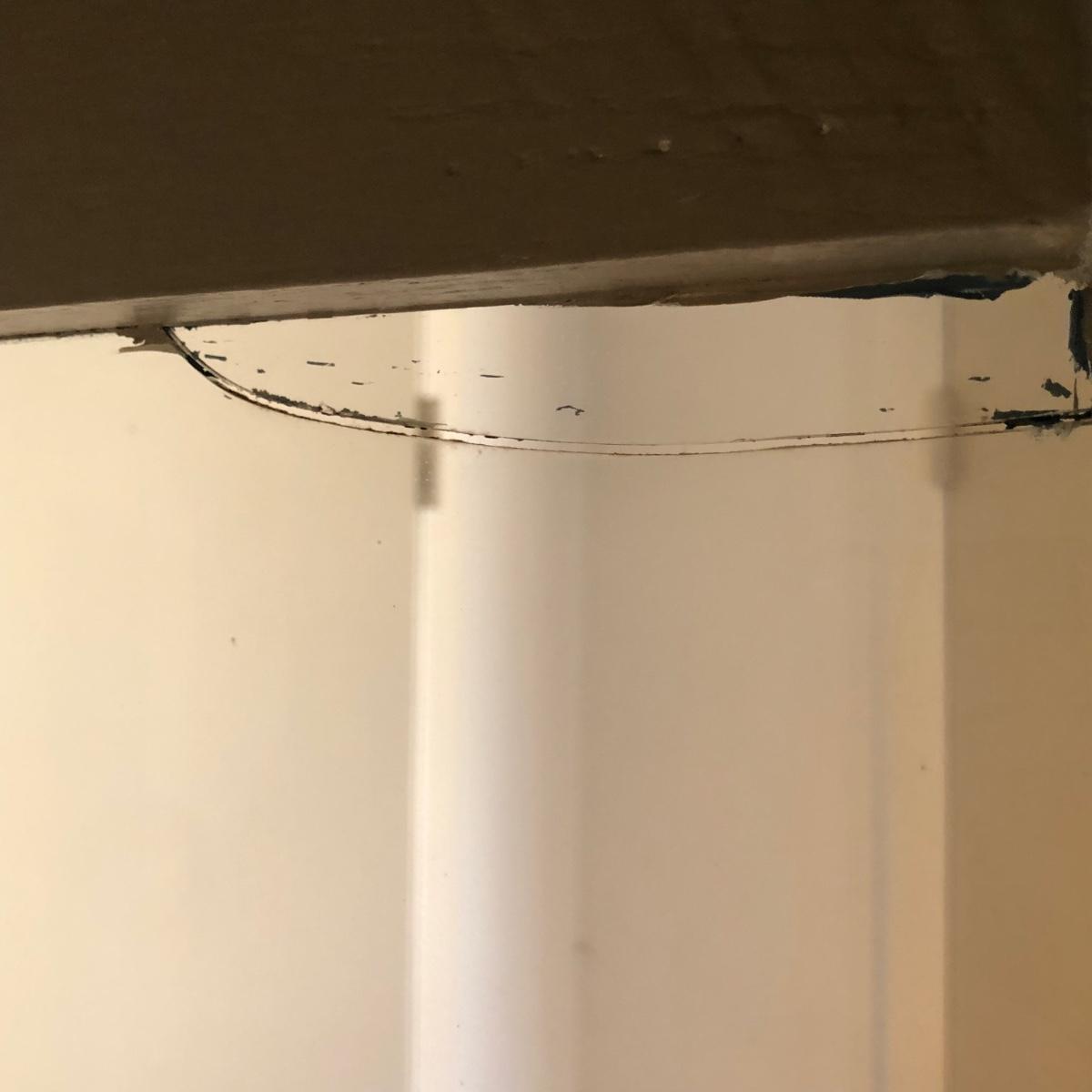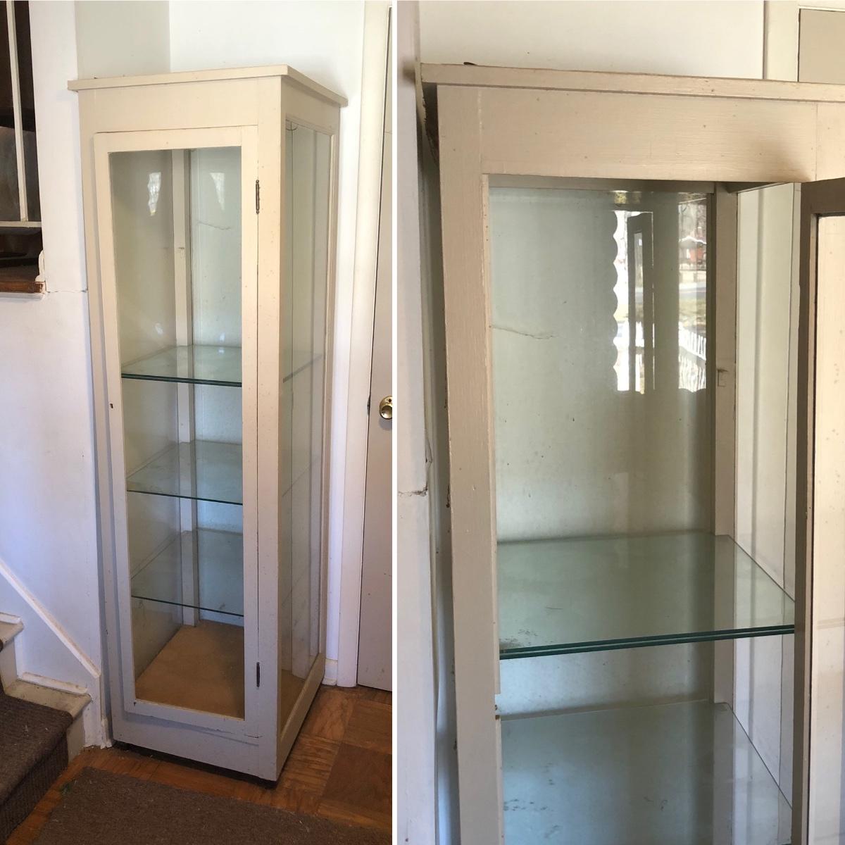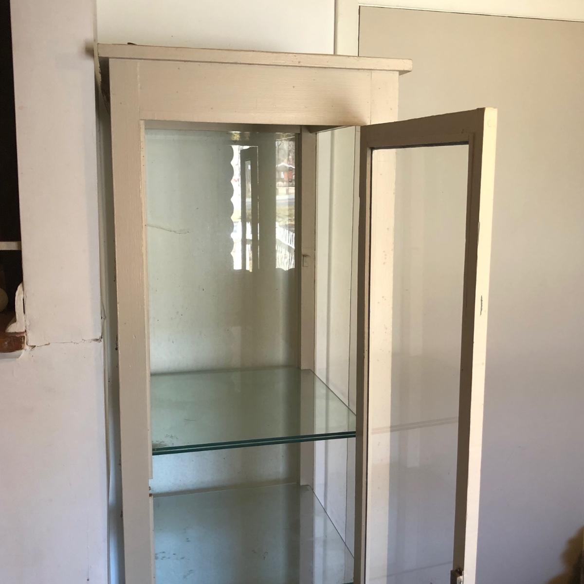 Cabinet needs some TLC and has a small crack in one of the glass panes (see photos). Measures 19W x 21H x 70D.