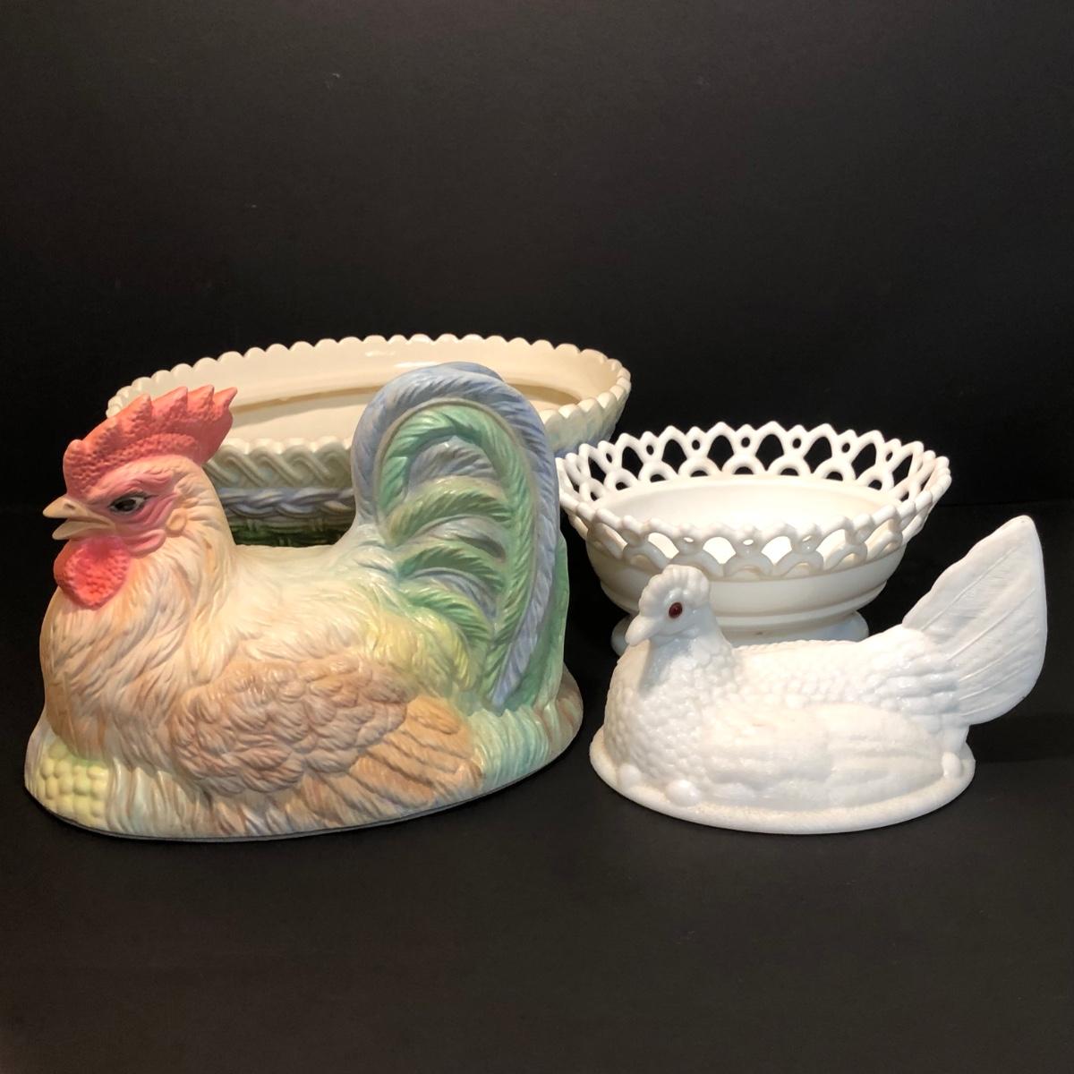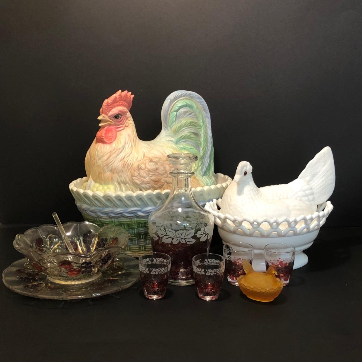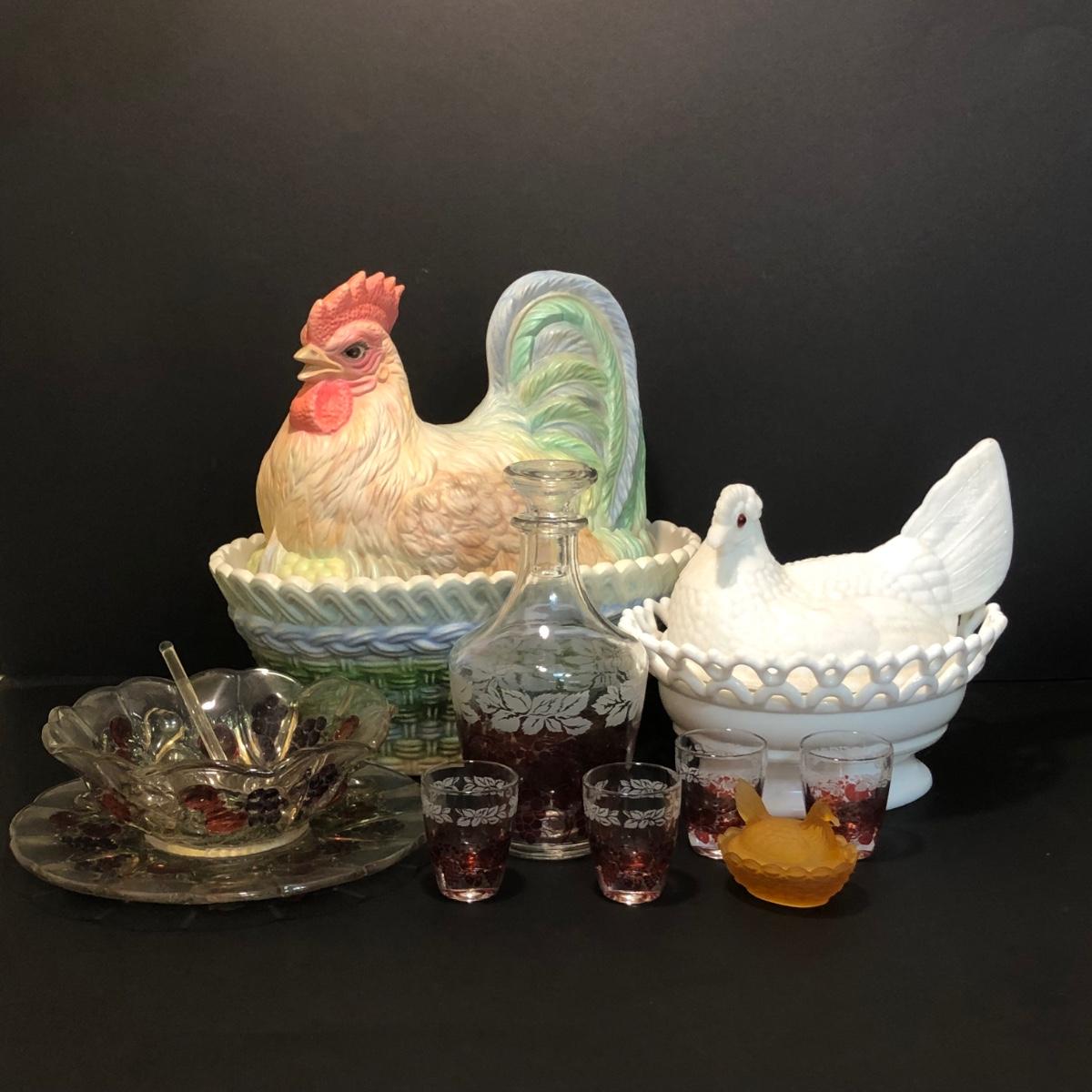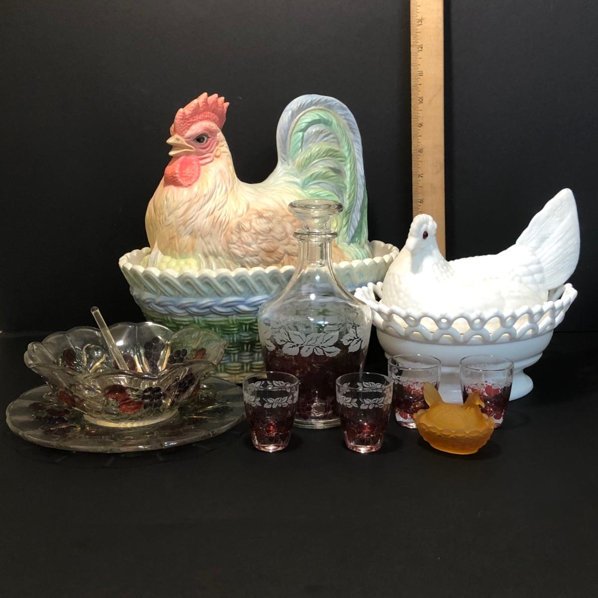 LOT 200M: Hens on Nests, Decanter w/ Matching Glasses & Small Fruit Decorated Dish w/ Matching Plate & Scalloped Spoon