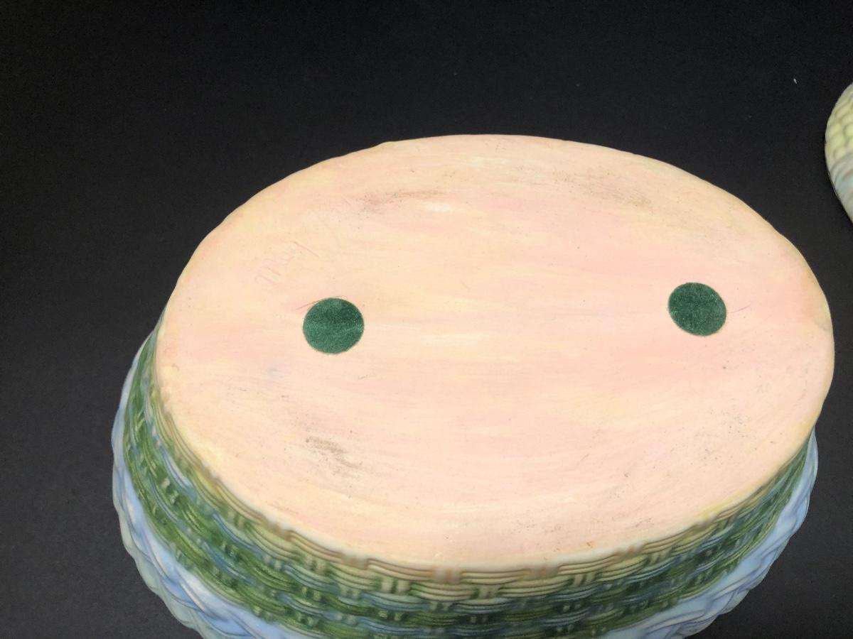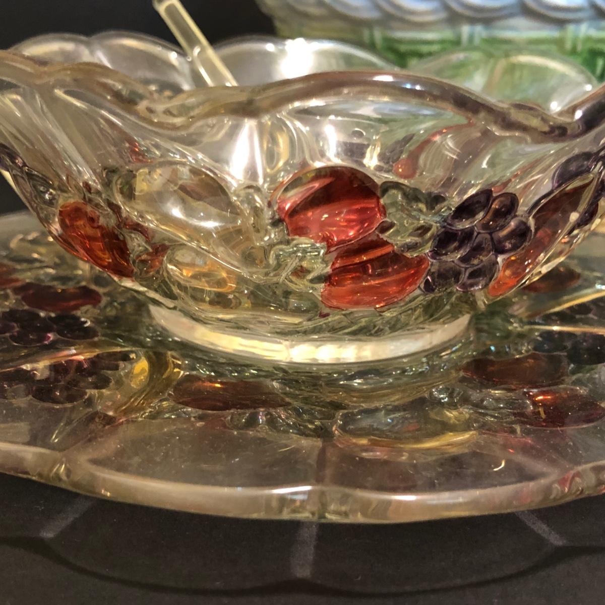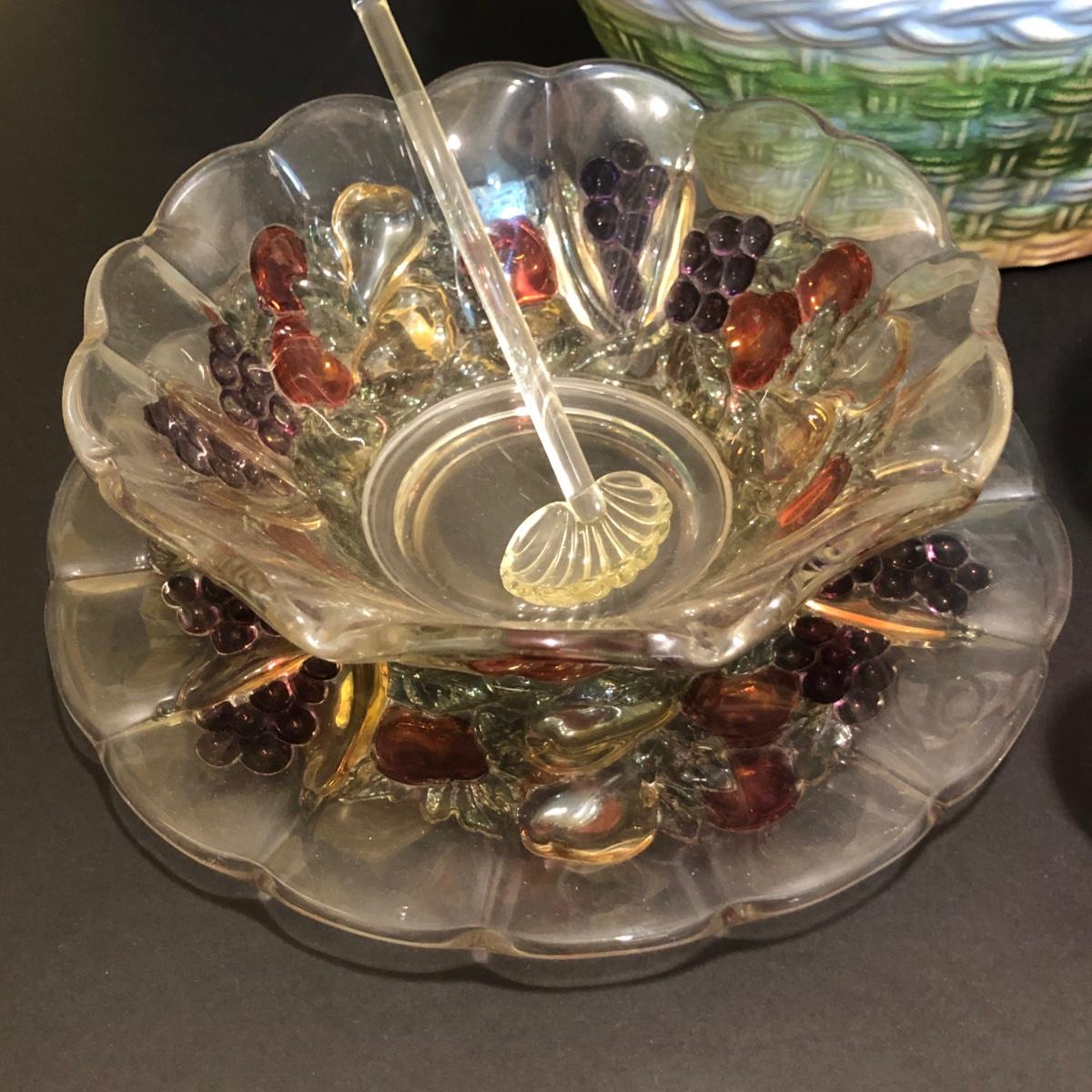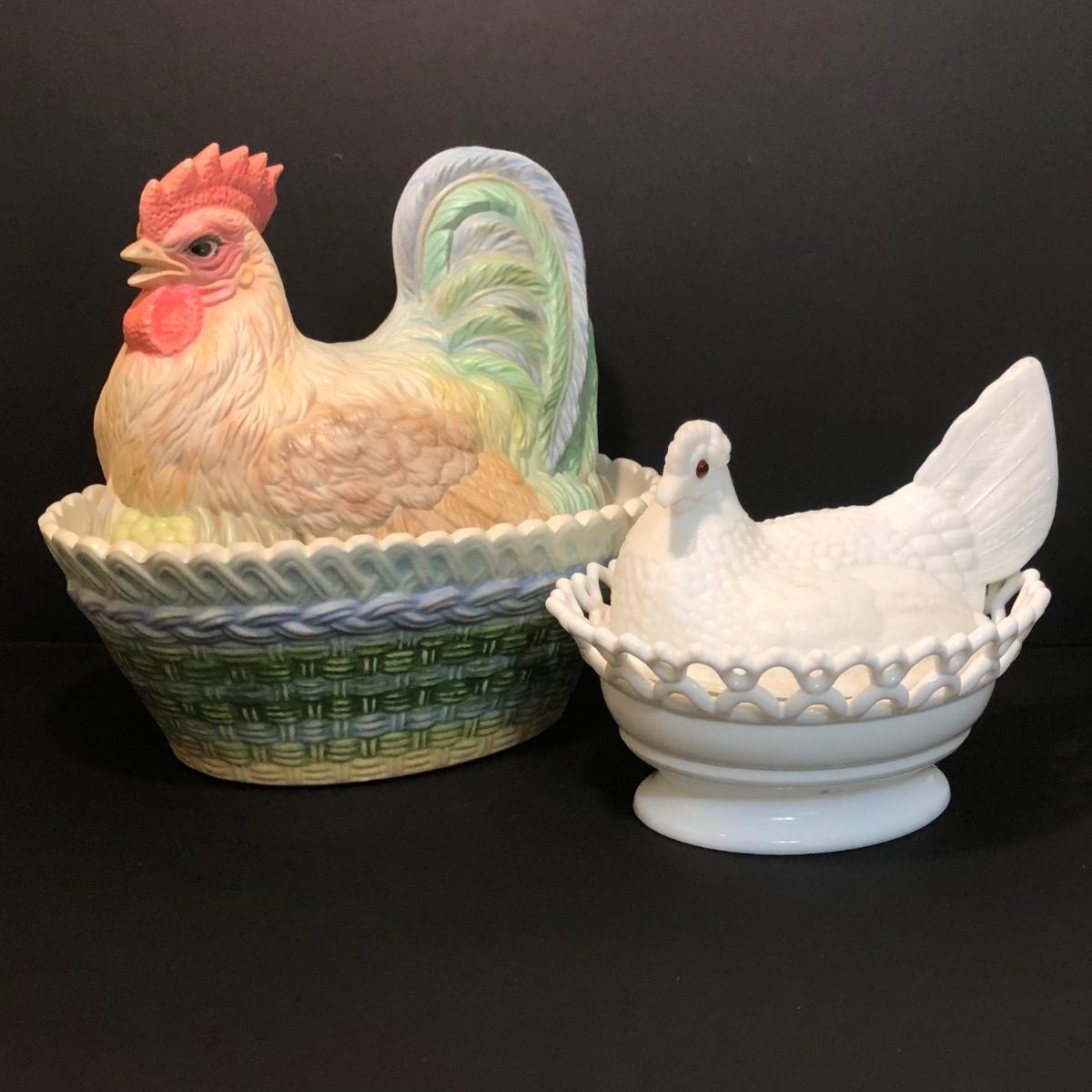 LOT 200M: Hens on Nests, Decanter w/ Matching Glasses & Small Fruit Decorated Dish w/ Matching Plate & Scalloped Spoon