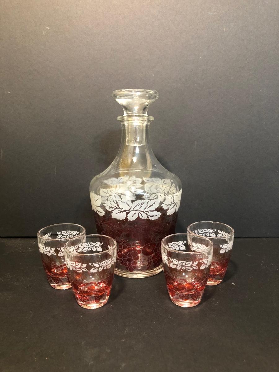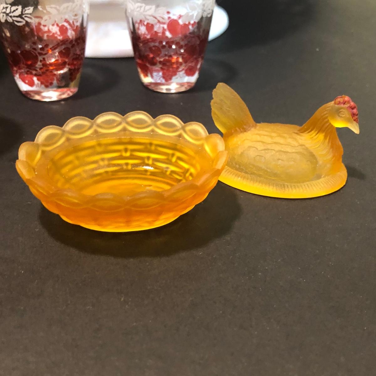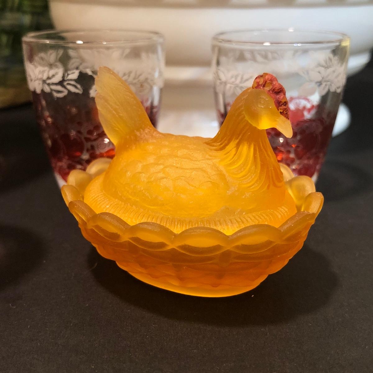 Includes three variously sized hens on nests that are each two pieces. The decanter has an etched design and four matching shot glasses.