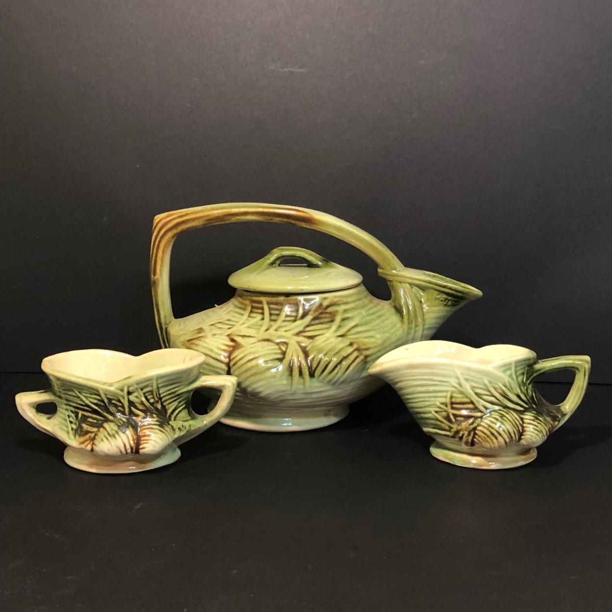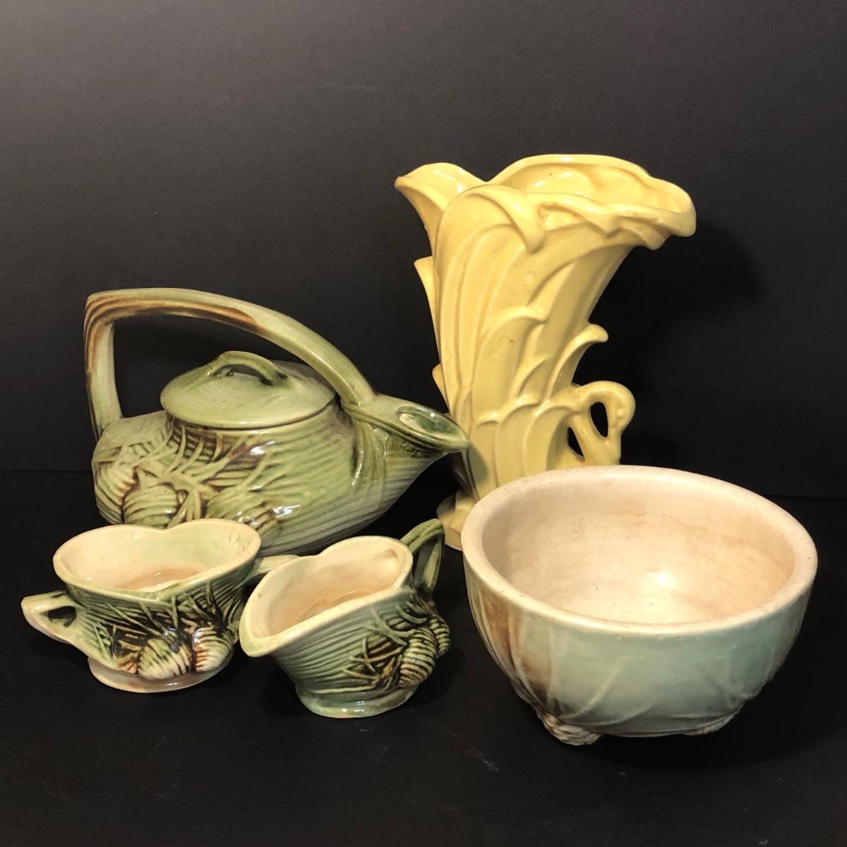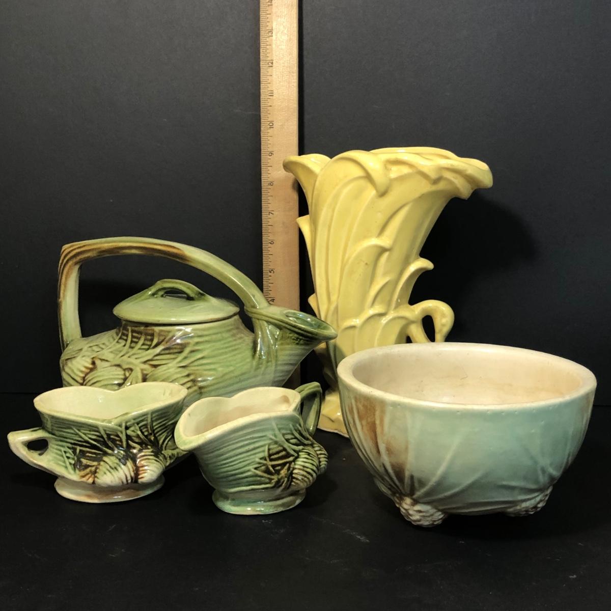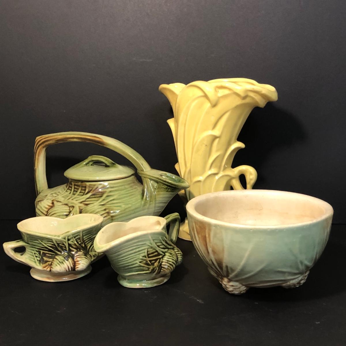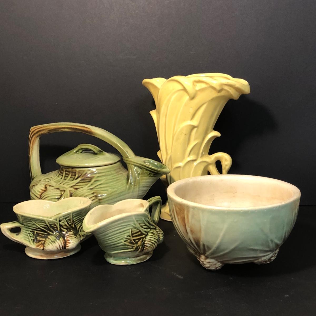 Includes a yellow swan vase, pinecone decorated bowl and green pinecone tea set. Sugar bowl does not have a lid.