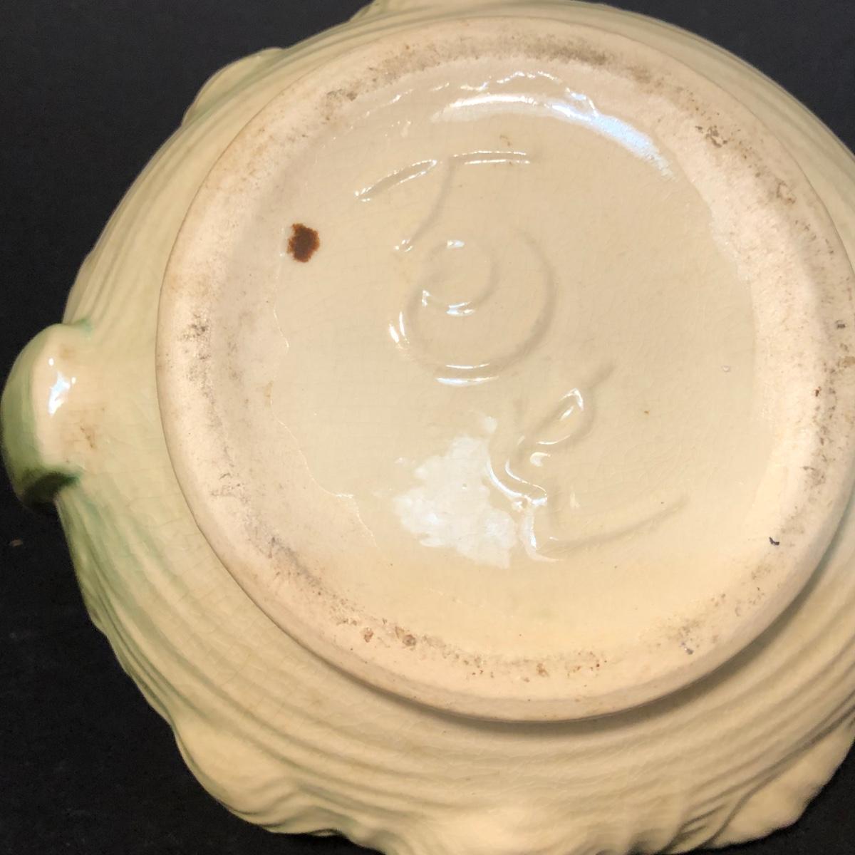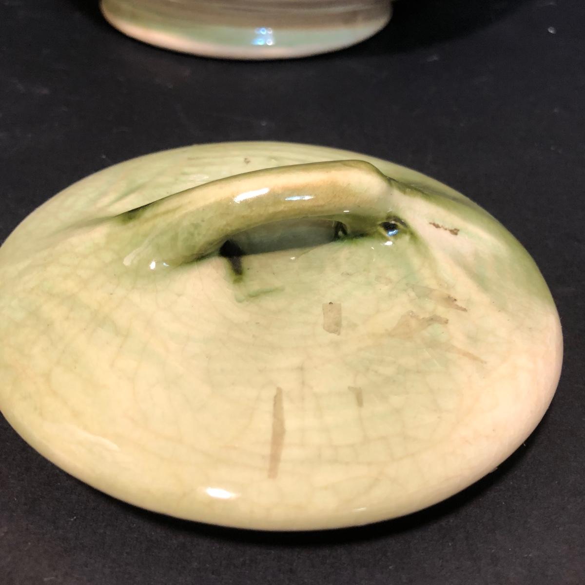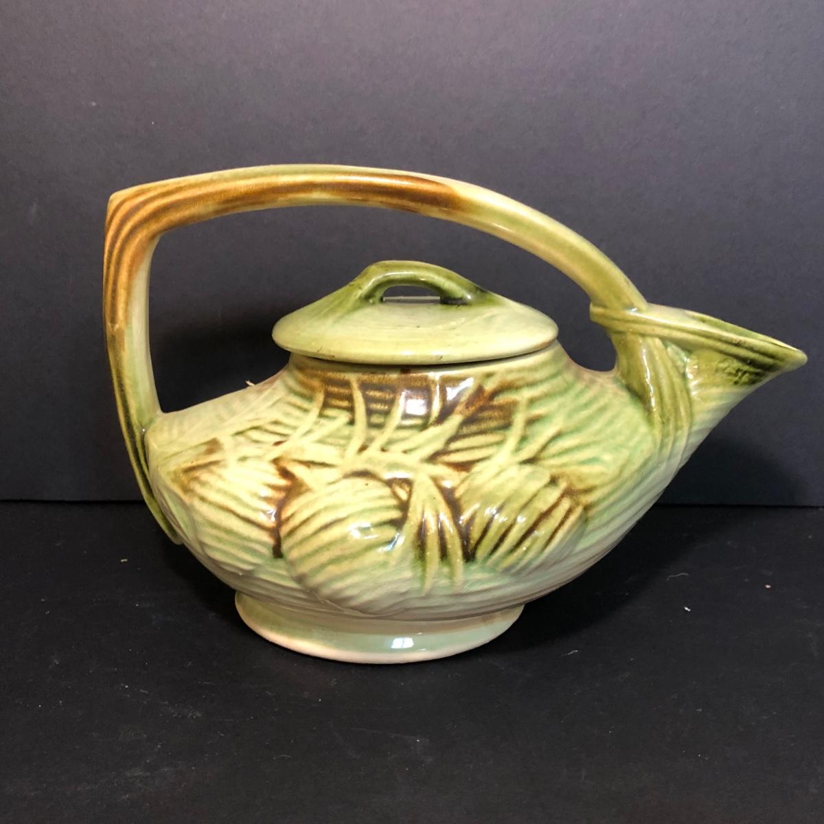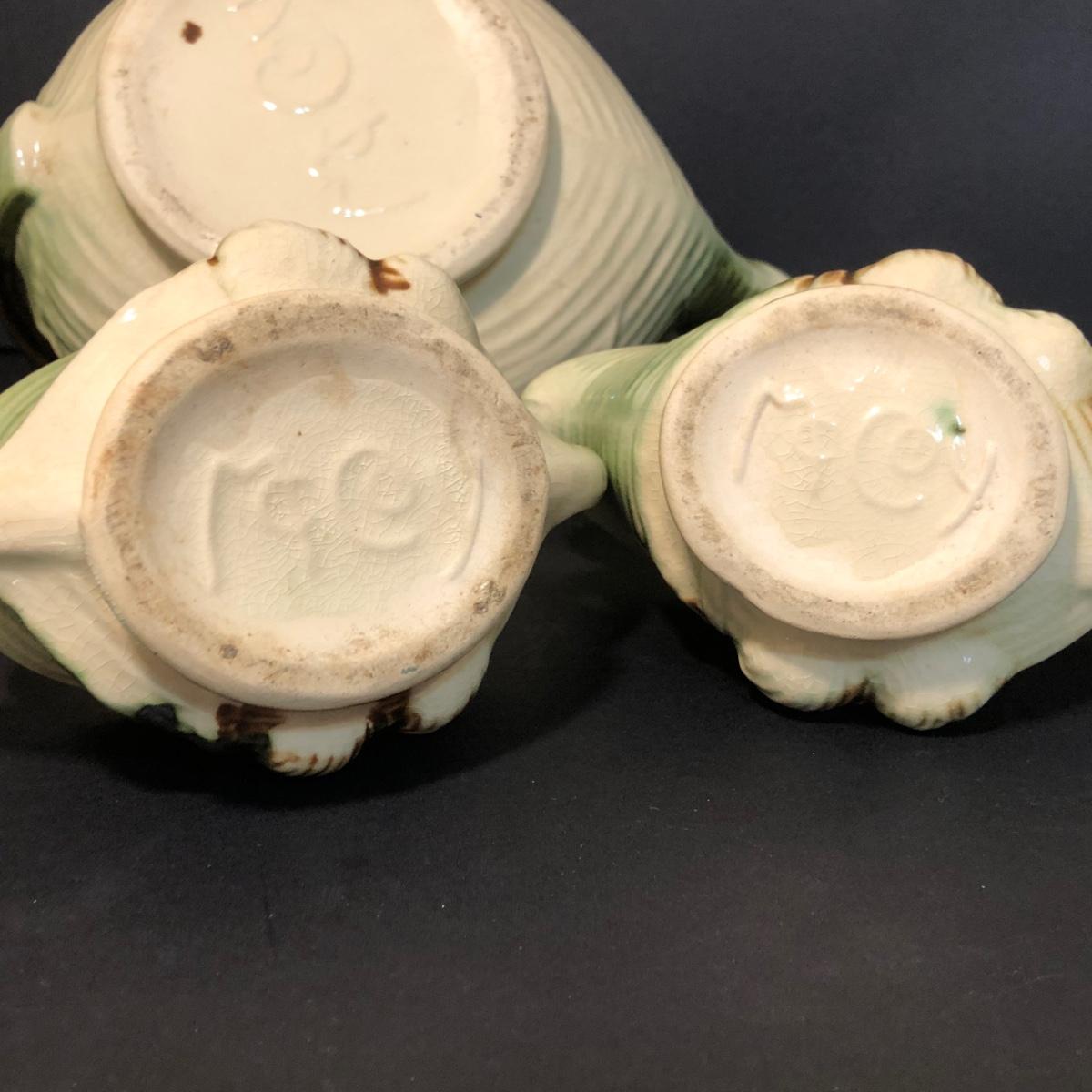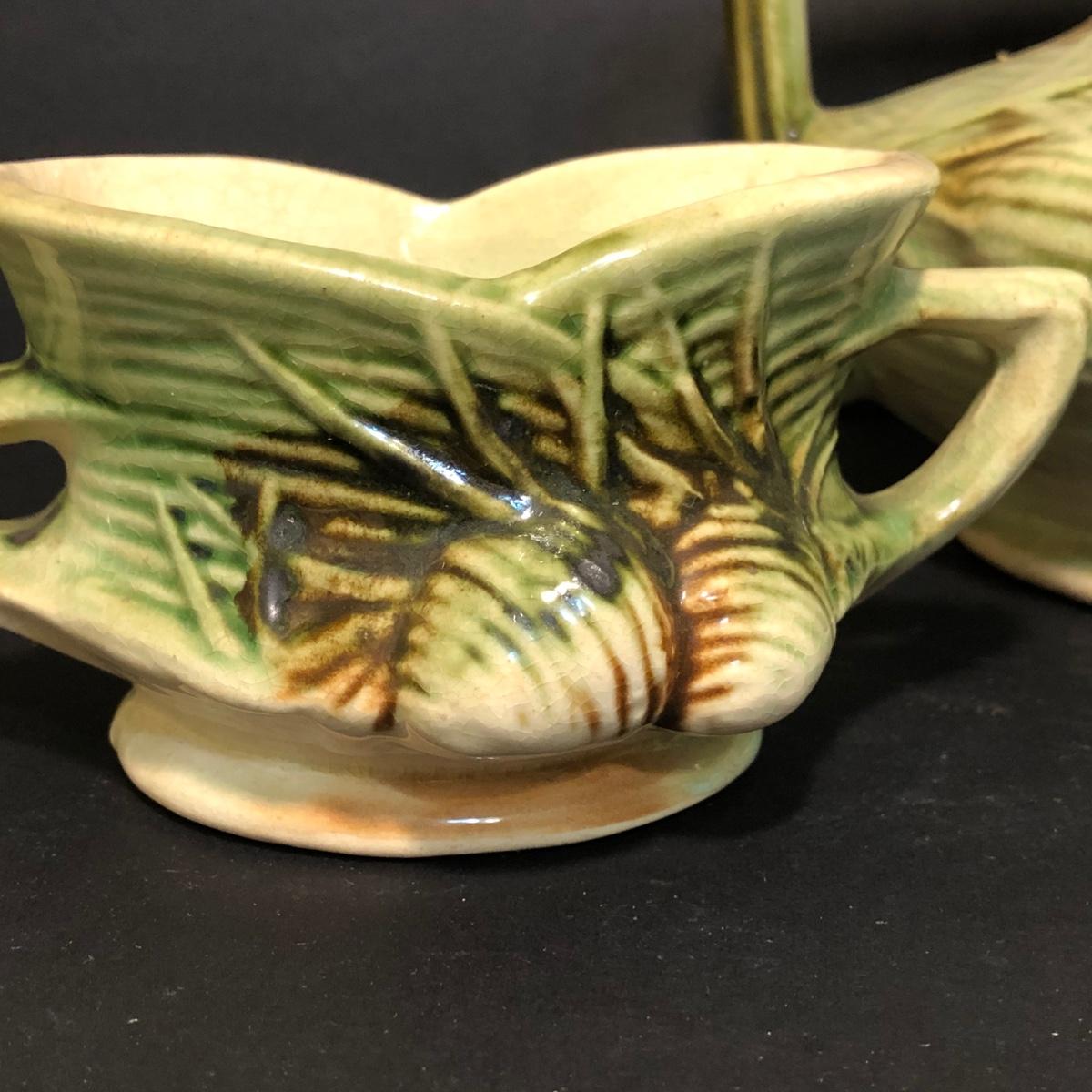 Includes a yellow swan vase, pinecone decorated bowl and green pinecone tea set. Sugar bowl does not have a lid.